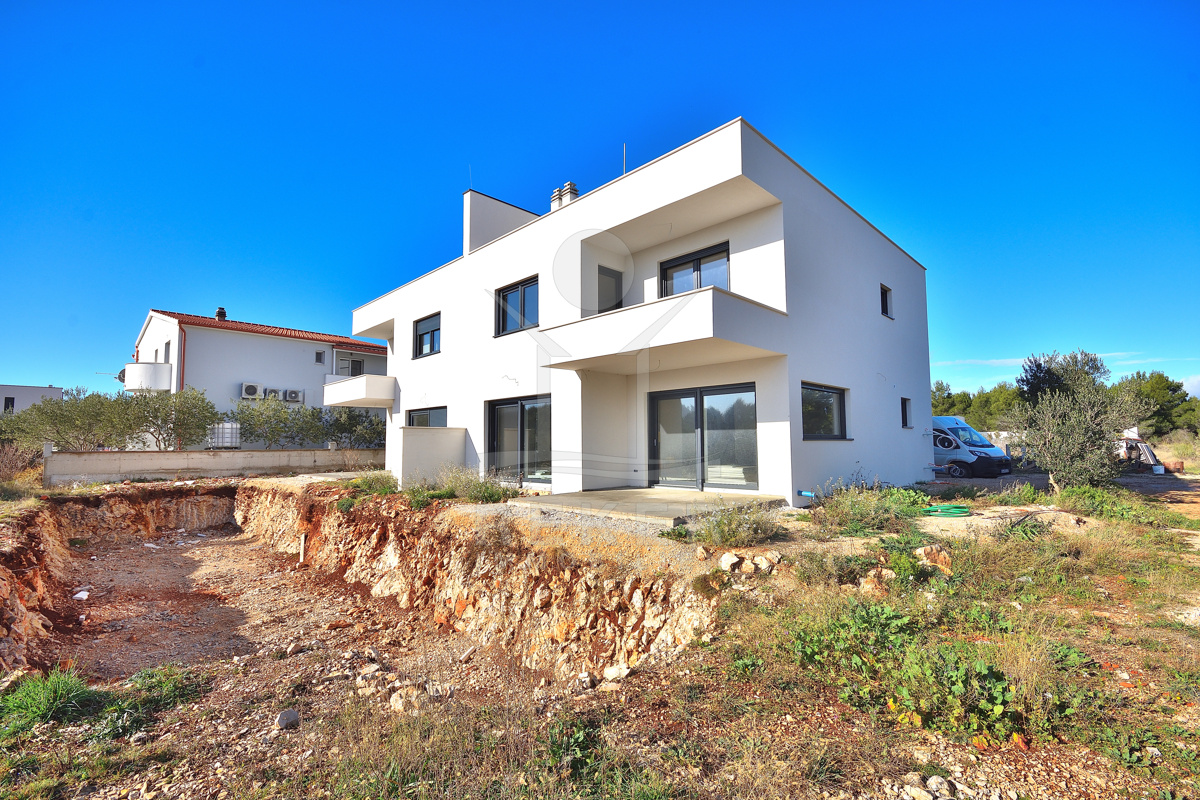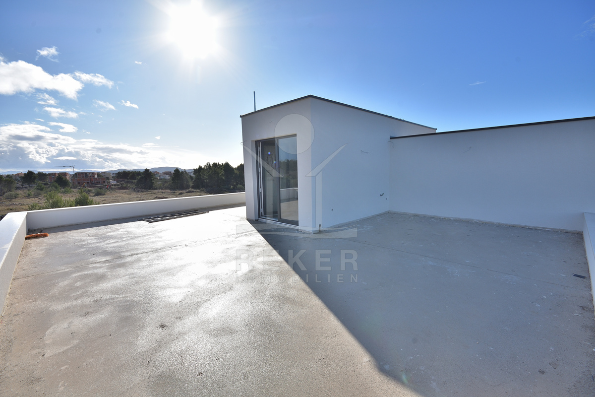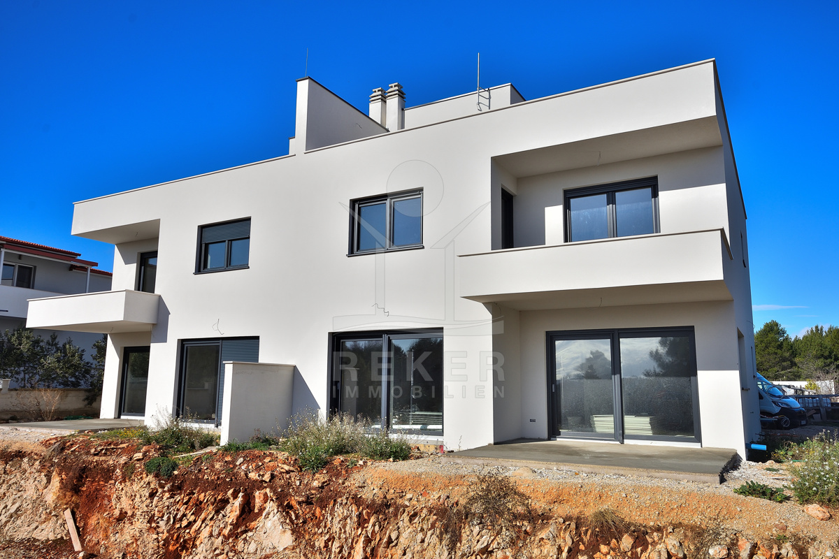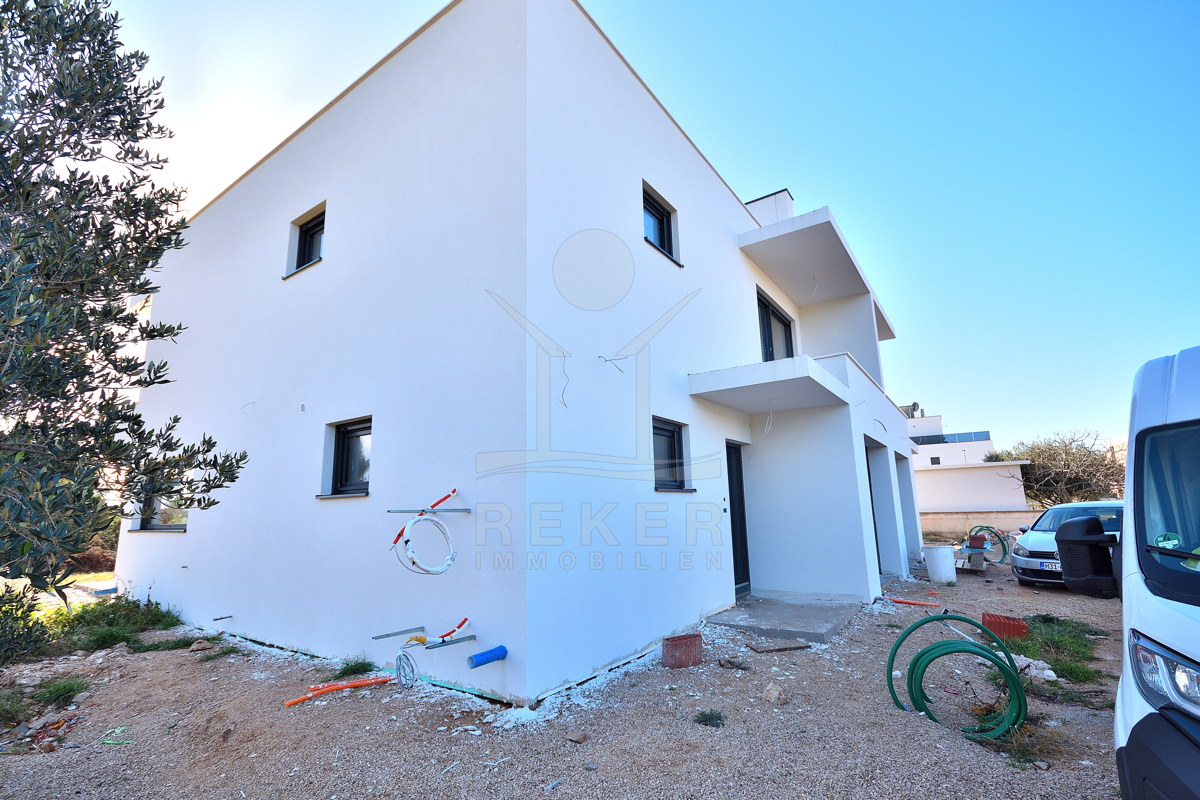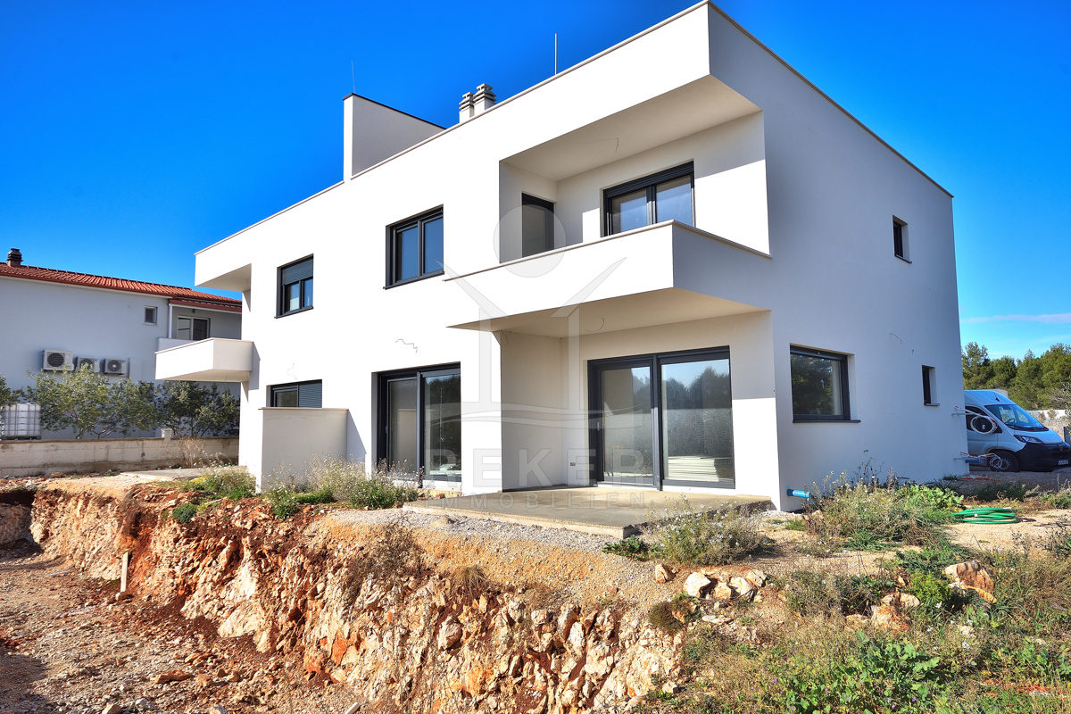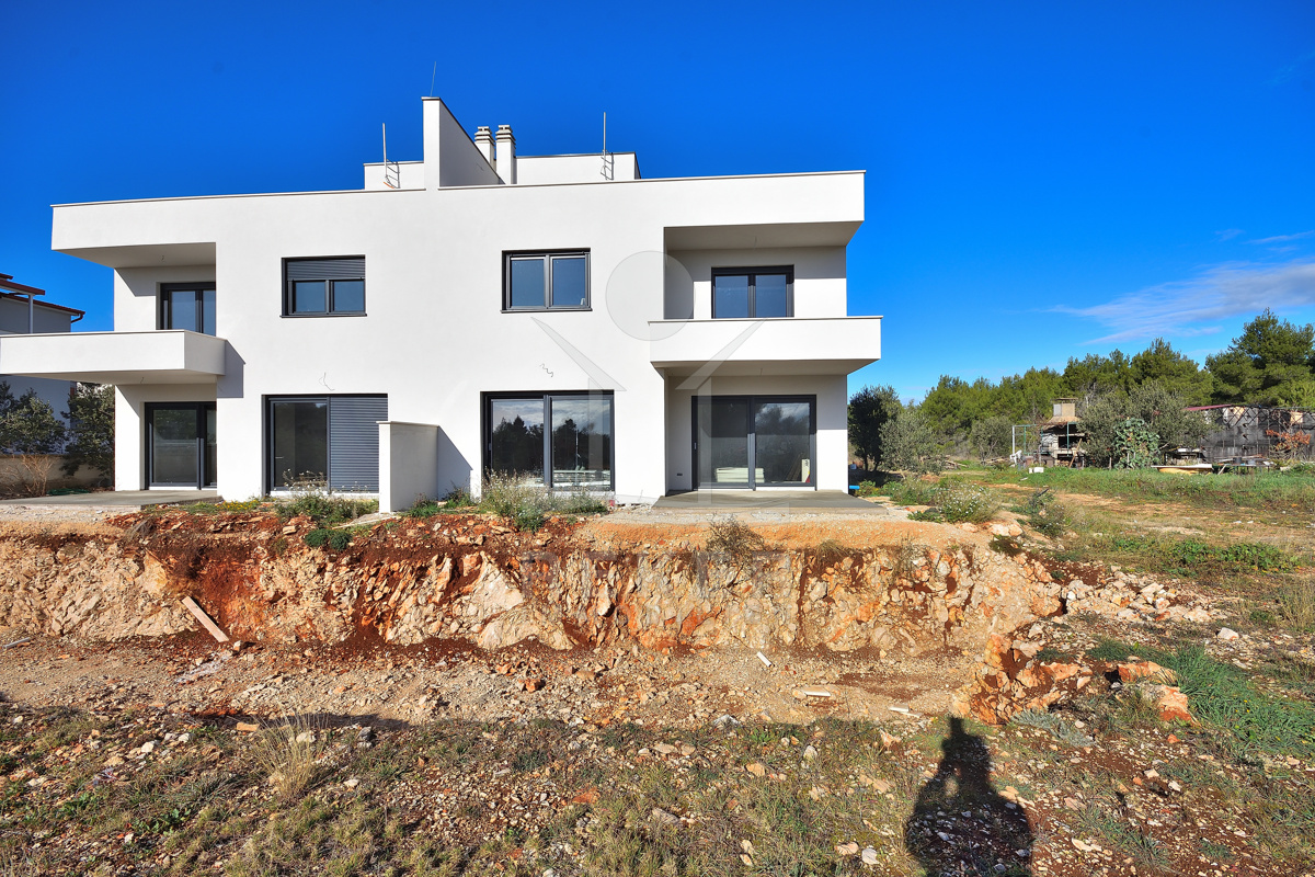 Diese moderne Doppelhaushälfte befindet sich in ruhiger Wohnlage von Vodice. Zum Meer sind es etwa 500 m, das Stadtzentrum erreichen Sie nach rund 1.000 m. Die Nachbarschaft ist von zeitgenössischen Einfamilienhäusern und Villen geprägt. Eine Umgebung, die Ruhe und Alltagstauglichkeit verbindet. Zum Haus gehören eine Garage mit 22,40 m² sowie ein gepflasterter Stellplatz auf dem Grundstück. Parken ist damit komfortabel gelöst.