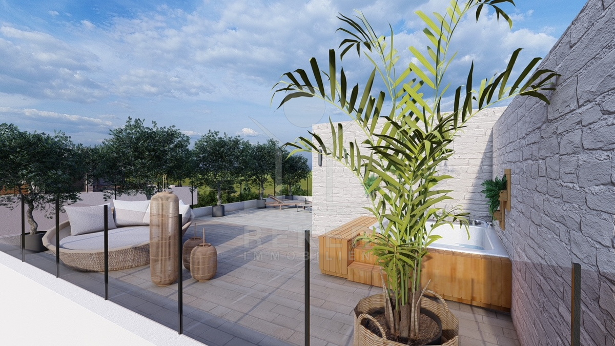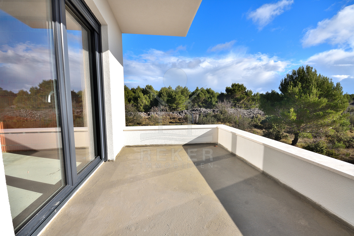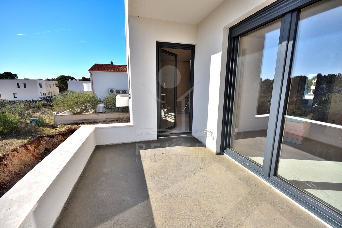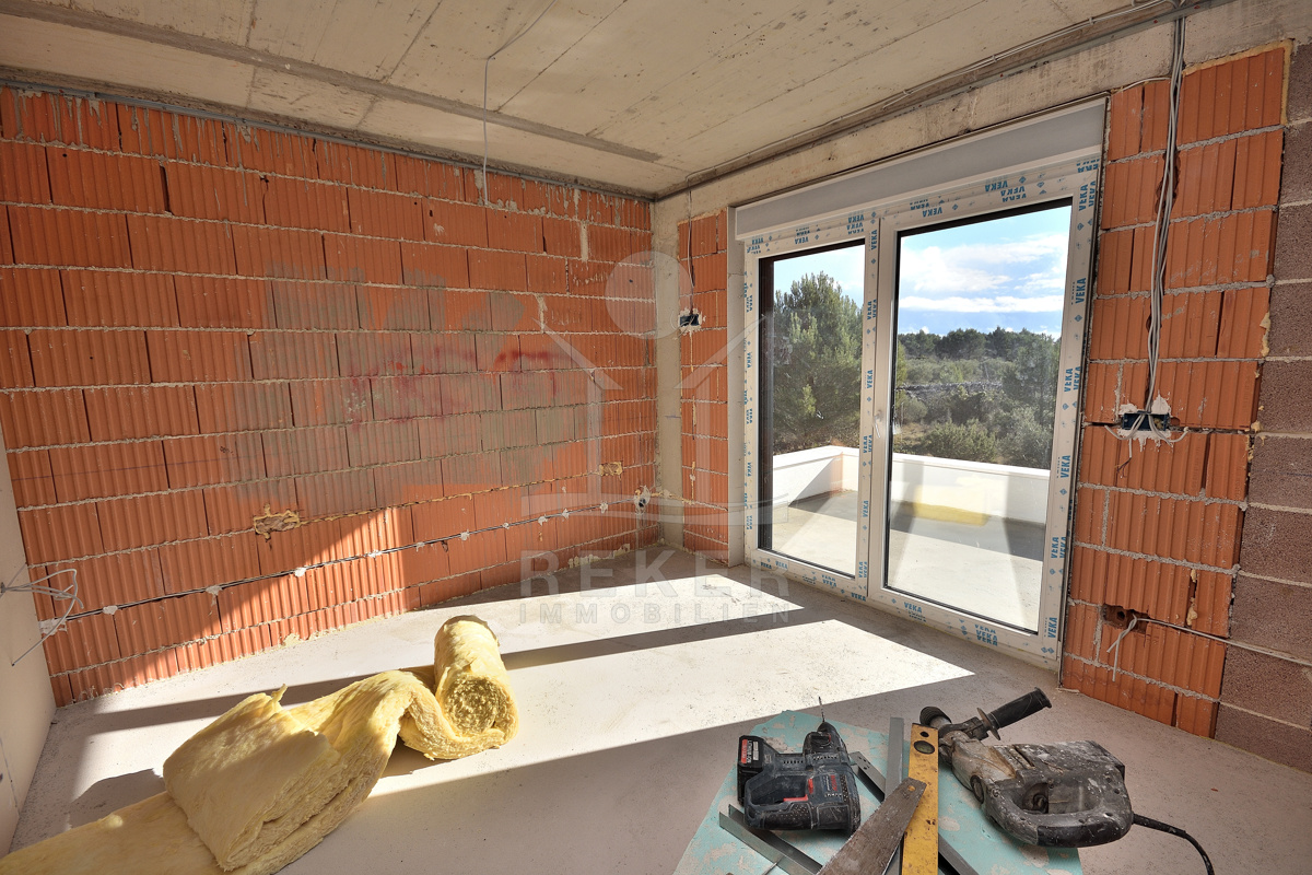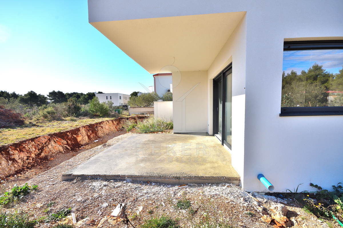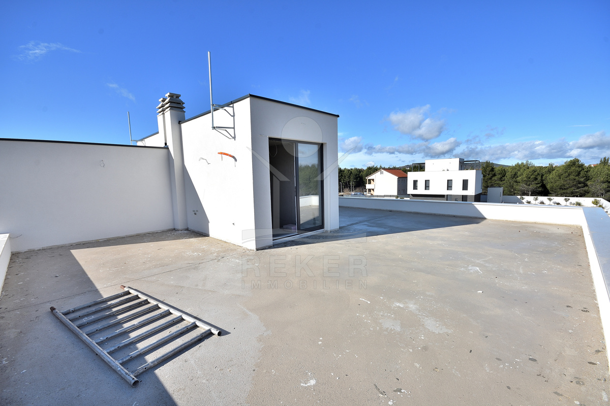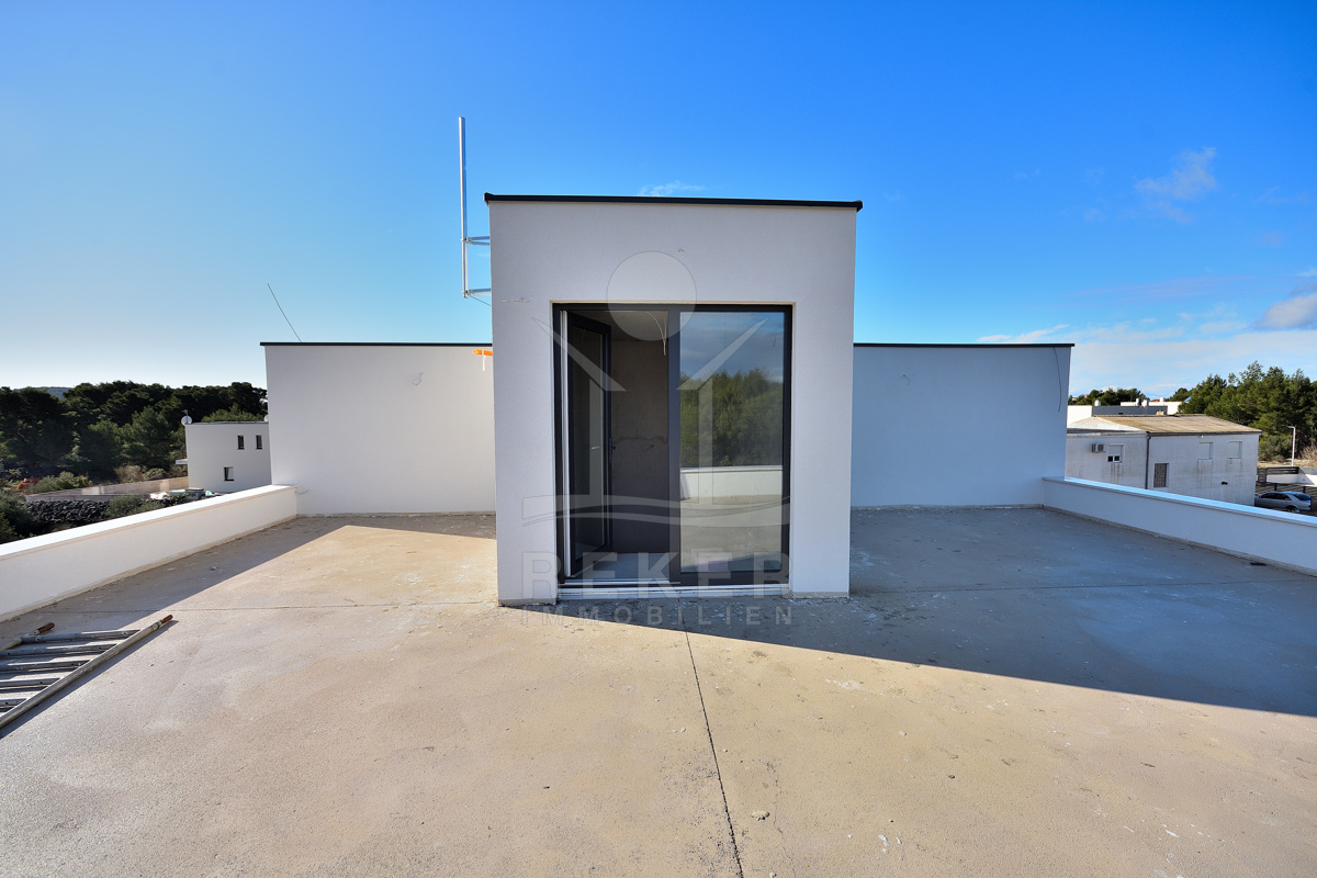 Diese moderne Doppelhaushälfte befindet sich in ruhiger Wohnlage von Vodice. Zum Meer sind es etwa 500 m, das Stadtzentrum erreichen Sie nach rund 1.000 m. Die Nachbarschaft ist von zeitgenössischen Einfamilienhäusern und Villen geprägt. Eine Umgebung, die Ruhe und Alltagstauglichkeit verbindet. Zum Haus gehören eine Garage mit 22,40 m² sowie ein gepflasterter Stellplatz auf dem Grundstück. Parken ist damit komfortabel gelöst.