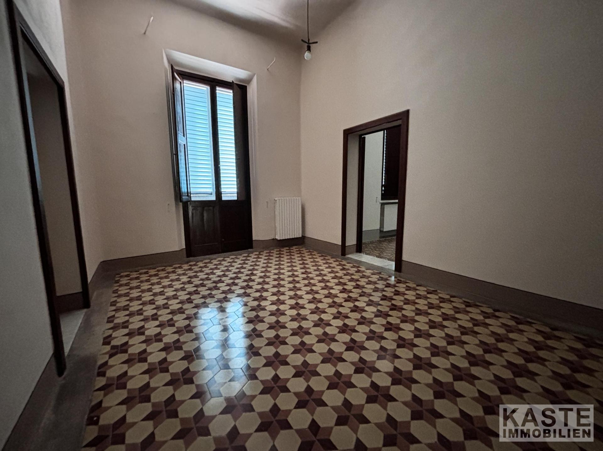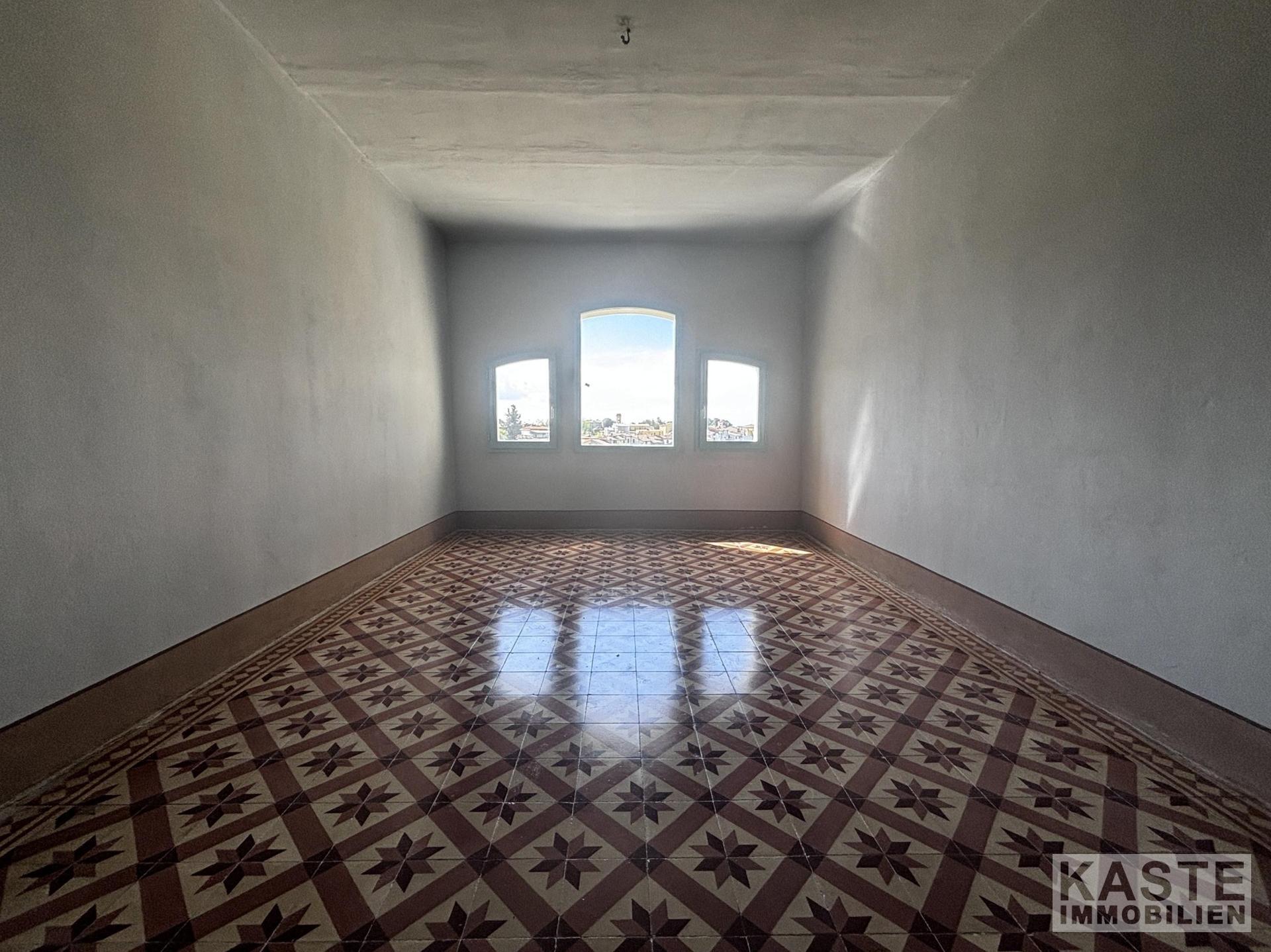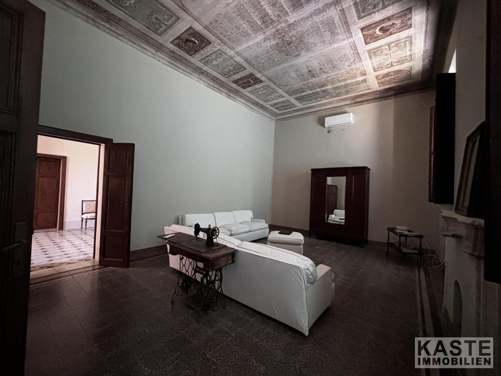 Der Zugang erfolgt über ein Tor an der Hauptstraße, das zu einer Privatstraße führt und direkt vor der Villa endet, wo eine originale Treppe zur Eingangstür führt. Die Villa erstreckt sich über 540 m² auf zwei Etagen. Die Decken sind mit beeindruckenden Fresken verziert, die leicht freigelegt werden können, während die Böden mit einzigartigen "Zementine"-Fliesen ausgestattet sind, die jedes Zimmer individuell gestalten.