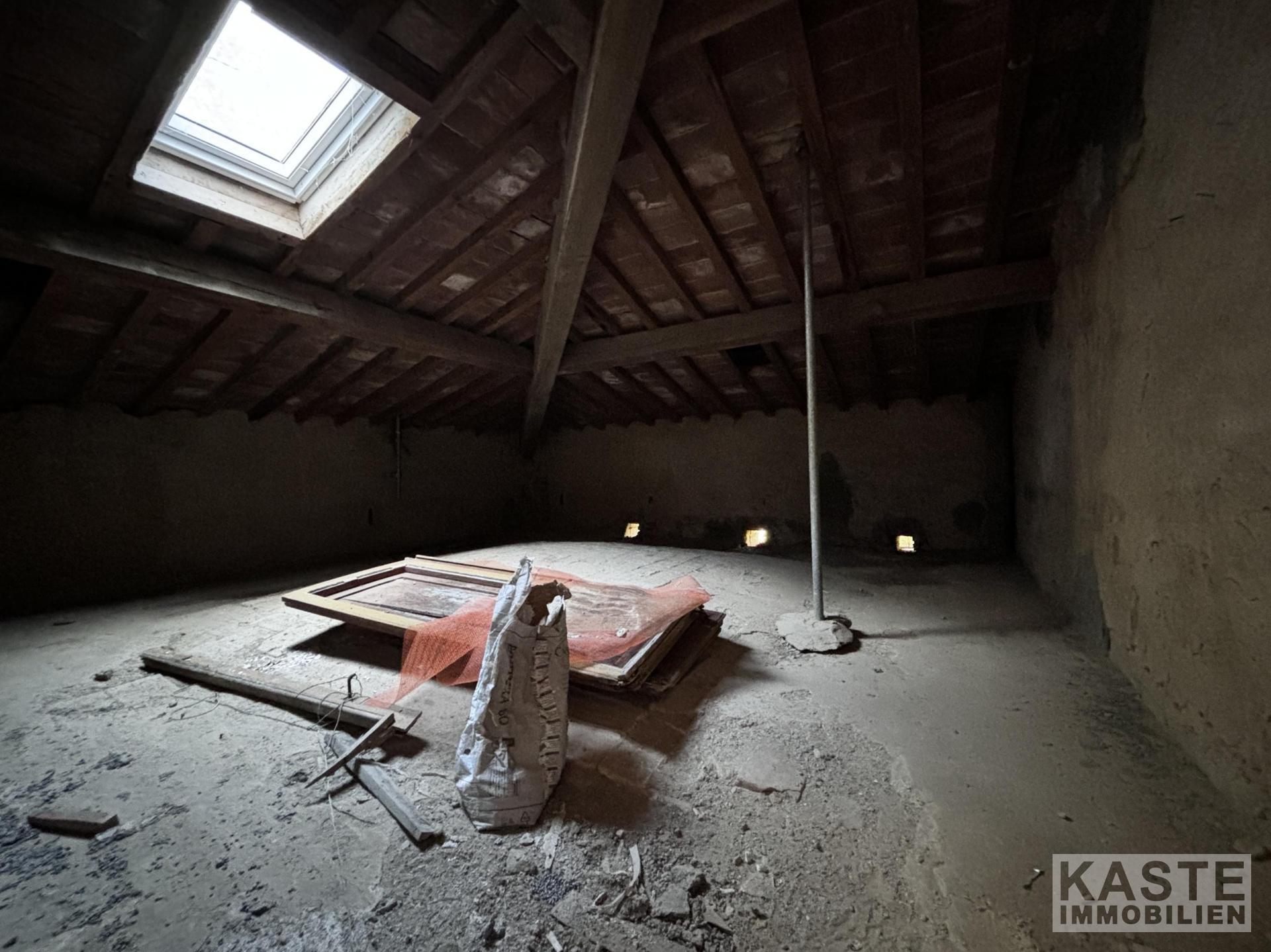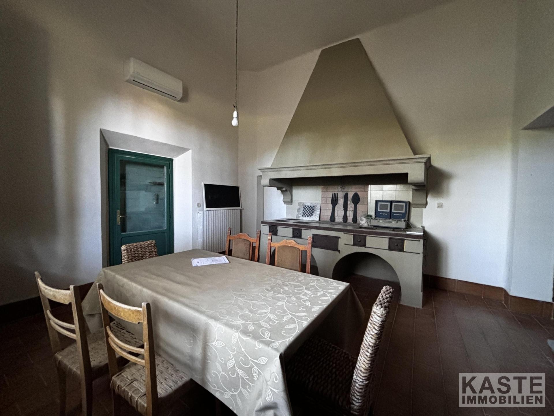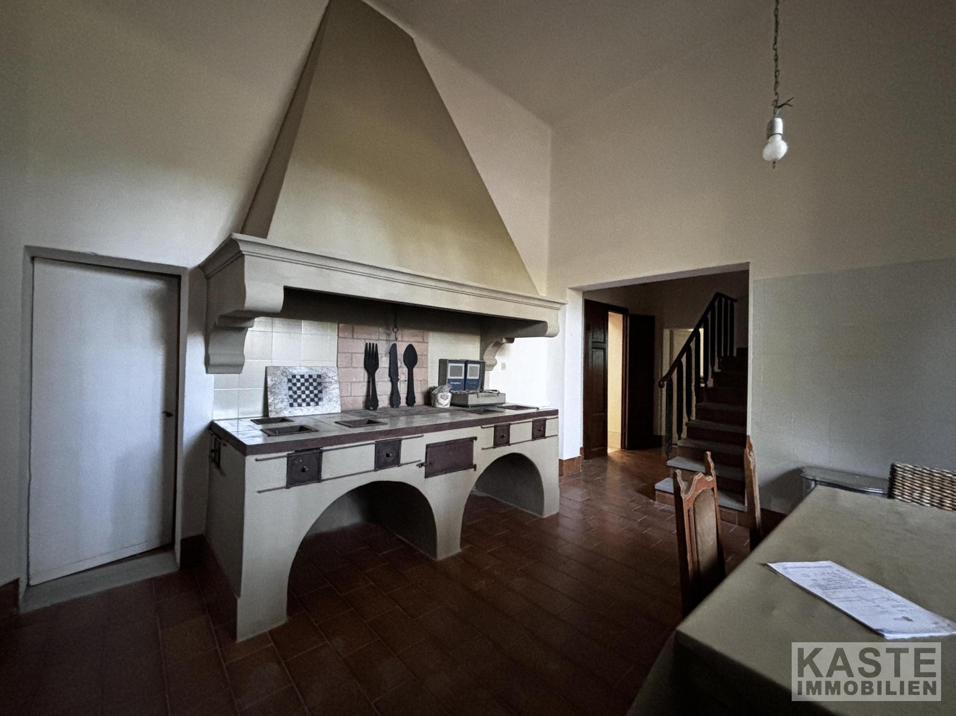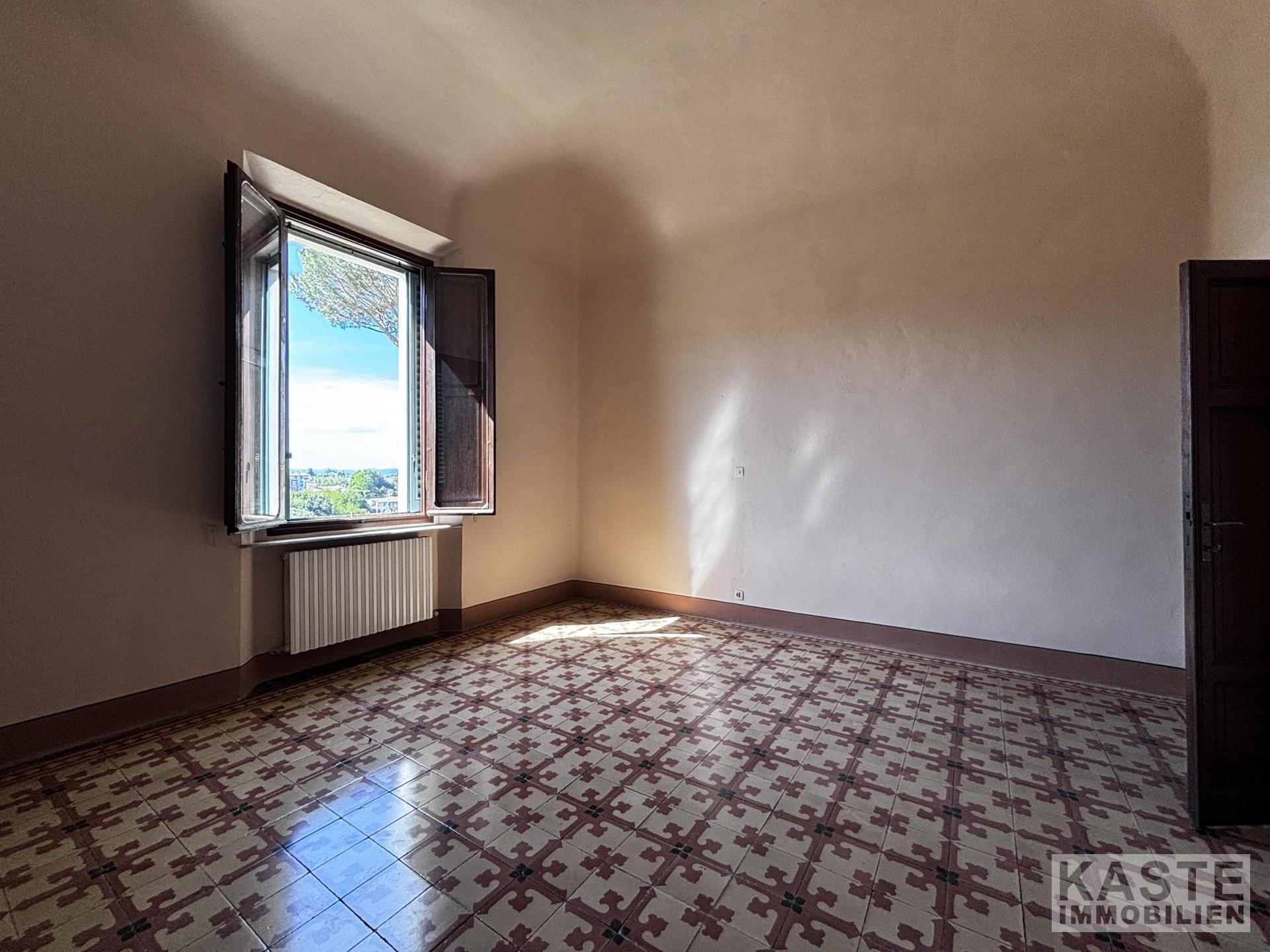 Raumaufteilung Im Erdgeschoss finden sich ein großzügiger Flur, zwei große Räume – einer mit Kamin und Fresken –, ein Schlafzimmer mit Bad und eine Küche. Eine traditionelle Treppe führt in den ersten Stock, wo sich vier Schlafzimmer mit en-suite Bädern befinden. Das Dachgeschoss bietet zwei weitere Zimmer und eine exklusive Dachterrasse mit Panoramablick, erreichbar über eine Wendeltreppe.