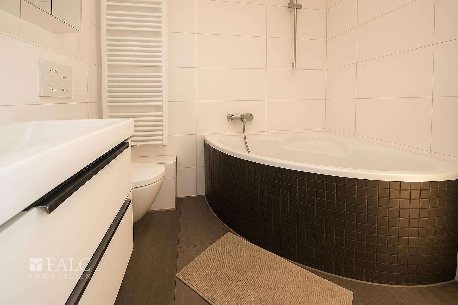 Das Tageslichtbad wurde ebenfalls 2022 modernisiert und verfügt über eine komfortable Eckbadewanne, ein Waschbecken mit Waschtisch sowie einen Handtuchtrockner.