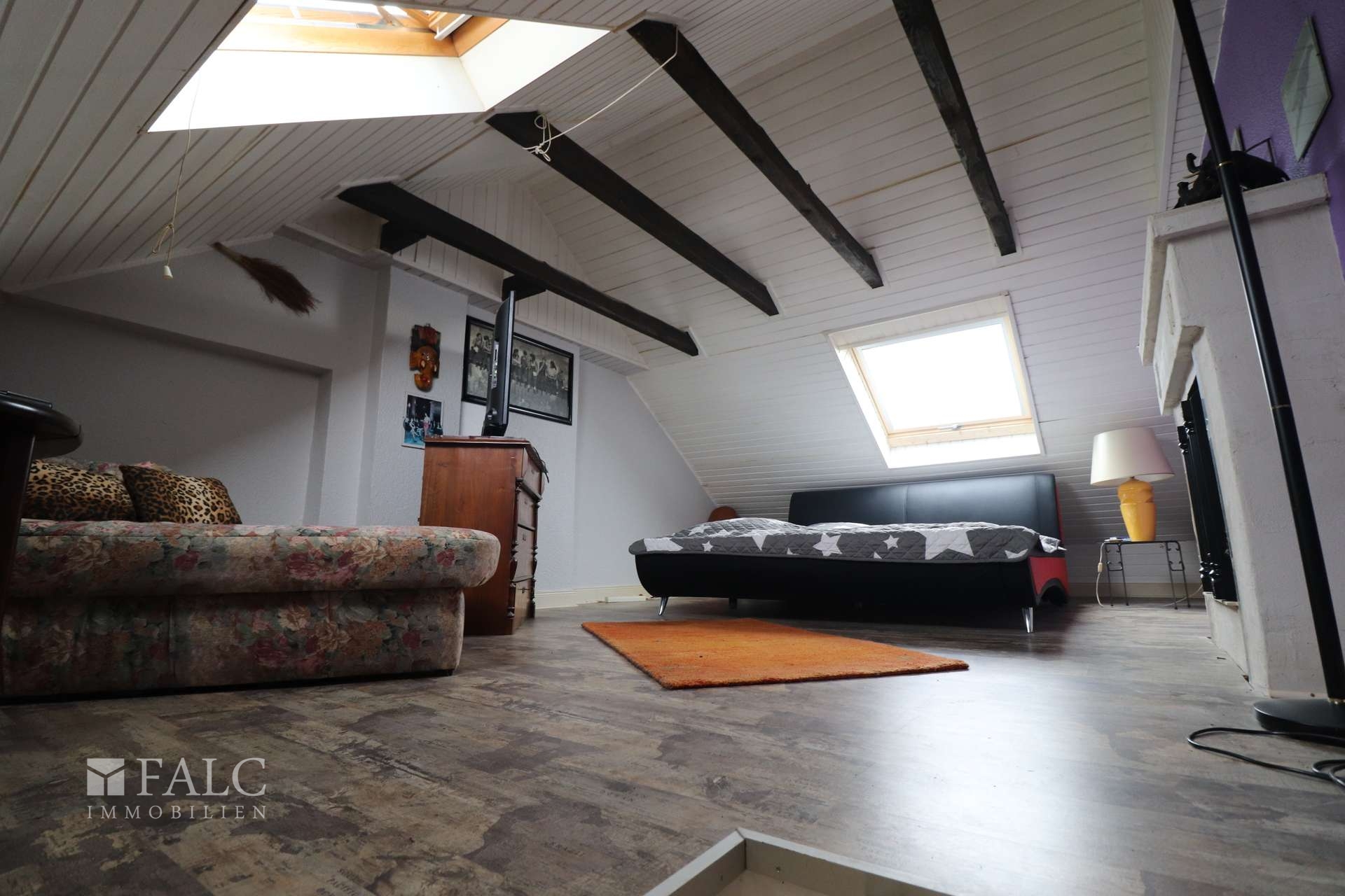 Das ausgebaute Dachgeschoss ist über eine weiße Raumspartreppe zugänglich. Der durchdacht geschnittene Raum verfügt über zwei Velux-Fenster, die dank Dämmung für ein angenehmes Raumklima und natürliches Licht sorgen. Weiße Holzverkleidungen an den Dachschrägen und kontrastierende dunkle Dachbalken verleihen dem Raum eine besondere, gemütliche Ausstrahlung.
