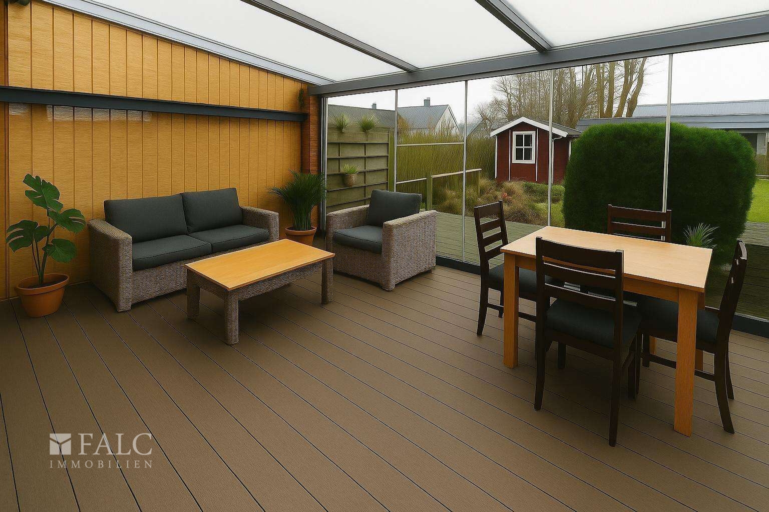 Vom Wohnzimmer aus gelangt man direkt in den Wintergarten. Große Glasschiebetüren lassen sich vollständig öffnen und schaffen so einen fließenden Übergang nach draußen. Der Boden ist mit hochwertigem Bangkirai-Holz ausgelegt. Die angrenzende Terrasse ist durch Holzelemente und einen Weidenzaun stilvoll abgegrenzt.