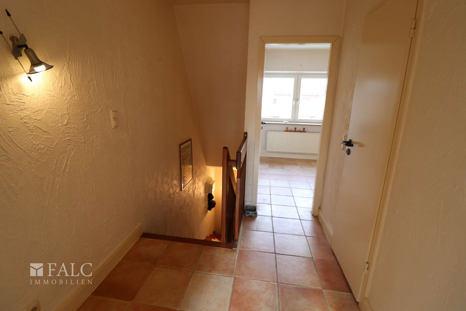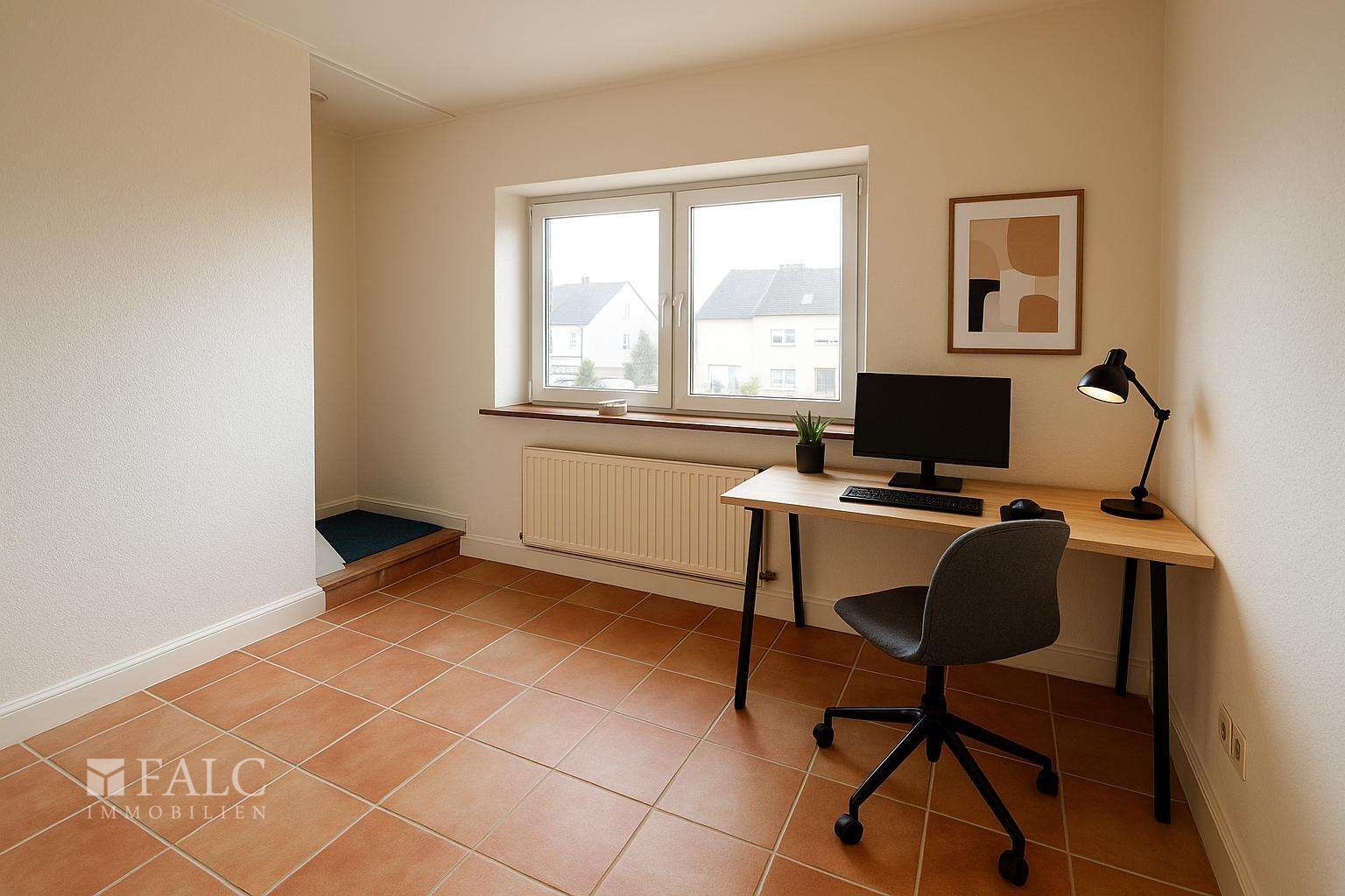 Ins Obergeschoss führt eine Holztreppe. Auch dieser Bereich ist vollständig mit Terrakottafliesen versehen. Hier befinden sich zwei helle Räume: ein Schlafzimmer sowie ein Durchgangszimmer, das sich ideal als Home-Office eignet. Weiße Holztüren und moderne Kunststofffenster – ebenfalls 2022 erneuert und mit Außenrollläden nachgerüstet – sorgen für viel Licht und eine freundliche Atmosphäre.