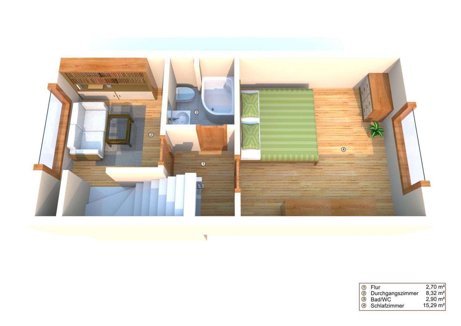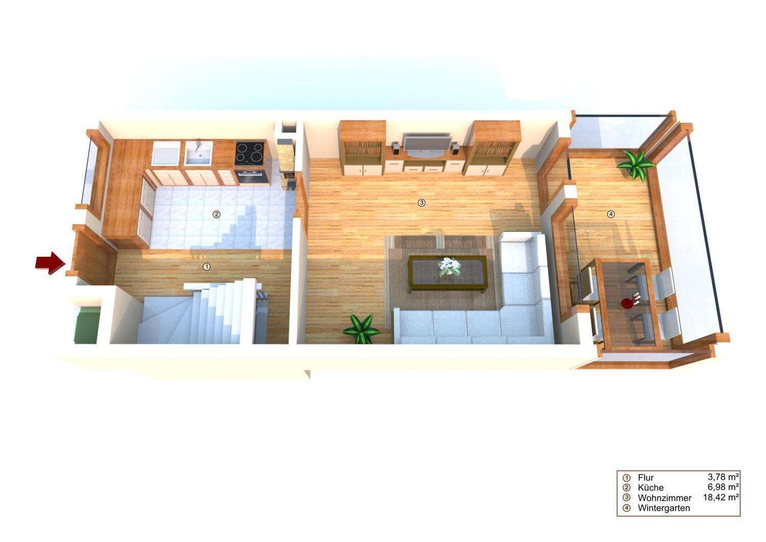 In diesen vier Wänden werden sich Familien garantiert wohlfühlen – auch solche, die noch eine werden wollen. Das großartige Wohnerlebnis in drei Zimmern auf rund 80 m² Wohnfläche in einem Dreietagenhaus samt ausgebautem Dach und noch mehr Platz unten im Keller. Außerdem verfügen Sie hier über einen Stellplatz vor dem Haus. Das Haus hat einen Hobbykeller, den man so übernehmen oder auch mit wenig Aufwand ganz nach Ihrem Geschmack umbauen kann. Das Untergeschoss verläuft über den gesamten Grundriss und bietet genug Platz für Waschmaschine und Trockner, und auch für einen Hobby,- oder Fitnessraum – ganz, wie Sie möchten. Sie wünschen sich einen Garten? Sie haben aber leider nicht die Zeit und Muße, viel dafür zu tun? Sie möchten einfach bei schönem Wetter einen Platz zum Entspannen? Bitte sehr: Hier ist er! Klein, fein und pflegeleicht, aber groß genug für die mega Entspannung. Als Geschenk gibt’s dazu: ein Gartenhaus. Praktisch und schön und wenn Sie nicht aufpassen, verlieren sie es an Ihren Mann als Werkstatt für Motorräder oder möchten sie vielleicht doch lieber ein Partyraum? Haben wir alles schon erlebt. Geradeaus über den Flur geht’s in das große Wohn- und Esszimmer. Es ist ein heller und luftiger Raum mit Platz für einen großen Tisch, an dem man wunderbar mit Freunden das perfekte Diner zelebrieren kann. Die schöne Terrasse lädt ein zum Sonnen am Nachmittag, abends zur Grillparty mit Freunden oder zu lauschigen Stunden zu zweit. Der Begriff Wintergarten trifft es eigentlich nicht genau: Durch die bodentiefen Fenster/die großen Schiebetüren lädt er auch im Sommer zum Entspannen ein. Die Küche ist offen gestaltet, gern gesehen bei allen, die Kochen als gemeinsames Erlebnis zelebrieren. Gute Geräte, bequeme Arbeitshöhe, Stauraum und eine gute Belüftung auch beim Steak grillen. Außerdem befinden sich neben dem Wohnzimmer zwei weitere Räume im Obergeschoss, unterm Dach haben Sie ein modernes, Studio, der Schrägen und Holzbalken sei Dank mit einem kuscheligen Ambiente, dazu mit tollem Blick über die Dächer. Ideal für den erwachsen werdenden Teenager. An Raum wurde im Bad schon mal nicht gespart. Eine Eckbadewanne, ein Waschbecken mit Armaturen und Unterschrank und, weißen Fliesen machen es zu einem Ort, der ihnen nach einem anstrengenden Tag Entspannung schenken will. Im Keller gibt es zusätzlich ein kleines Gäste-WC mit Waschbecken. Nicht nur gut für Besucher.
