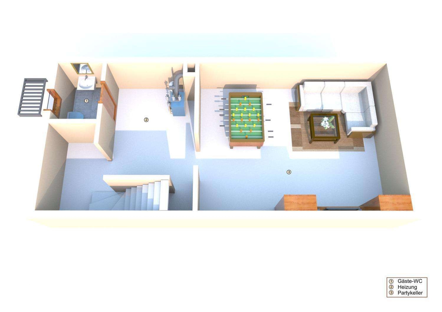 In den Keller führt eine mit Terrakottafliesen belegte Betontreppe. Der Keller selbst ist hell gefliest. Ein kleines Gäste-WC wurde 2022 mit einem neuen WC und Waschbecken ausgestattet. Im angrenzenden Raum befinden sich Anschlüsse für Waschmaschine und Trockner sowie die Heizungsanlage. Zusätzlicher Stauraum steht unter der Treppe zur Verfügung.