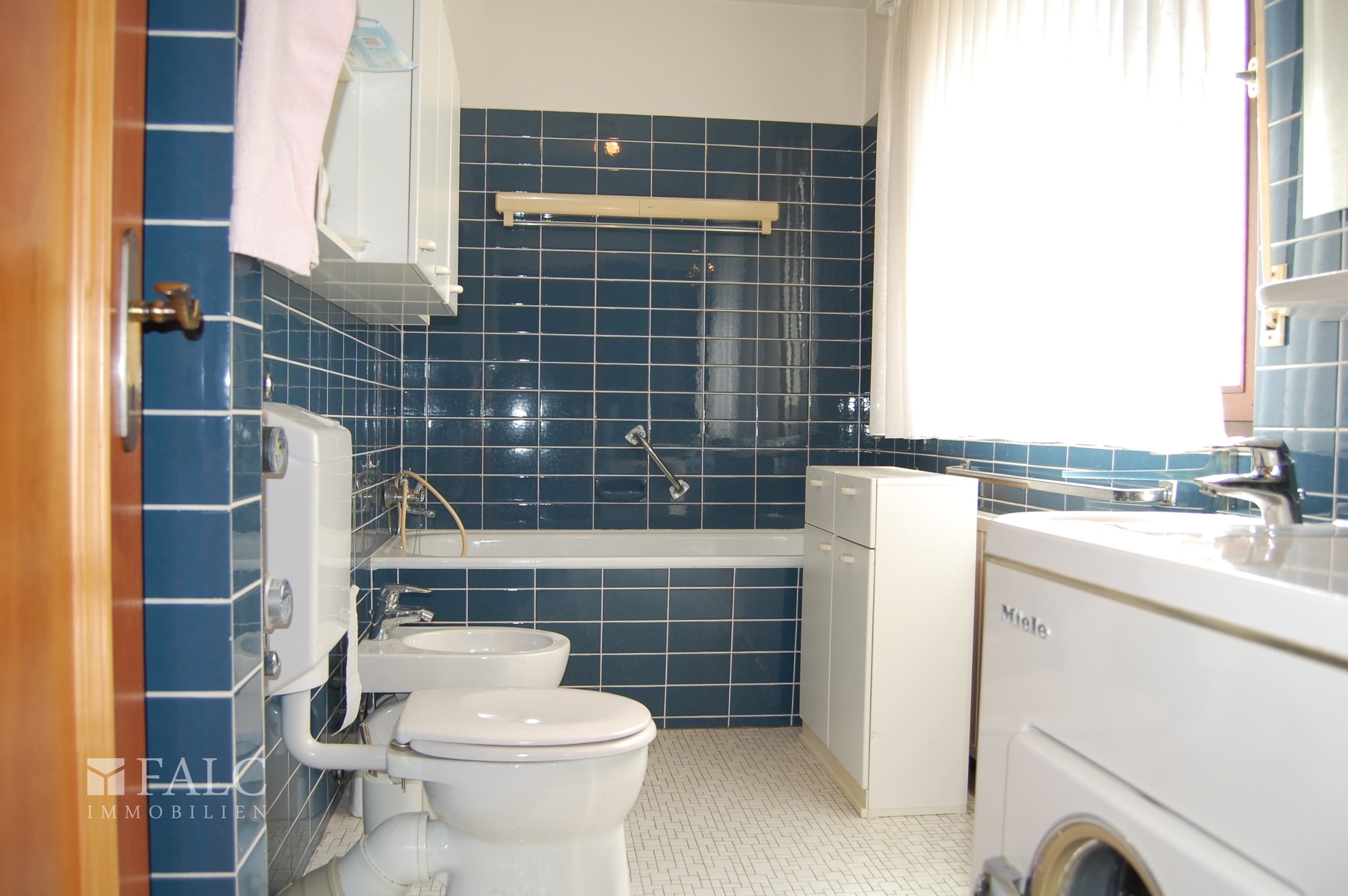 Das Badezimmer ist bestückt mit einer Badewanne, einer Dusche, einem Waschbecken, einem Bidet und einer Toilette. Auch die Waschmaschine findet hier ihren Platz.