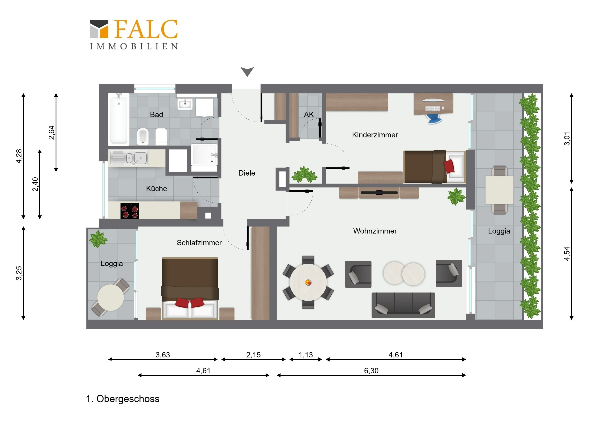 Ein gemütliches Plätzchen: Das lichtdurchflutete Wohnzimmer lädt Sie zum Entspannen und Verweilen ein. Durch diesen Wohnbereich und das Kinderzimmer haben Sie einen direkten Zugang auf die große Loggia, welche nach Südwest ausgerichtet ist. Dort können Sie in Ruhe Ihren Feierabend genießen.