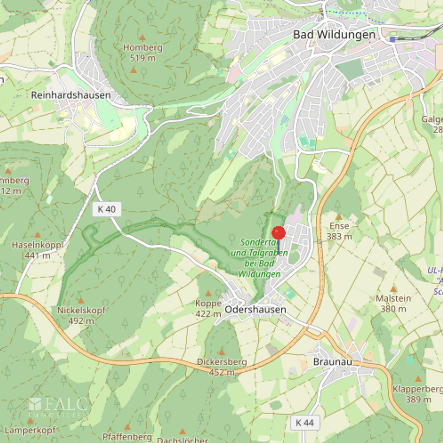 Die Immobilie befindet sich in Odershausen. Dies ist ein Stadtteil der Stadt Bad Wildungen im nordhessischen Landkreis Waldeck Frankenberg. Es liegt eingebettet von idyllischen Landschaften im östlichen Teil des Nationalparks Kellerwald-Edersee.