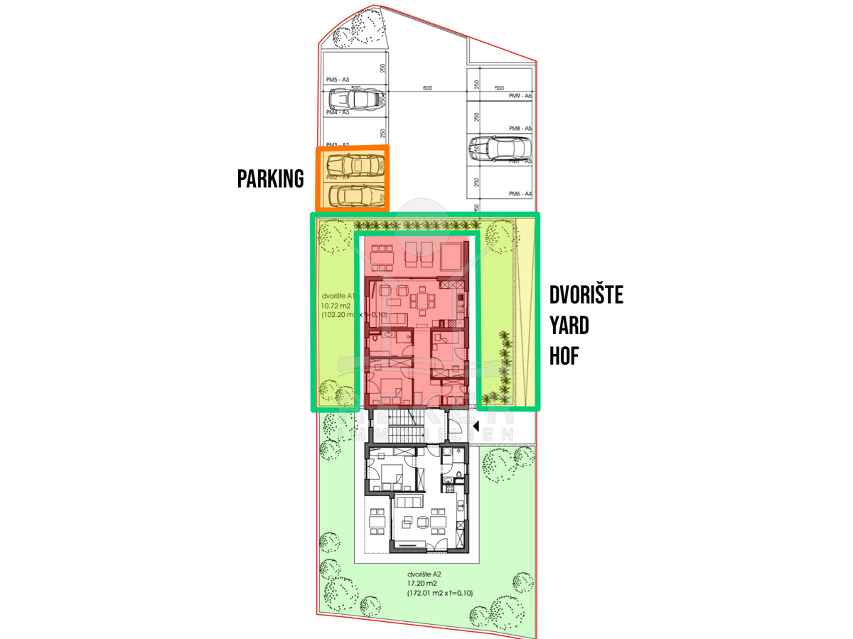 Das Wohngebäude ist modern geplant und wird aus hochwertigen Materialien gebaut. Es umfasst drei Etagen mit 6 Wohnungen, jede mit eigenem überdachtem Außenbereich. Die Architektur wirkt aufgeräumt und klar – mit viel Glas und Beton. Parkplätze sind für jede Wohnung vorgesehen, optional mit eigener E-Ladestation. Die gemeinschaftlichen Grünflächen werden über einen eigenen Trinkwasserbrunnen bewässert – das spart laufende Kosten und ist nachhaltig.