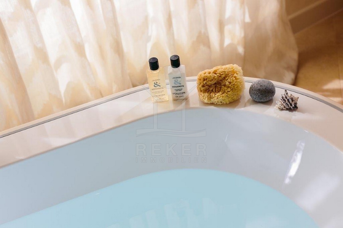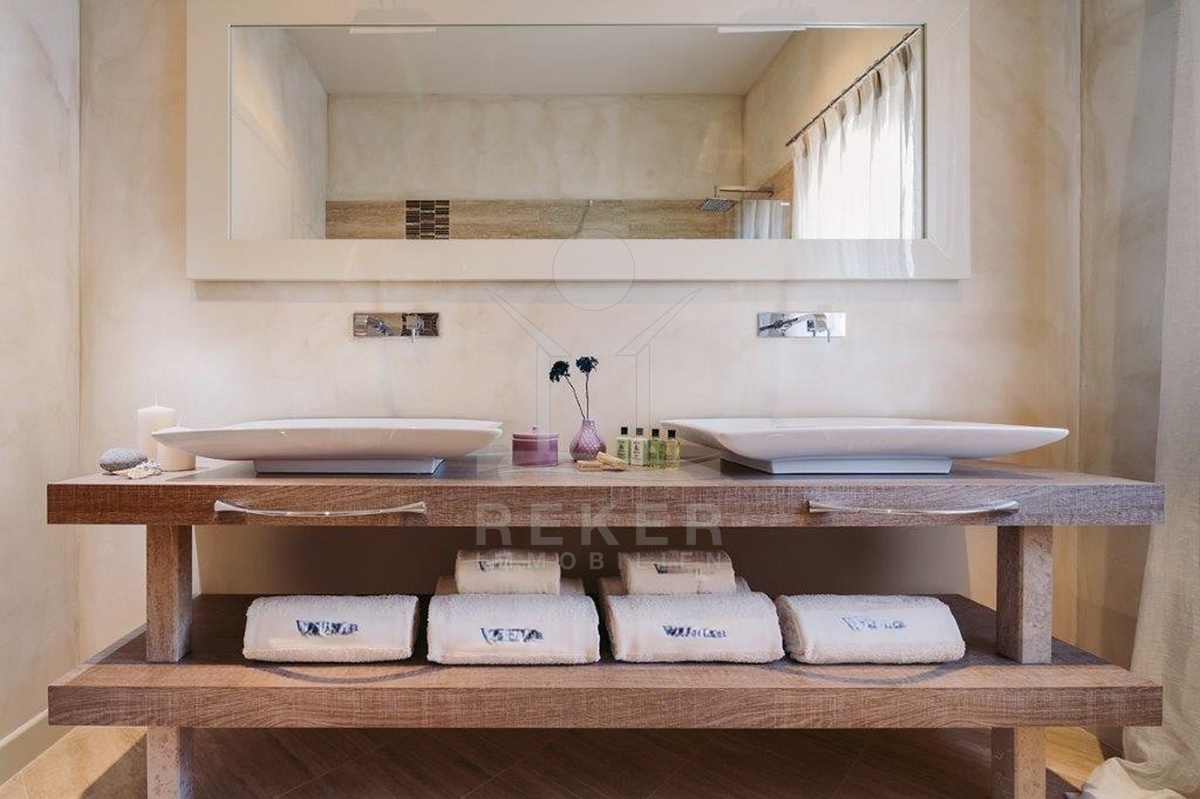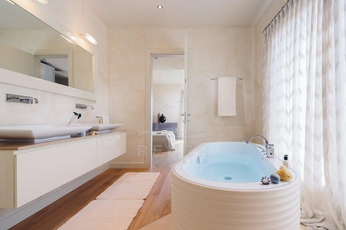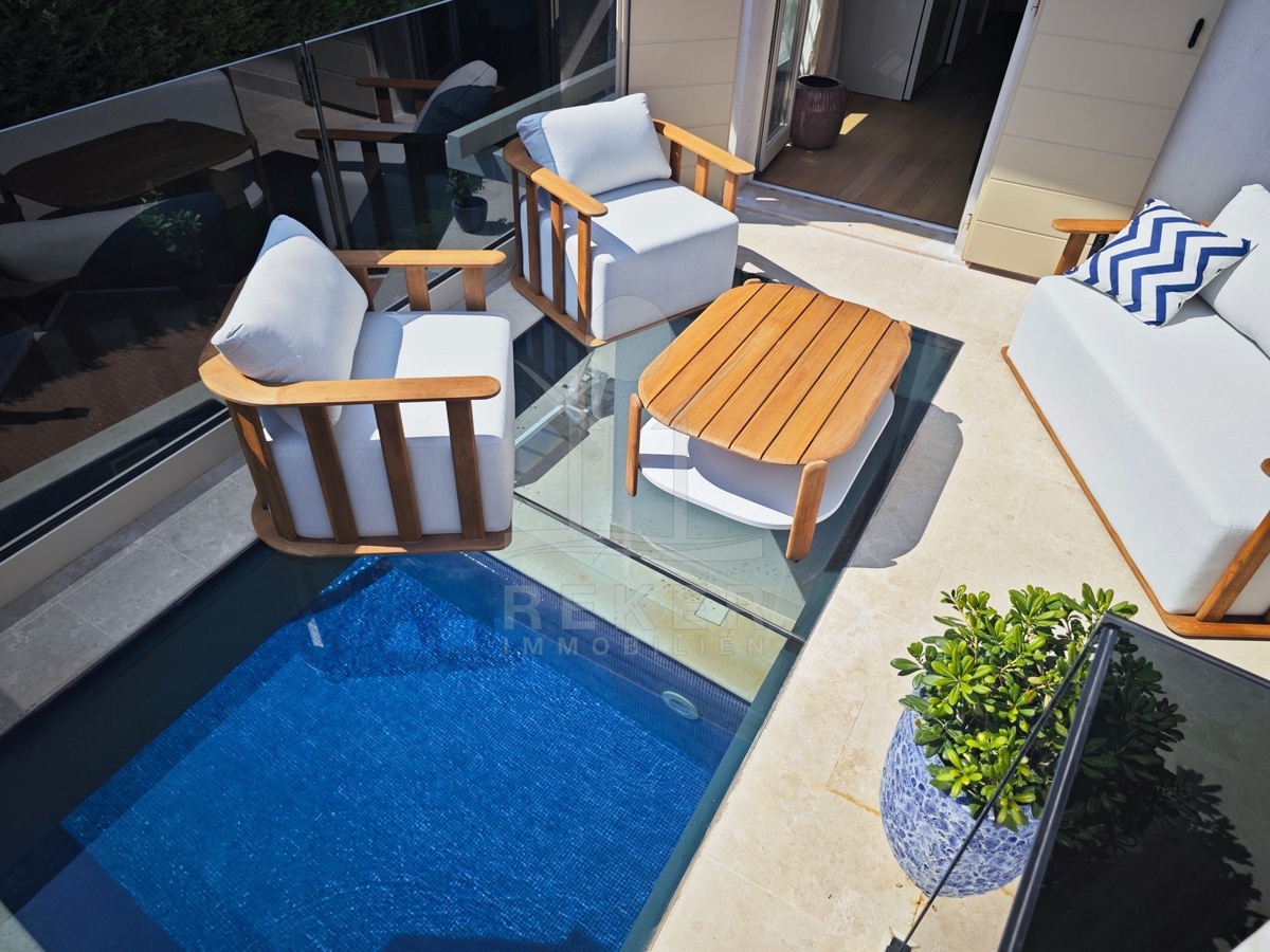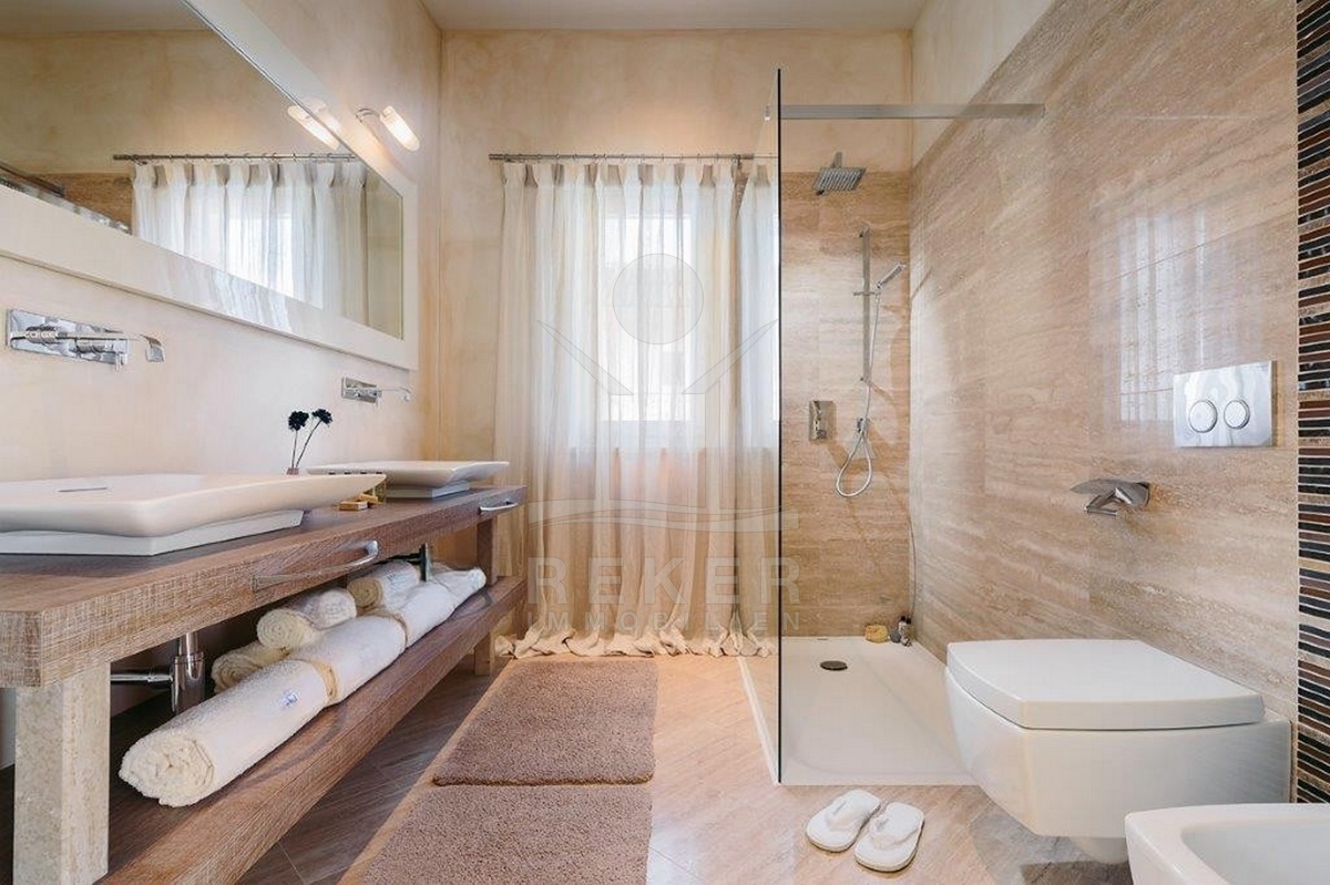 Der Außenbereich ist praktisch und zugleich charmant gestaltet. Der Garten mit Olivenbaum und Lavendel sorgt für mediterranes Flair. Direkt vor dem Wohnbereich liegt der Pool mit Außendusche und Sonnenterrasse. Eine Besonderheit ist der obere Balkon mit Glasboden, von dem aus Sie über eine Treppe direkt in den Garten gelangen. Auf der ca. 53 m² großen Dachterrasse genießen Sie einen weiten Blick auf das Meer … perfekt für entspannte Abende bei Sonnenuntergang.