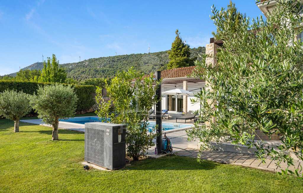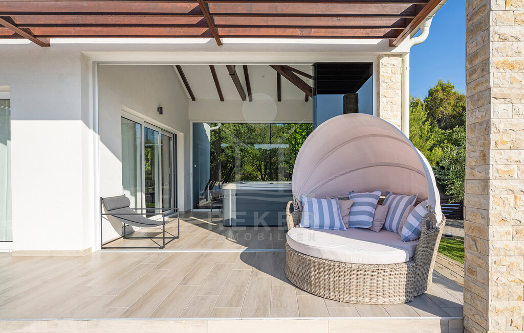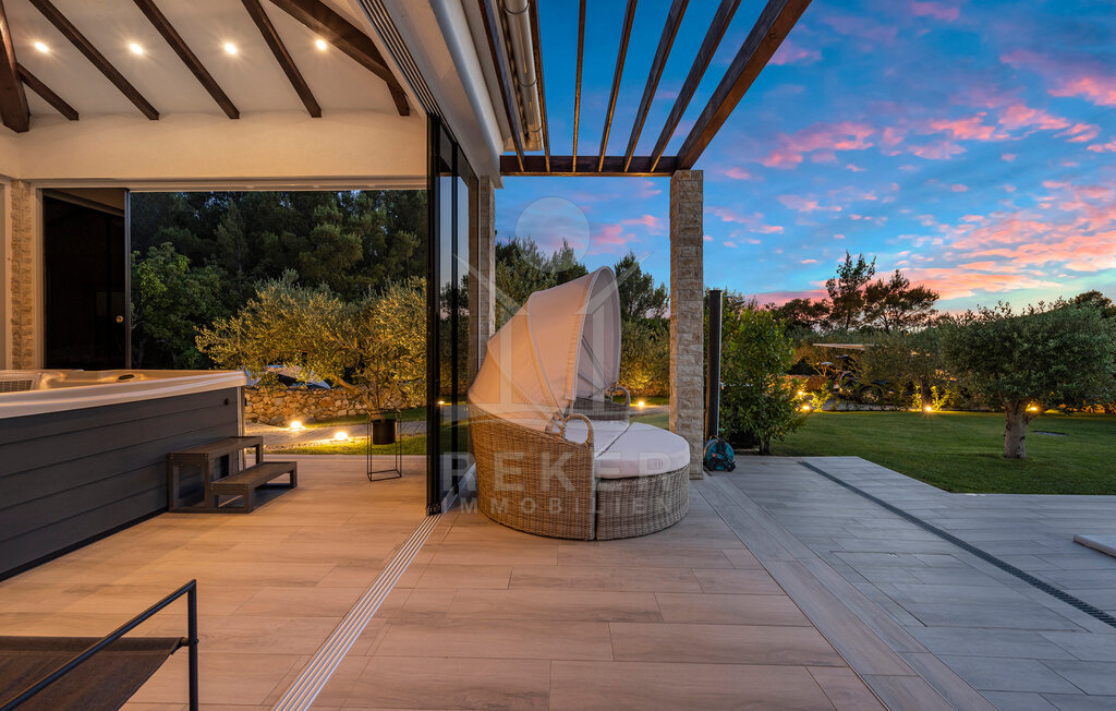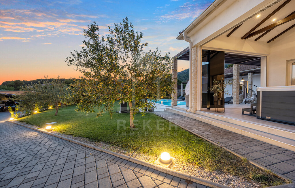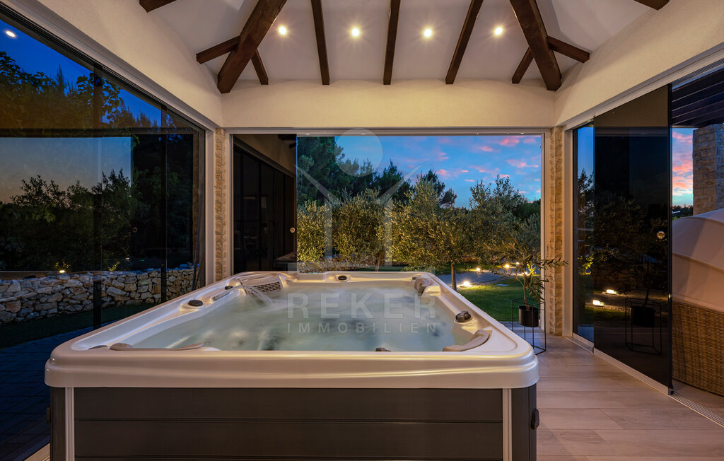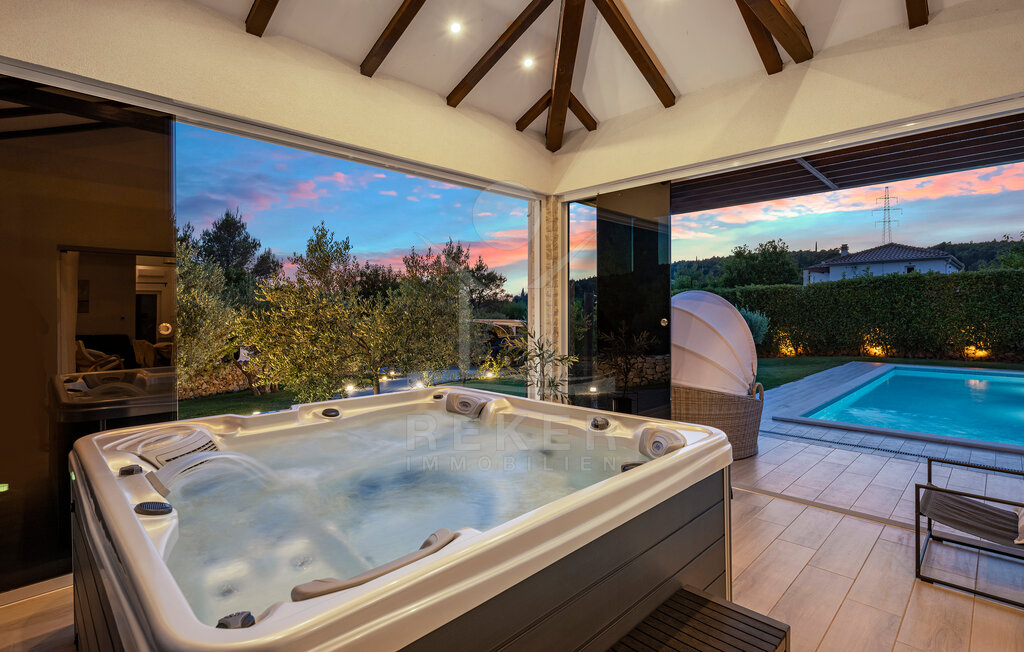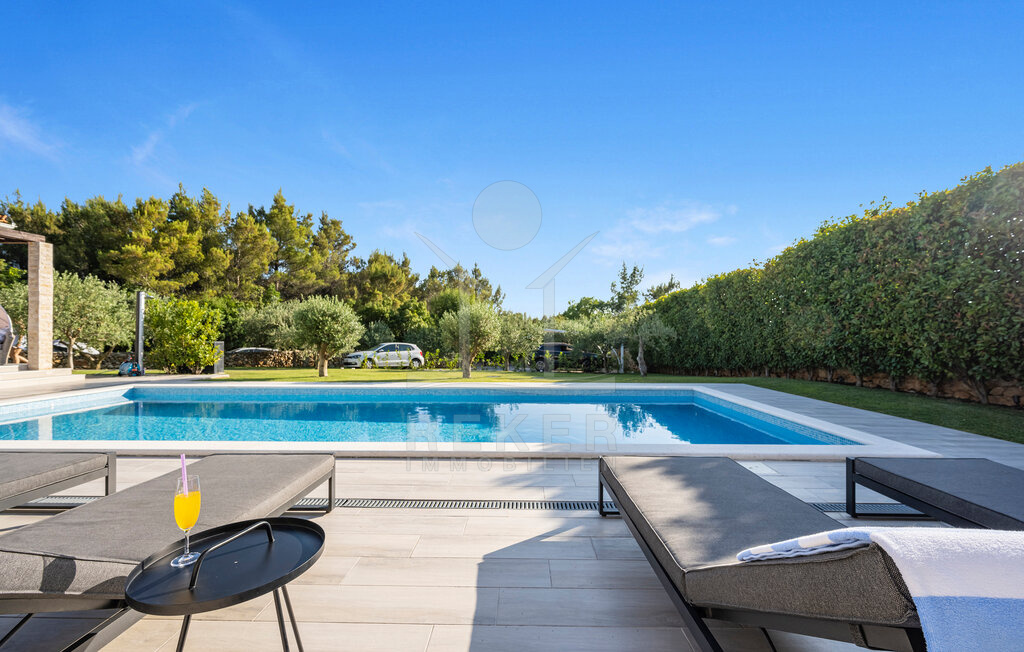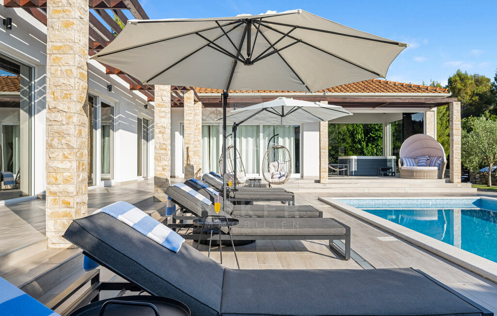 Im Außenbereich erwartet Sie ein großzügiger beheizter Pool mit Mosaikfliesen, der dank Wärmepumpe lange nutzbar bleibt. Sonnenliegen und Schirme laden auf der breiten Terrasse zum Entspannen ein. Überdachte Bereiche mit Hängesesseln bieten Schatten und Rückzug. Im gepflegten Garten wachsen Olivenbäume, die Atmosphäre wirkt ruhig und mediterran. Ein verglaster Raum mit Whirlpool erweitert den Außenbereich um eine besondere Wellness-Oase.