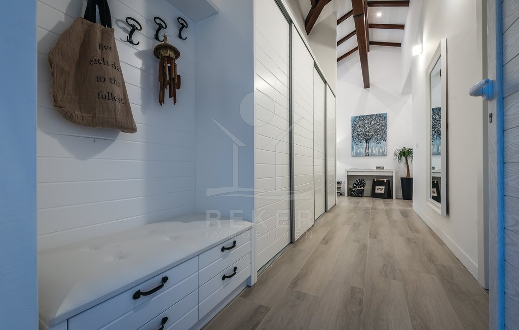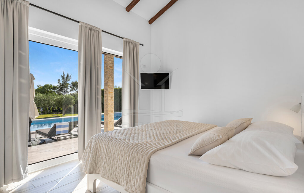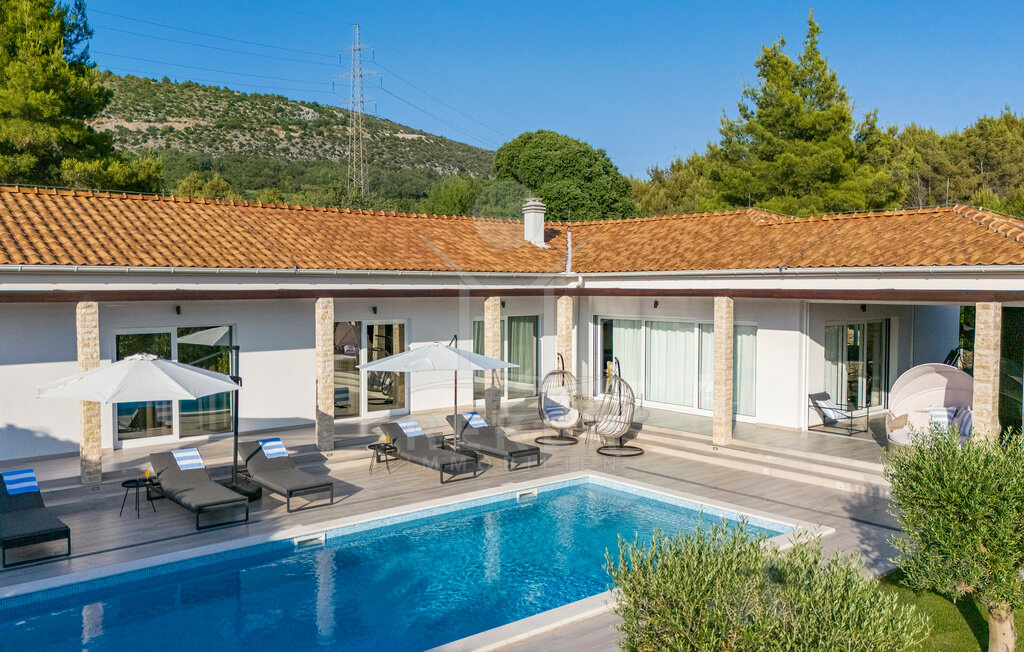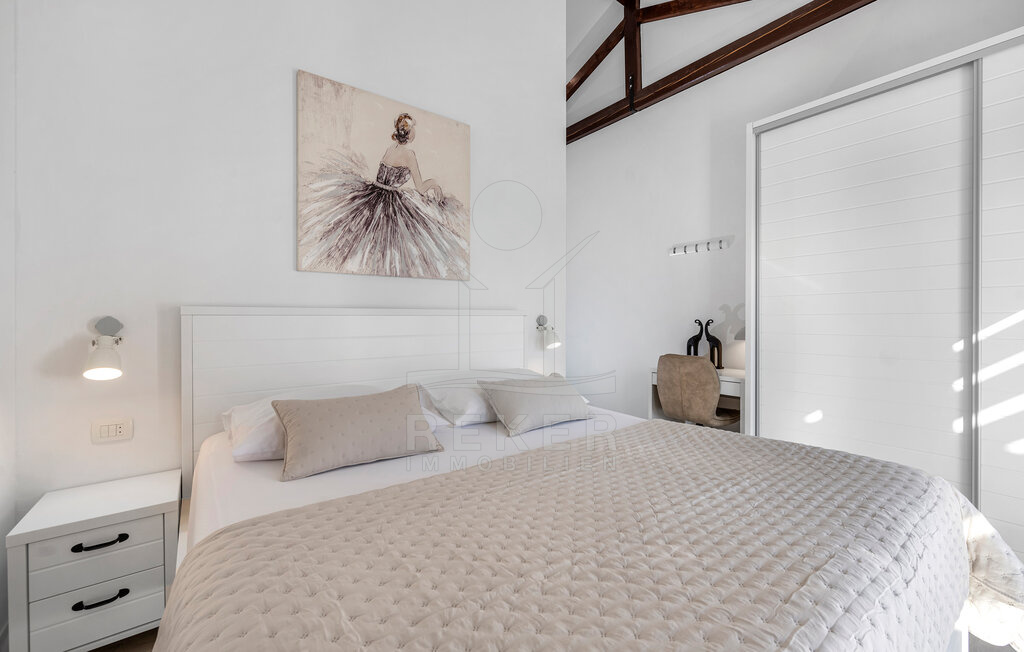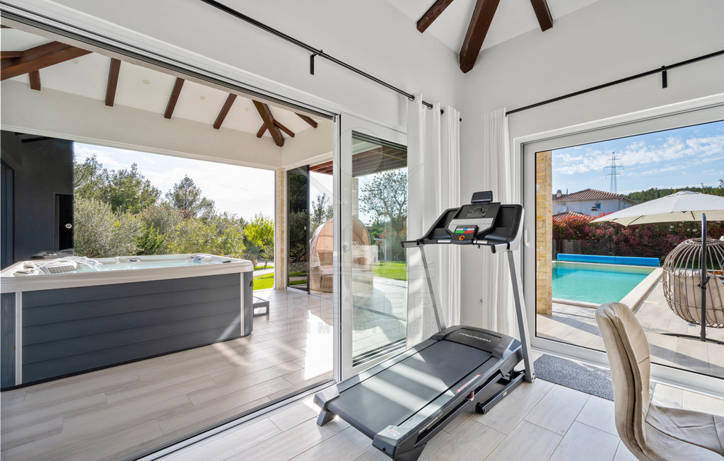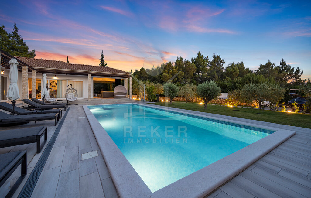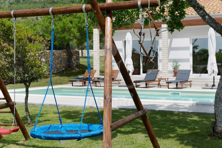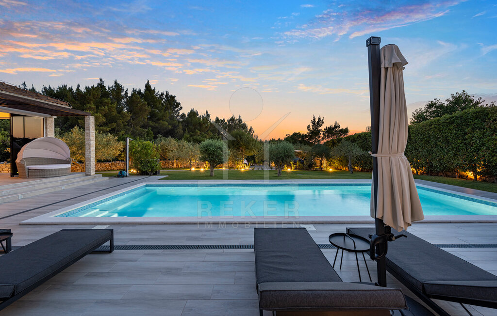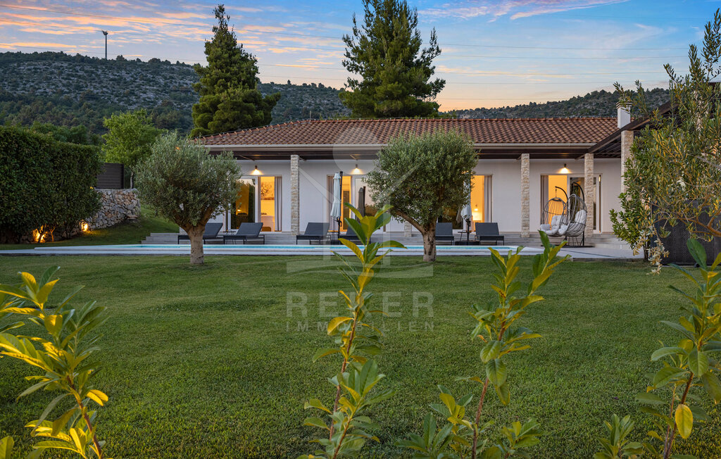 Im Außenbereich erwartet Sie ein großzügiger beheizter Pool mit Mosaikfliesen, der dank Wärmepumpe lange nutzbar bleibt. Sonnenliegen und Schirme laden auf der breiten Terrasse zum Entspannen ein. Überdachte Bereiche mit Hängesesseln bieten Schatten und Rückzug. Im gepflegten Garten wachsen Olivenbäume, die Atmosphäre wirkt ruhig und mediterran. Ein verglaster Raum mit Whirlpool erweitert den Außenbereich um eine besondere Wellness-Oase.