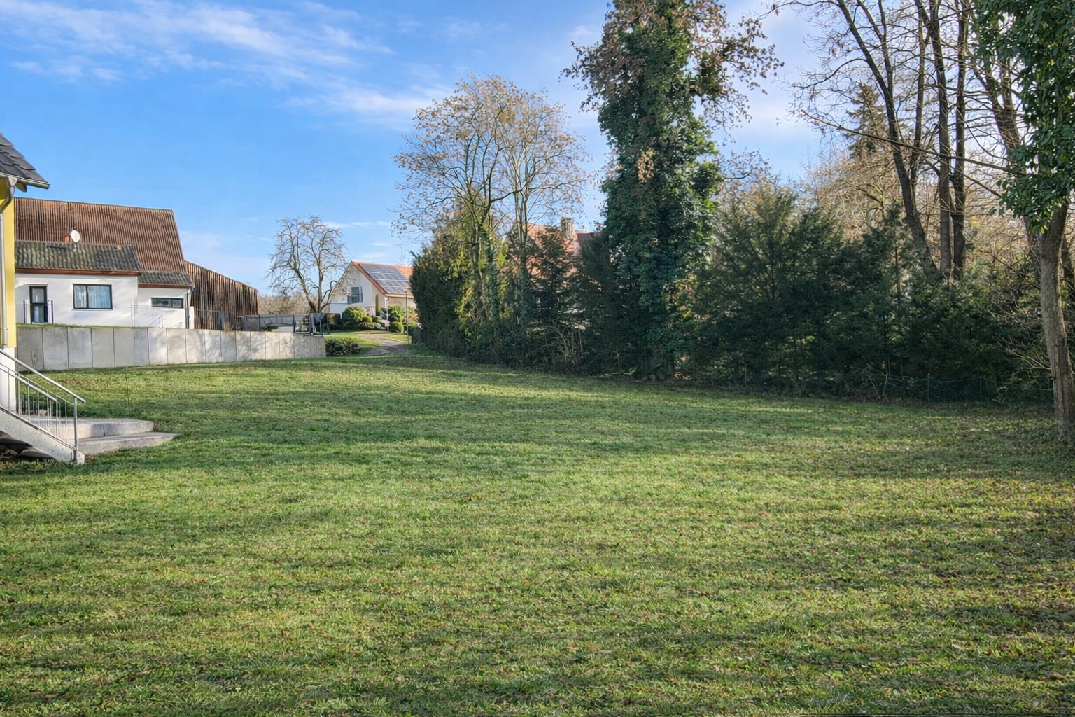 Die Bebauung des Grundstücks richtet sich nach § 34 BauGB und hat sich in Art und Maß der Nutzung, Bauweise und Gebäudehöhe an der bestehenden Umgebungsbebauung zu orientieren. Die Nachbarschaft ist geprägt von freistehenden Wohnhäusern mit ein bis zwei Vollgeschossen und geneigten Dächern, sodass eine klassische Wohnbebauung (z. B. Ein- oder Zweifamilienhaus) als realistisch und gut genehmigungsfähig anzusehen ist.