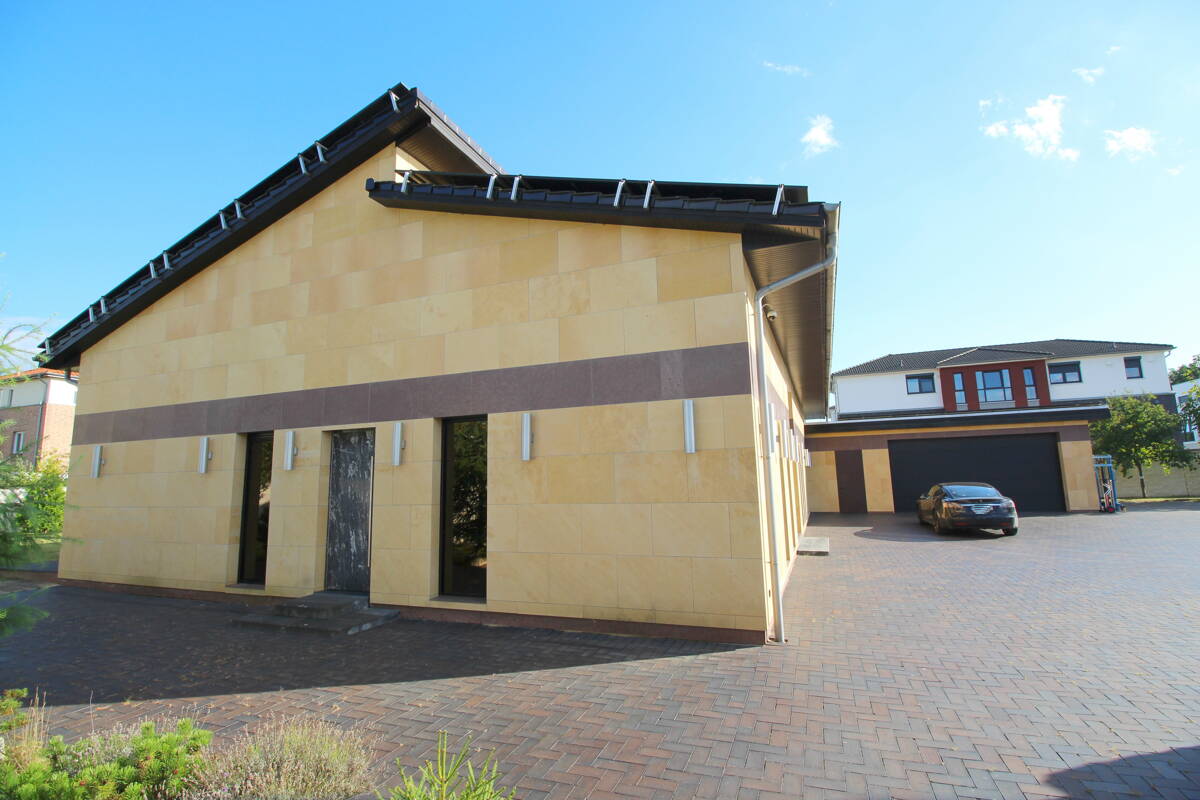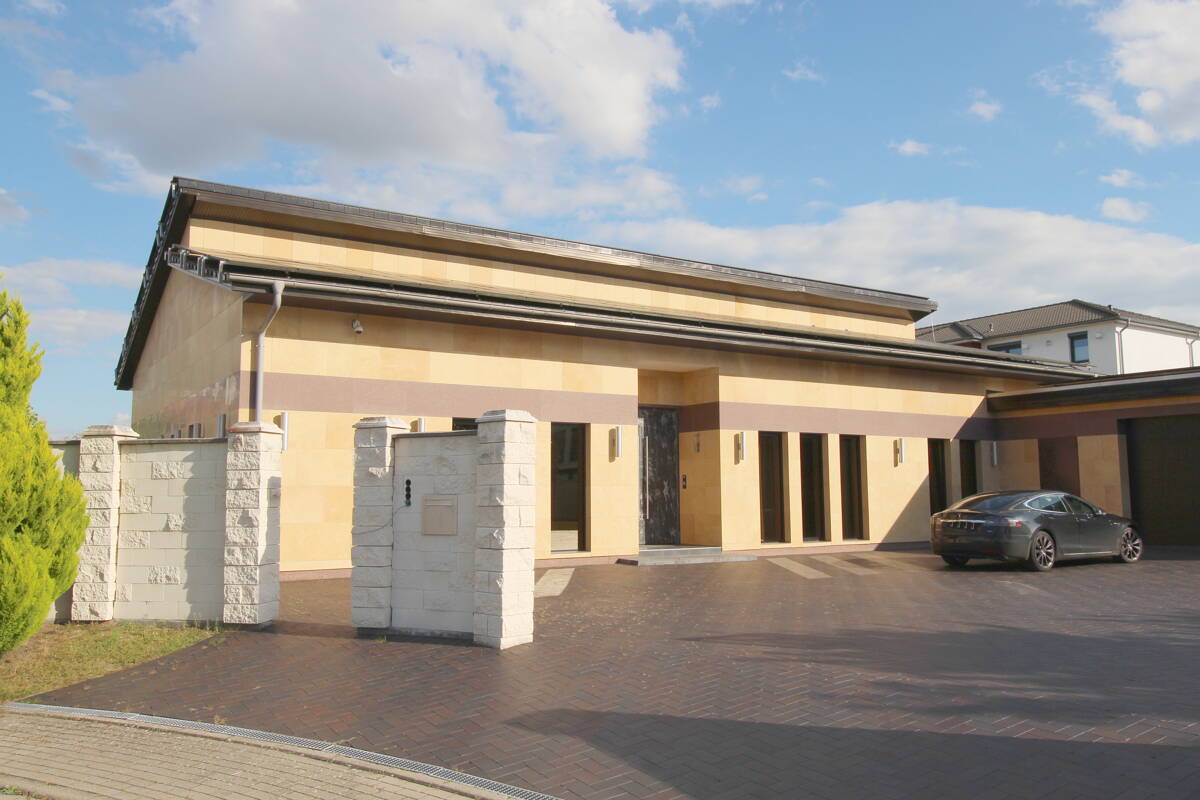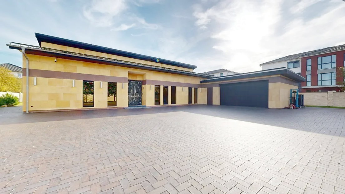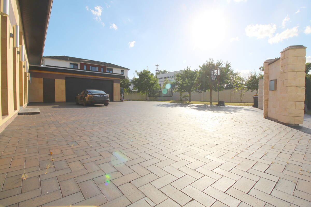 Die massiv errichtete Immobilie selbst besteht aus Beton und Kalksandstein. Sie besticht durch eine hohe Bauqualität und Langlebigkeit. Die beeindruckende Raumhöhe von 4 Metern verleiht dem Haus ein großzügiges und offenes Raumgefühl, während die leicht getönten Fensterscheiben mit Alufensterrahmen für angenehmes Licht und Sonnenschutz sorgen. Die Immobilie ist voll unterkellert und offeriert zusätzlichen Stauraum mit flexiblen Nutzungsoptionen. Abgerundet wird diese außergewöhnlich luxuriöse Immobilie über eine großzügige Doppelgarage, welche Ihre Fahrzeuge schützt und Ihnen ausreichend Platz für zusätzliche Lagermöglichkeiten bietet. Im Außenbereich gibt es eine vollüberdachte Terrasse.