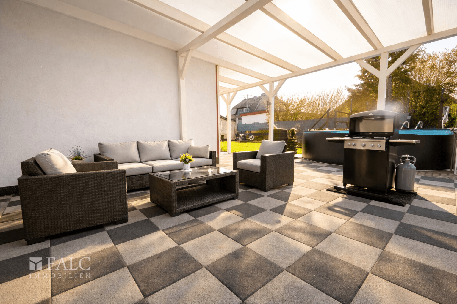 Der Außenbereich ist gepflegt angelegt und bietet mit einer ca. 46 m² großen, überdachten Terrasse einen idealen Ort zum Entspannen und Verweilen. Der Garten eröffnet vielfältige Nutzungsmöglichkeiten, sei es zur Erholung, für spielende Kinder oder für gärtnerische Aktivitäten. Zur Immobilie gehören zudem eine Garage mit einer Fläche von ca. 36 m² sowie ein Carport, die wettergeschützte Stellmöglichkeiten für Ihre Fahrzeuge bieten. Ergänzend sorgt eine leistungsstarke Photovoltaikanlage mit Speicher für eine fast autarke Stromversorgung.