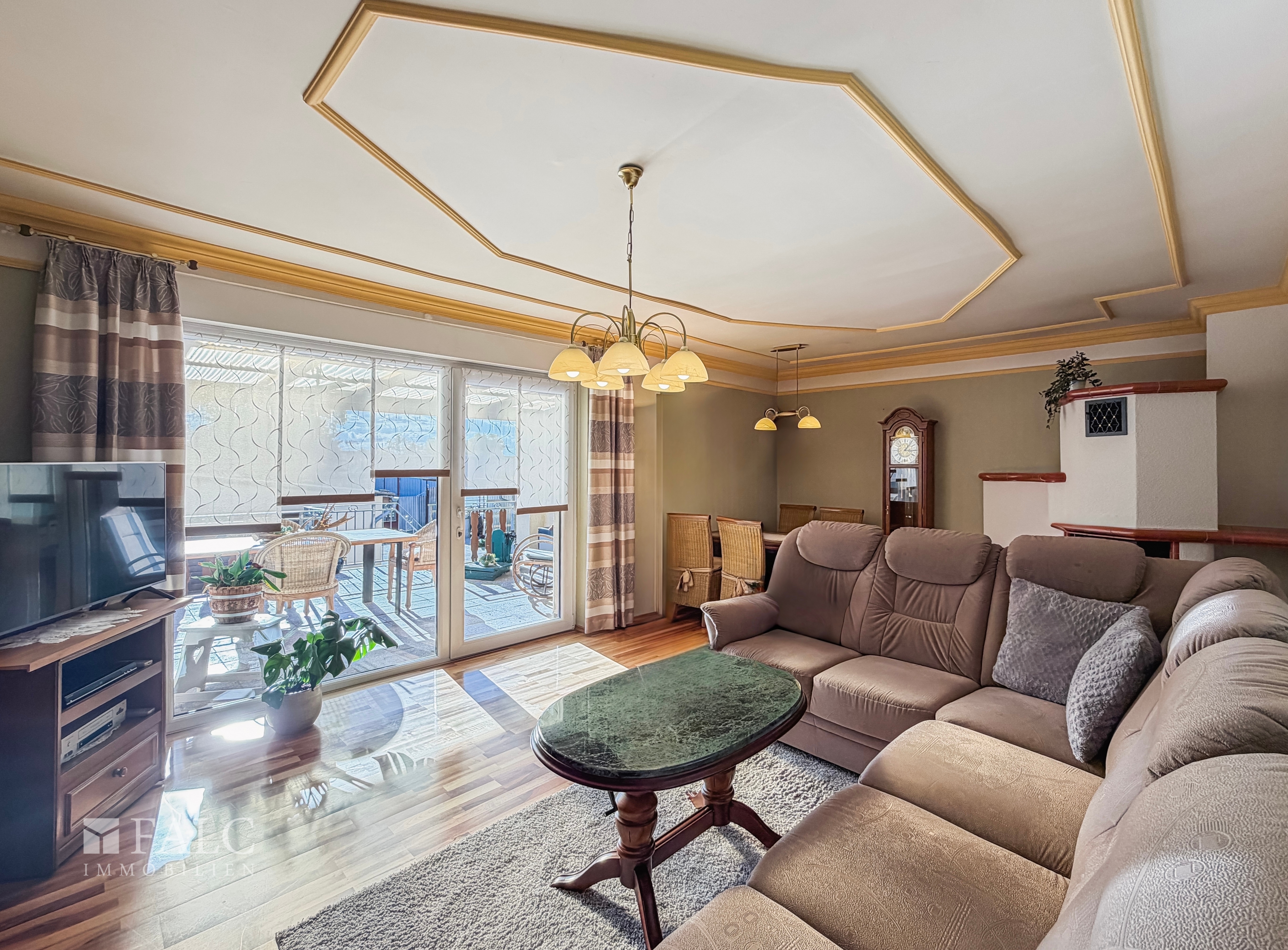 Im Erdgeschoss befindet sich ein großzügiges, lichtdurchflutetes Wohnzimmer mit Kamin, das direkten Zugang zur überdachten Terrasse bietet. Hier lassen sich sowohl gemütliche Abende am Kaminfeuer als auch gesellige Stunden im Freien genießen. Die im Kaufpreis enthaltene Küche bietet ausreichend Platz für eine moderne und funktionale Gestaltung. Ein Gäste-WC, das 2020 vollständig modernisiert wurde, rundet das Raumangebot ab. Zudem steht ein weiteres Zimmer zur Verfügung, das sich ideal als Arbeits- oder Gästezimmer eignet.