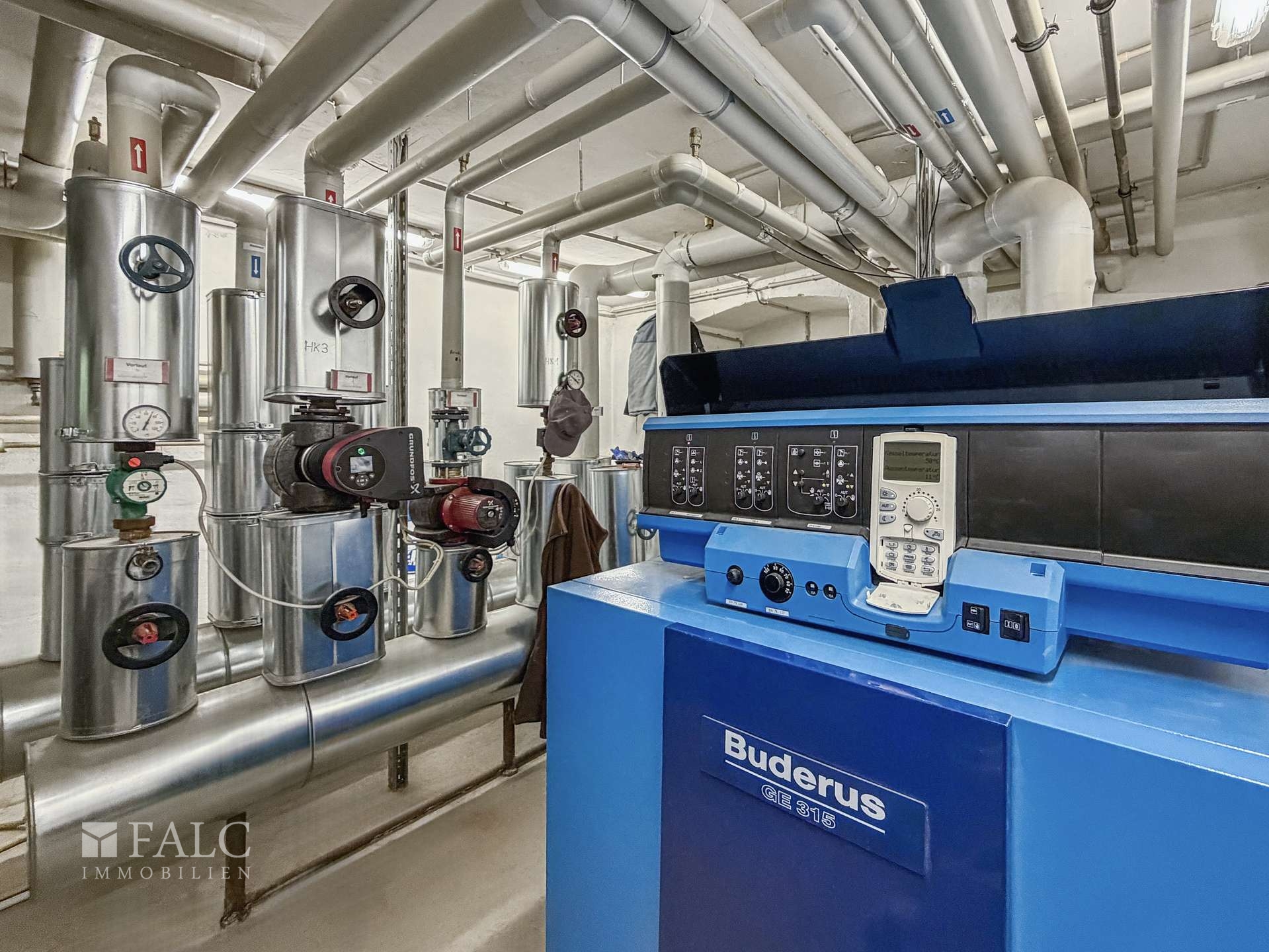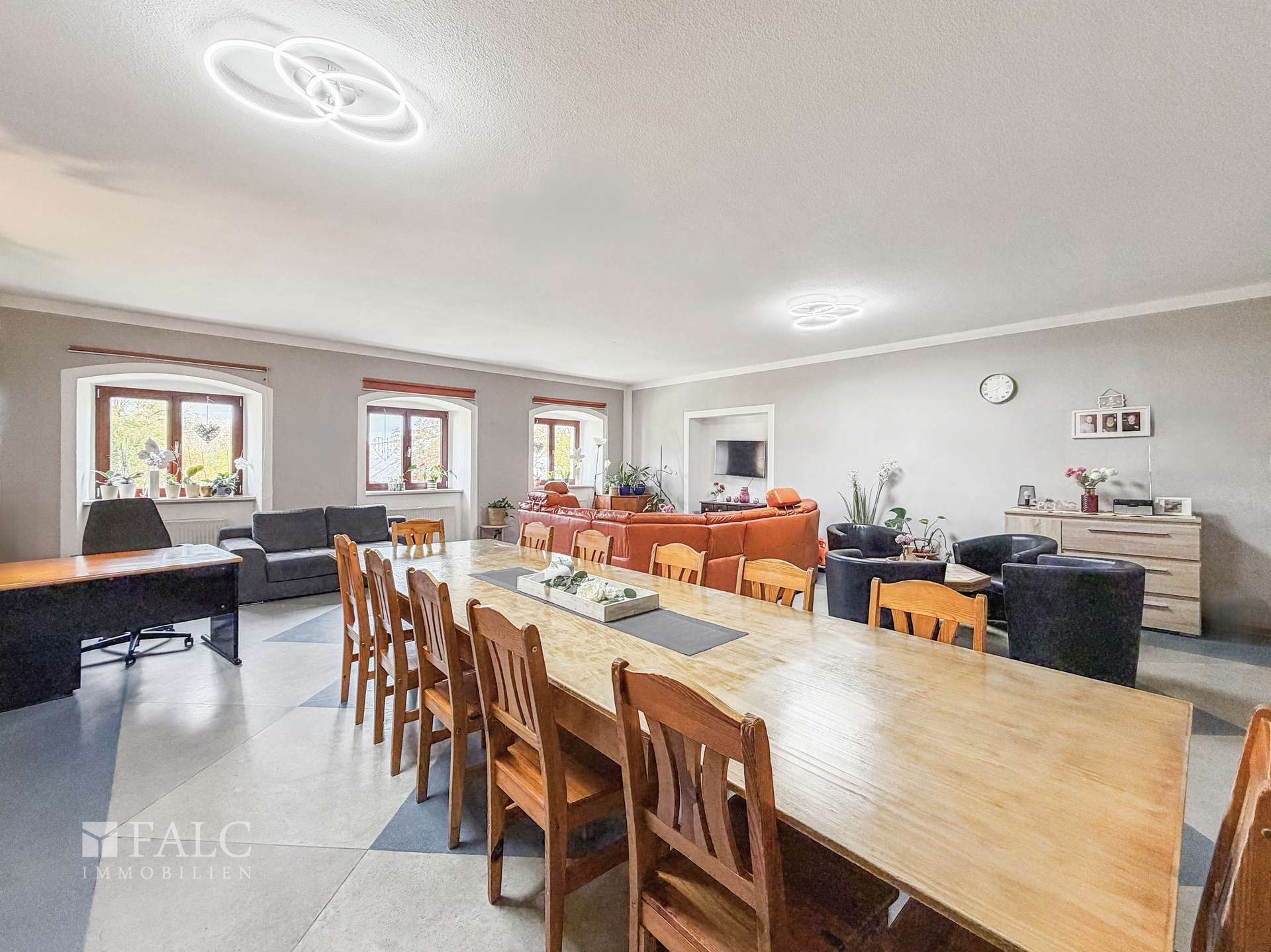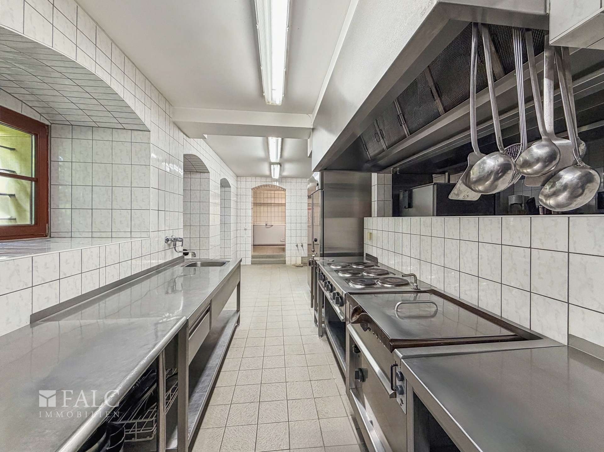 Das Erdgeschoss umfasst derzeit 12 Räume auf ca. 555 m², während das Obergeschoss auf ca. 574 m² weitere 13 Zimmer beherbergt. Die historische Bausubstanz wurde über die vergangenen Jahrzehnte kontinuierlich modernisiert, insbesondere in den Jahren 1996 bis 1998. Zudem wurde die Fassade vor etwa zehn Jahren instand gesetzt. Im Zuge der Modernisierungen wurden unter anderem Elektrik, Fenster, Sanitäranlagen, Heizungsanlage sowie das Dach erneuert. Die Gasheizung stammt aus dem Jahr 1997, Steuergerät, Speicher und Brenner wurden 2024 erneuert. Im ca. 460 m² großen Kellergeschoss befindet sich eine moderne Großküche mit Speiseaufzug – ideal für gastronomische Nutzung, Events oder die Versorgung mehrerer Wohneinheiten. Eine original erhaltene Holztreppe verbindet die Ebenen auf stilvolle Weise und unterstreicht den historischen Charakter des Hauses.