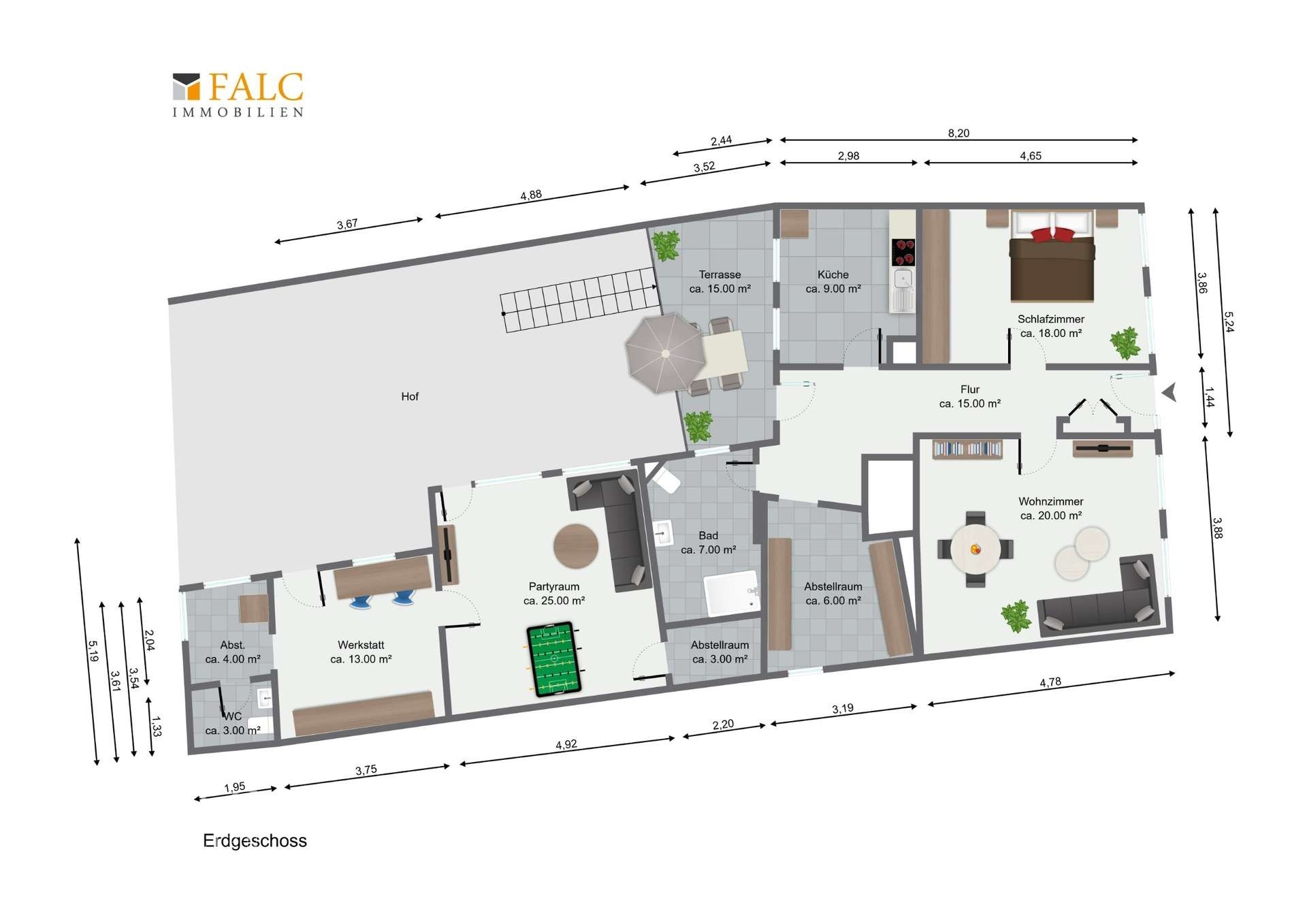 Zur Info. Die Möbel im Wohnzimmer und Schlafzimmer im Erdgeschoss sind digital gestaltet worden. Die Beschaffenheit der Räume ist komplett original belassen.