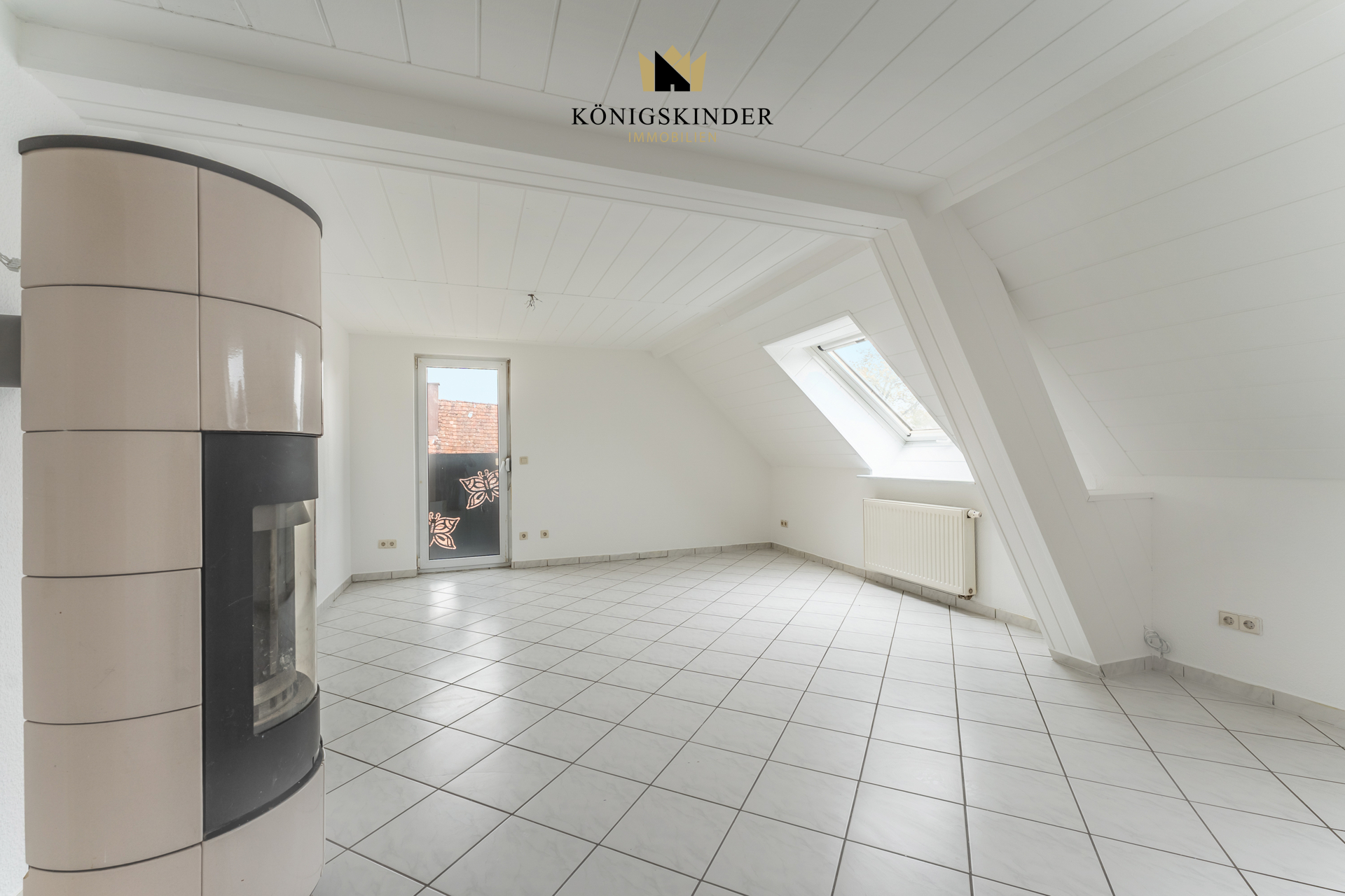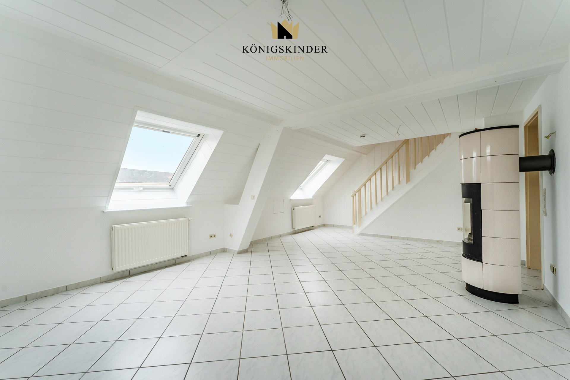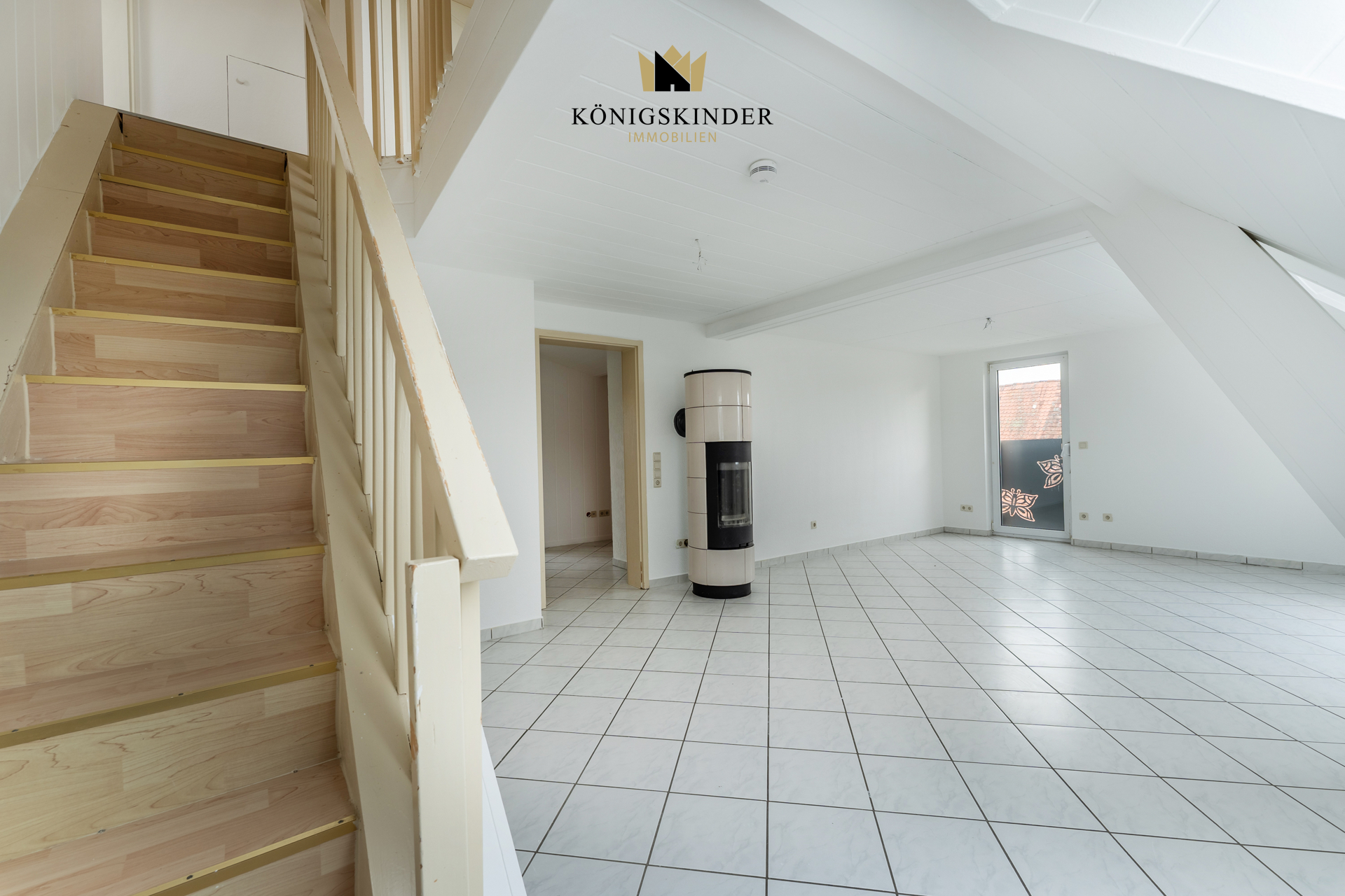 Drei Zimmer gruppieren sich auf zwei Etagen. Ein großes Wohnzimmer mit Kaminofen für schöne gemütliche Abendstunden auf der unteren, sowie ein Schlafzimmer und ein weiters Zimmer - als Kinder-, Gästezimmer, Homeoffice - was immer Sie mögen, auf der Oberen Etage.