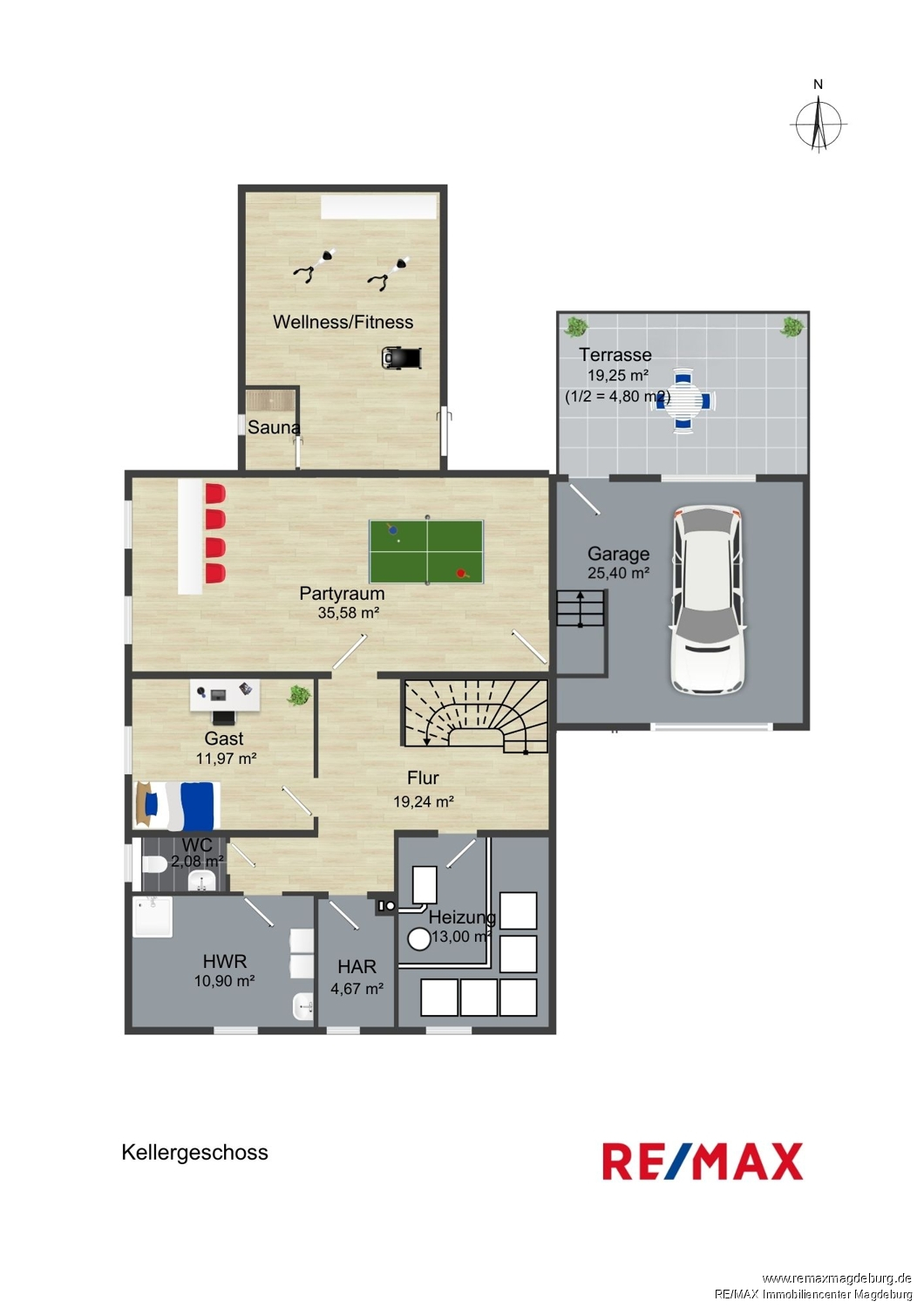Das wohnlich ausgebaute Souterrain ist ein echtes Highlight: Viel mehr als ein klassischer Keller, bietet es zusätzliche, vielseitig nutzbare Räume. Ein großzügiger Hobbyraum eignet sich perfekt für Sport, kreative Projekte oder Ihre Werkstatt. Ein separater Gästebereich oder Rückzugsort für größere Kinder schafft Flexibilität im Alltag. Der einladende Partyraum bietet Platz für gesellige Stunden. Aus einem bestehenden Raum mit Sauna schaffen Sie im Handumdrehen Ihren eigenen Wellness- und Sportbereich – ein Ort zum Entspannen und Wohlfühlen. Abgerundet wird das Untergeschoss durch praktische Wirtschafts- und Lagerräume.