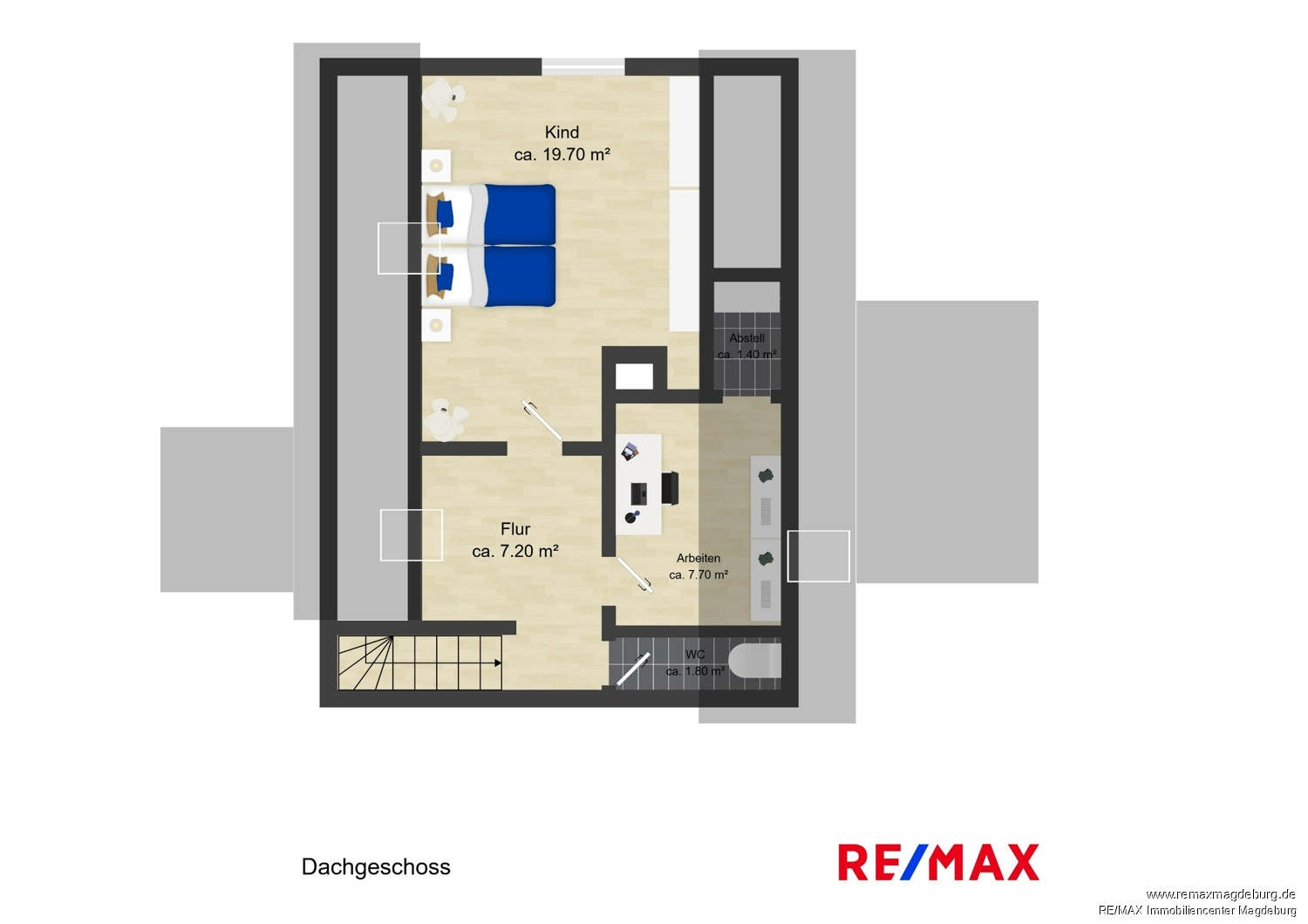 Im Dachgeschoss erwarten Sie ein weiteres WC, ein kleines Zimmer, das sich ideal als Büro, Gäste- oder Kinderzimmer eignet, sowie ein großzügig geschnittenes Schlafzimmer – perfekt als Rückzugsort oder zweites Schlafzimmer. Alle Fenster des Hauses sind mit Rollläden ausgestattet, die für zusätzlichen Komfort, Sichtschutz und bessere Wärmedämmung sorgen.