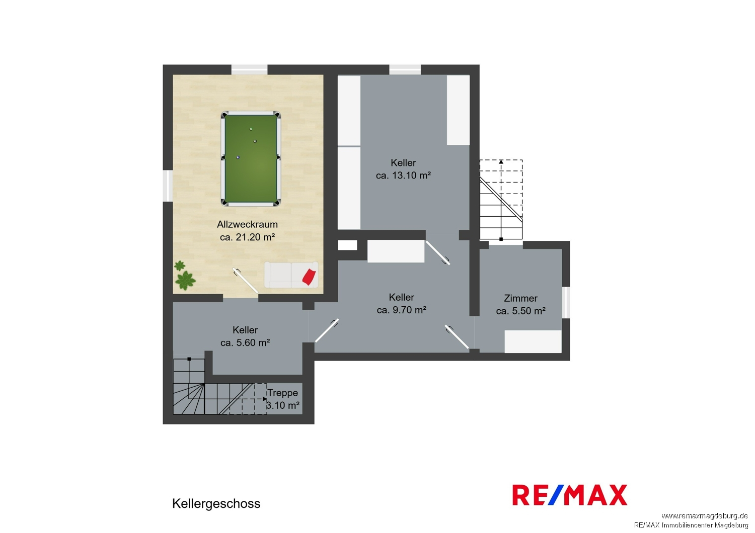 Keller: - Flur, - Großer Raum, - Heizungsraum/ Werkstatt, - Flur mit Ausgang zum Garten,