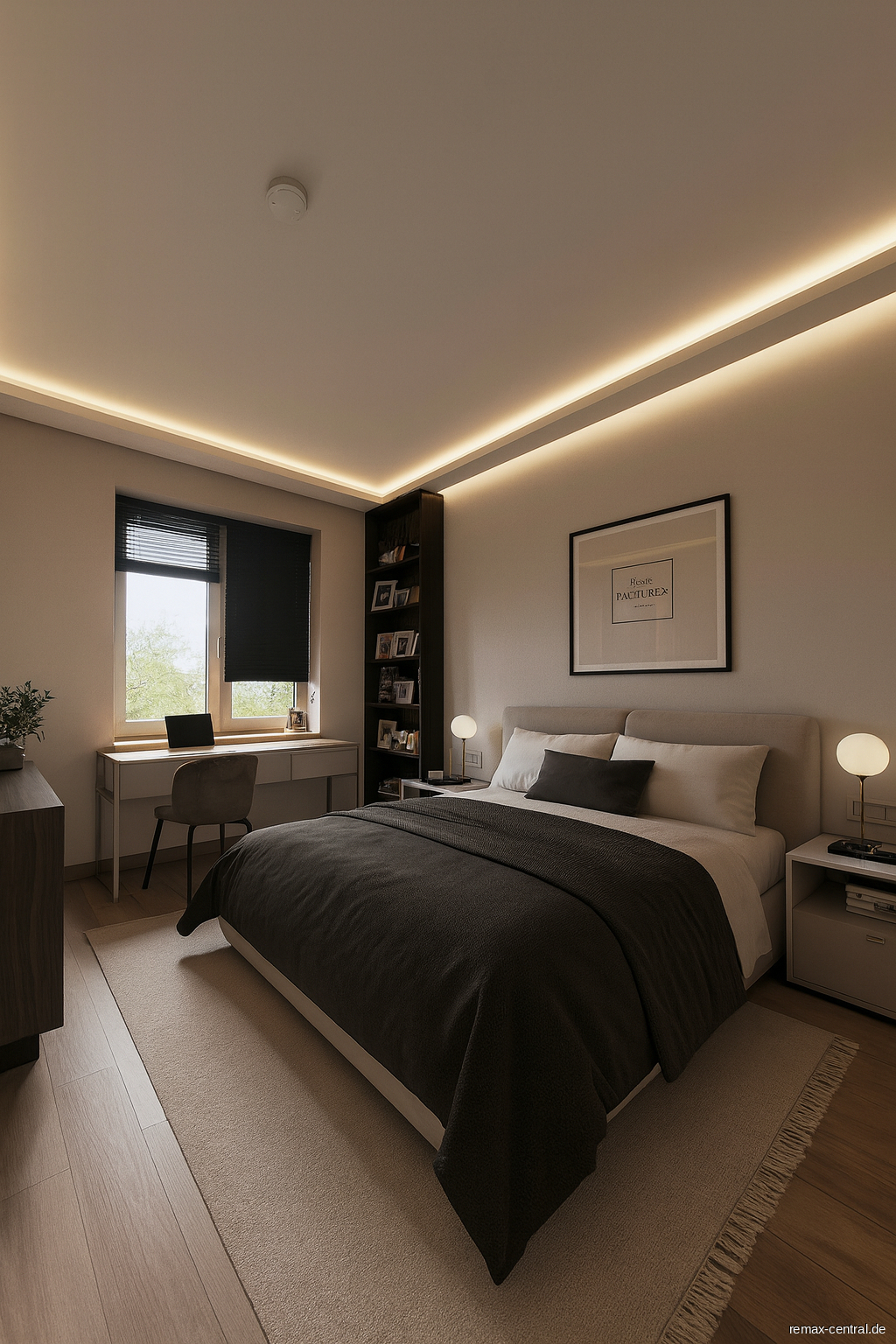Das Schlafzimmer verfügt über große Fenster, durch die Tageslicht durchdringen kann.