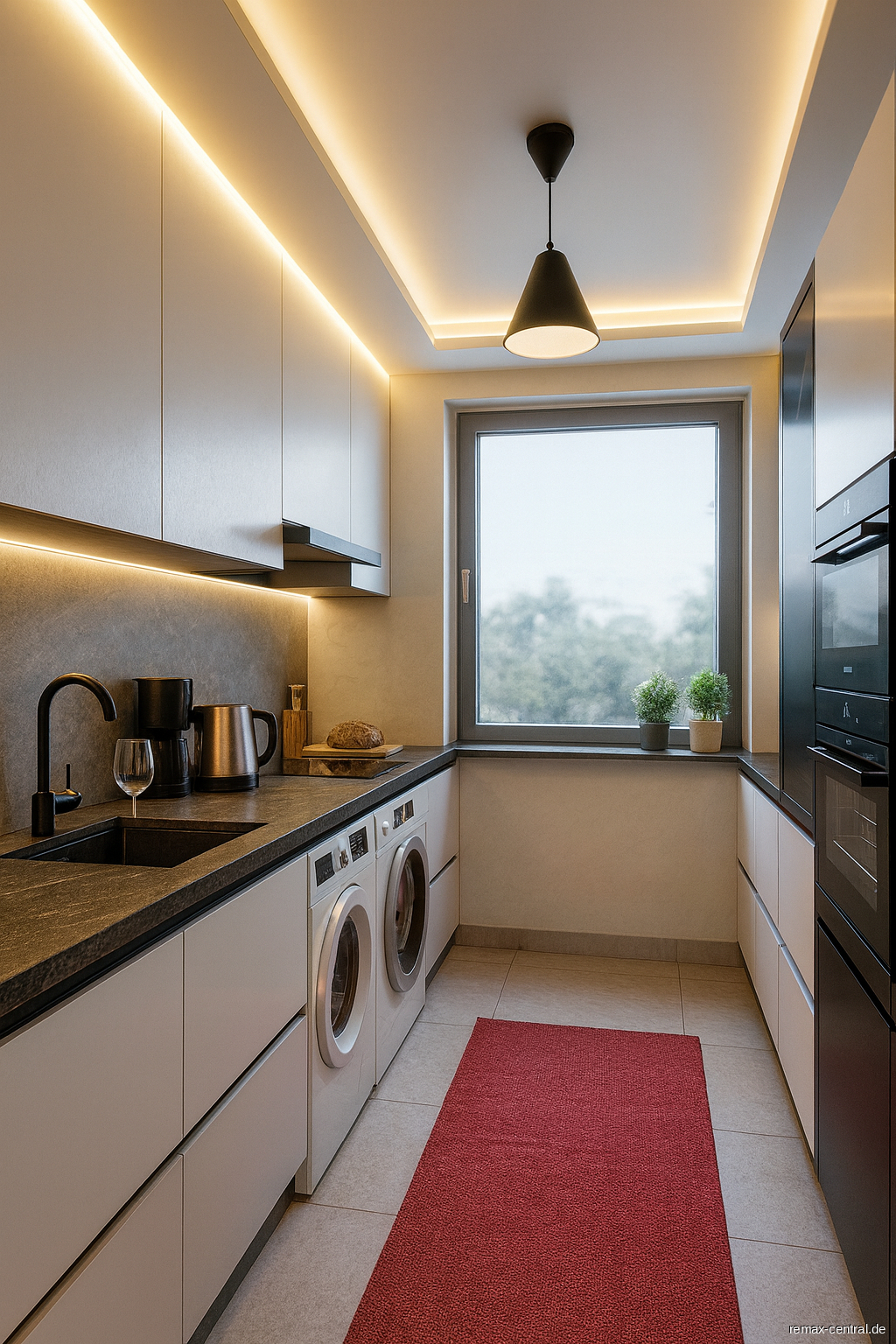 Eine separate helle Küche ist mit pflegeleichten Bodenfliesen ausgestattet.
