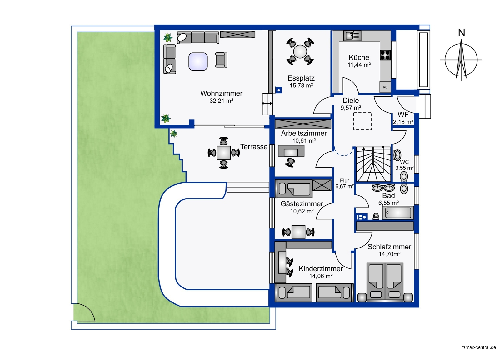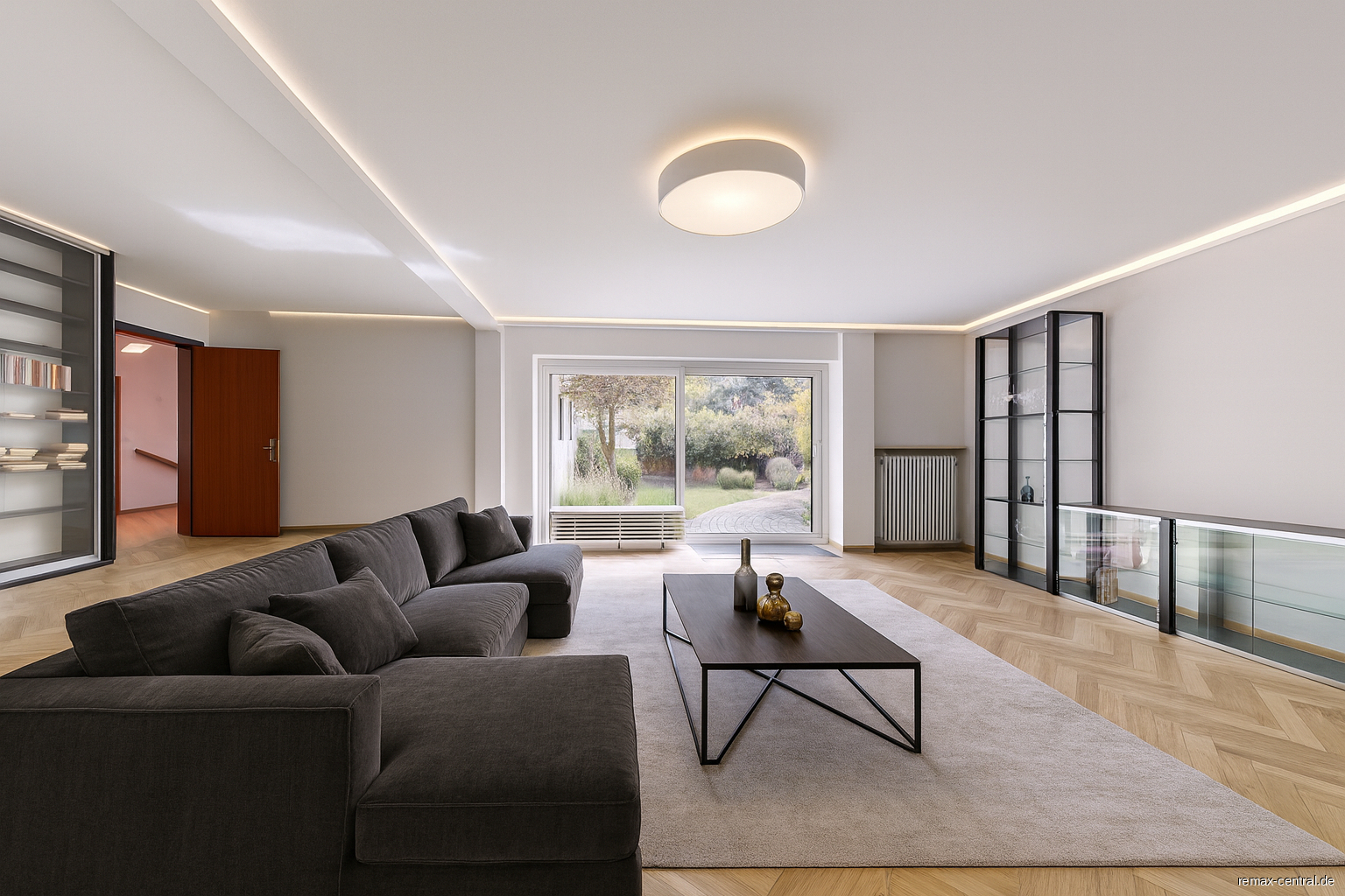 Der Hauptwohnbereich präsentiert sich offen und freundlich. Vom Wohnzimmer aus gelangen Sie direkt in den gepflegten Garten, der viel Platz für Erholung und Freizeit bietet. Ein besonderes Highlight sind die raumhohen Bücherregale und der Split-Level-Charakter des Wohnzimmers – Elemente, die für eine einzigartige Raumwirkung und eine behagliche Atmosphäre sorgen.