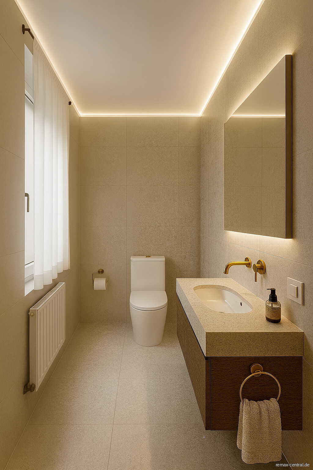 Die Ausstattung zeigt sich abwechslungsreich: Neben modernen Bädern mit Glasduschabtrennungen findet sich ein zusätzliches Gäste-WC, dessen individuelle Gestaltung dem Haus eine besondere Note verleiht. Stauraum ist reichlich vorhanden – von hochwertigen Einbauschränken bis hin zu Vitrinen. Die Küche ist klassisch gehalten und bietet viel Potenzial für eine moderne Neugestaltung nach Ihren persönlichen Vorstellungen.