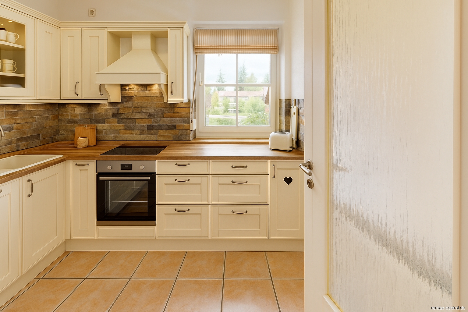 Ein paar Stufen führen Sie ins Hochparterre – durch den Eingang betreten Sie zunächst einen zentralen Flur, von dem alle Bereiche aus erreichbar sind. Die separate Küche im Landhausstil mit Gaskochfeld bietet großzügig Platz für alle Gelegenheiten – ob entspanntes Frühstück mit der Morgenzeitung, ausgiebiger Brunch am Wochenende oder das festliche Abendessen mit Gästen.
