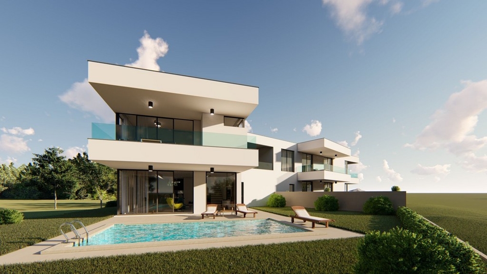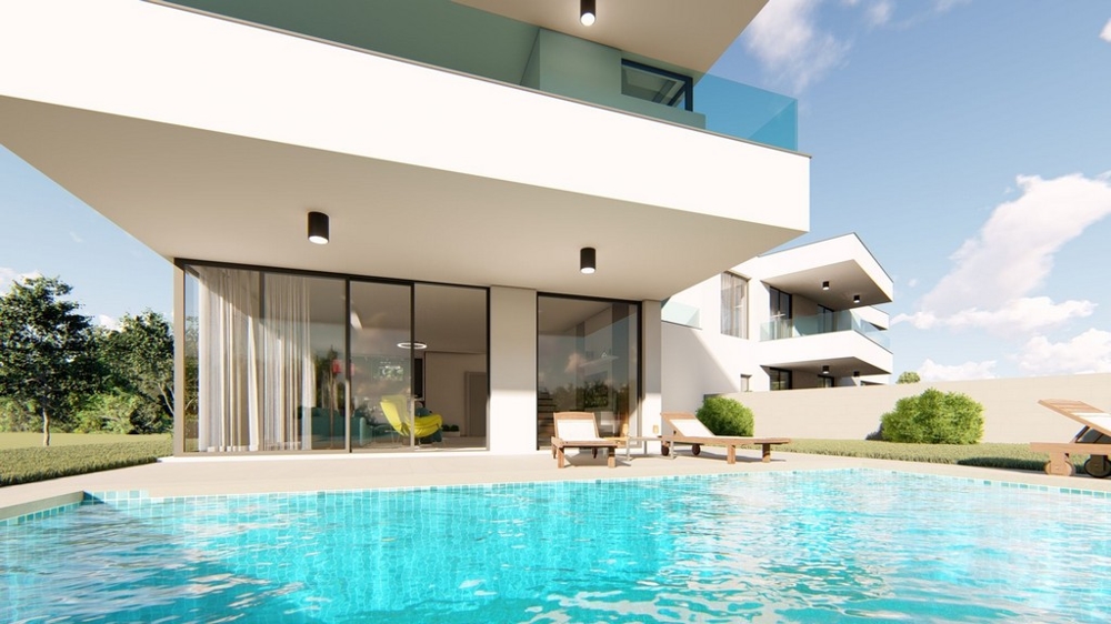 Diese Doppelhaushälfte wurde im modernen Stil erbaut und bietet eine Wohnfläche von 191 m² auf zwei Etagen. Im Erdgeschoss befindet sich eine Taverne mit einer Waschküche, ein Gäste WC, ein offenes Wohnzimmer, eine geräumige Küche mit Essbereich sowie Zugang zur 40 m² großen Terrasse und dem Garten mit Pool und Grillplatz.