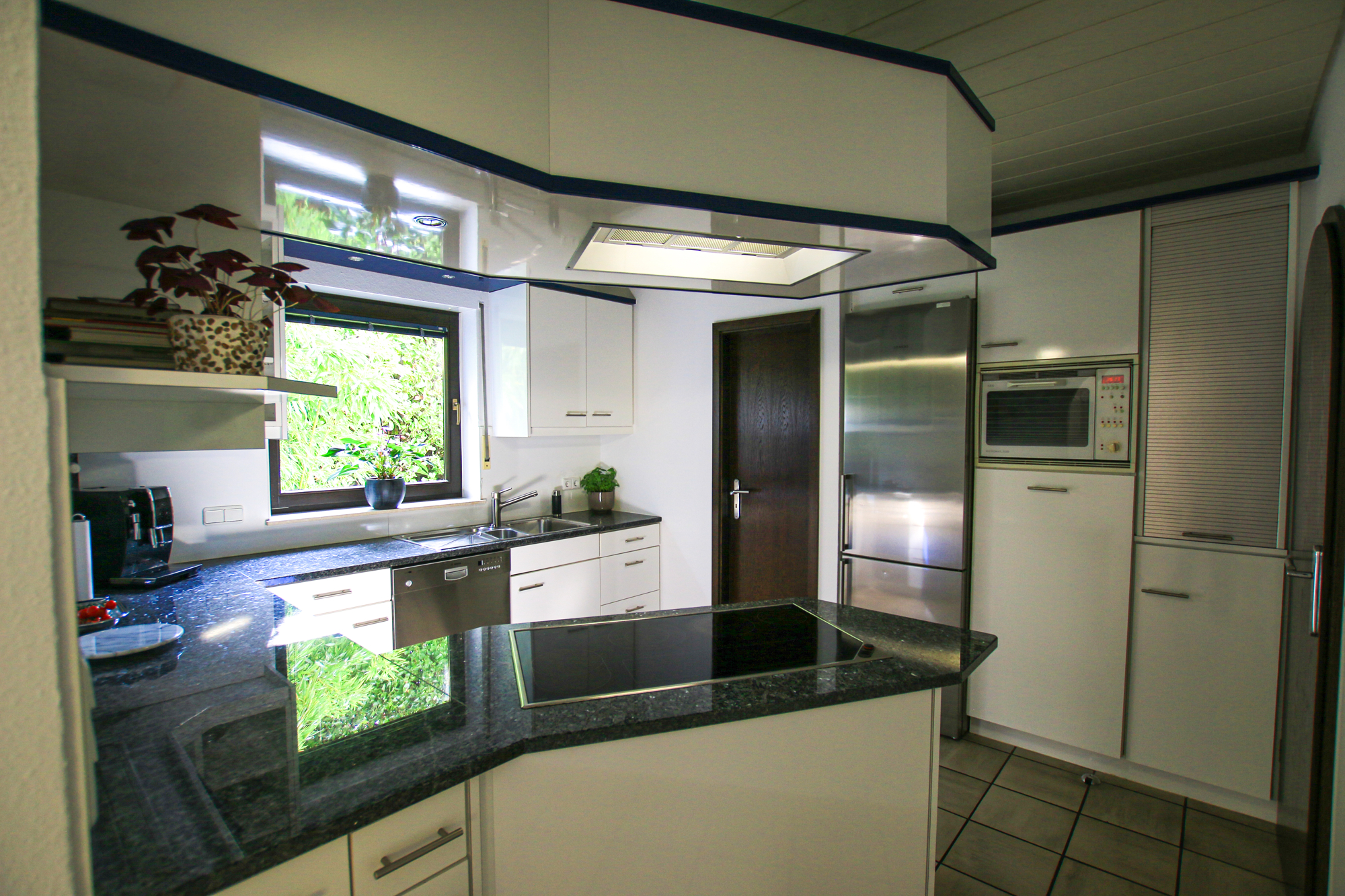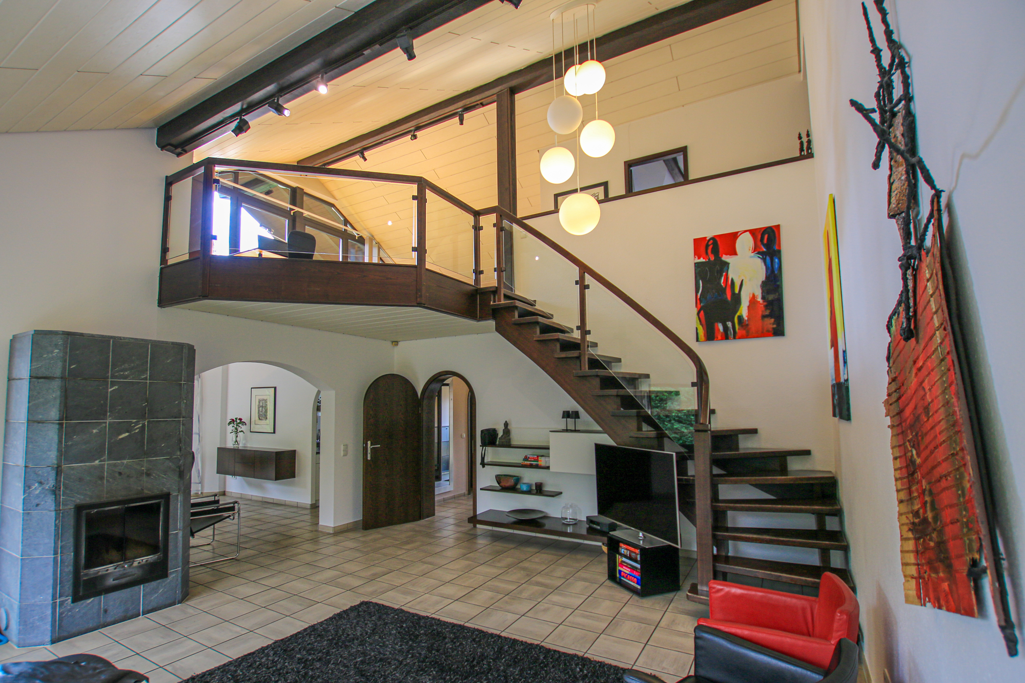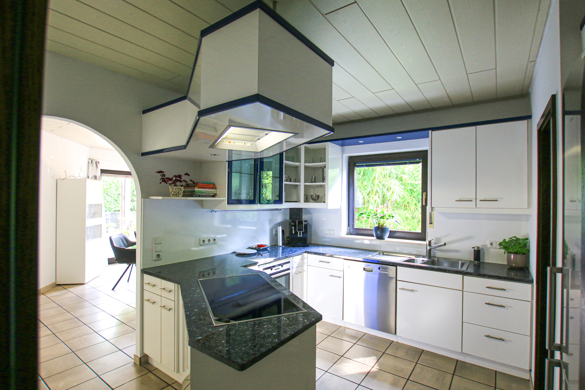 Eine durchgehende Blickachse, ausgehend von der Haustür, weist den Weg zum Wohn-/Esszimmer und weiter zum Balkon und in den Garten. Der L-förmige Wohn-/Essbereich lässt staunen, denn dieser ist wirklich außergewöhnlich und repräsentativ! Links lässt der offene, verglaste Treppenaufgang zur Galerie und bis zum First blicken, geradeaus geben die großen Fensterelemente den Blick in's Grüne frei und rechts befinden sich der verglaste Speckstein-Heizkamin sowie der Zugang zum Balkon. Vor dem Kamin, auf der rechten Seite, führt ein Bogen-Durchgang zum sechseckig gestalteten Essbereich, welcher auf der einen Seite zum Balkon bzw. zum Garten und auf der anderen Seite direkt zur Küche führt. Diese verfügt u. a. über Granit-Arbeitsplatten, Rückwandverkleidungen, eine Insel-Esse und einen separaten Vorratsraum.