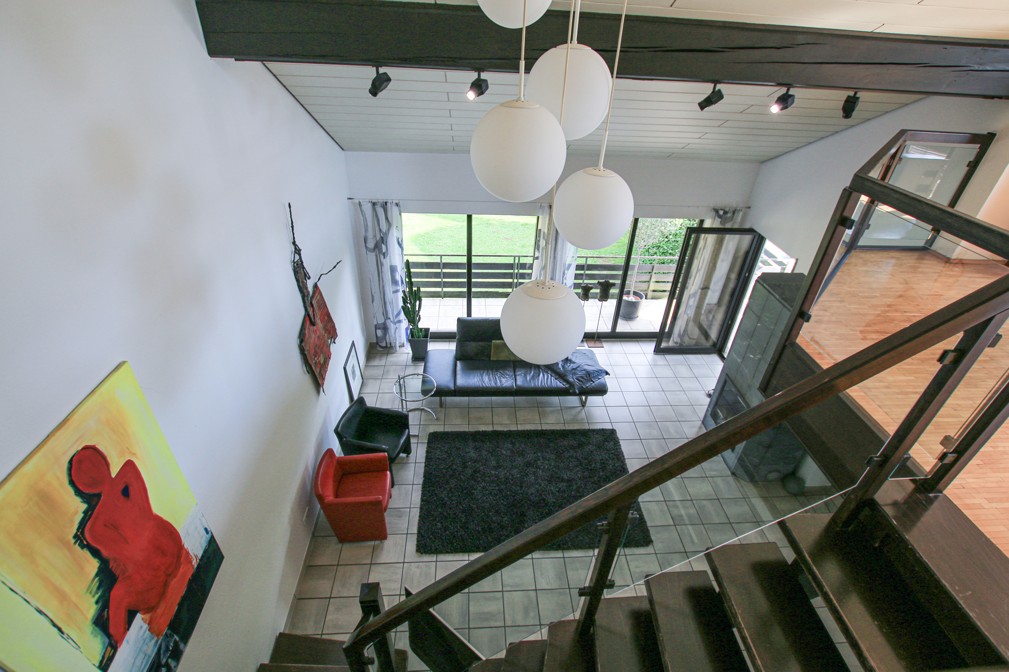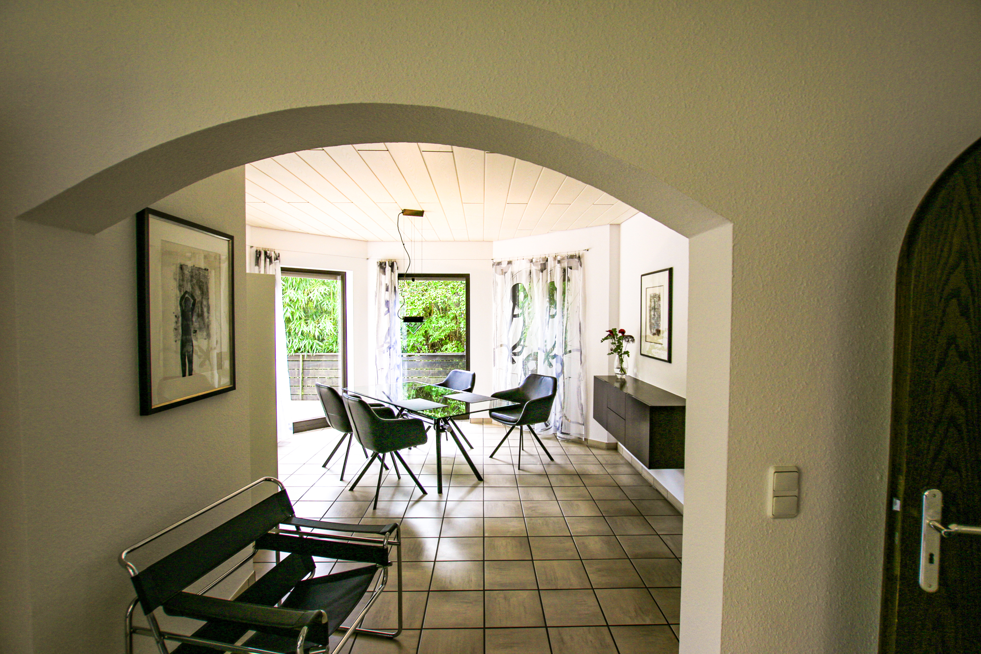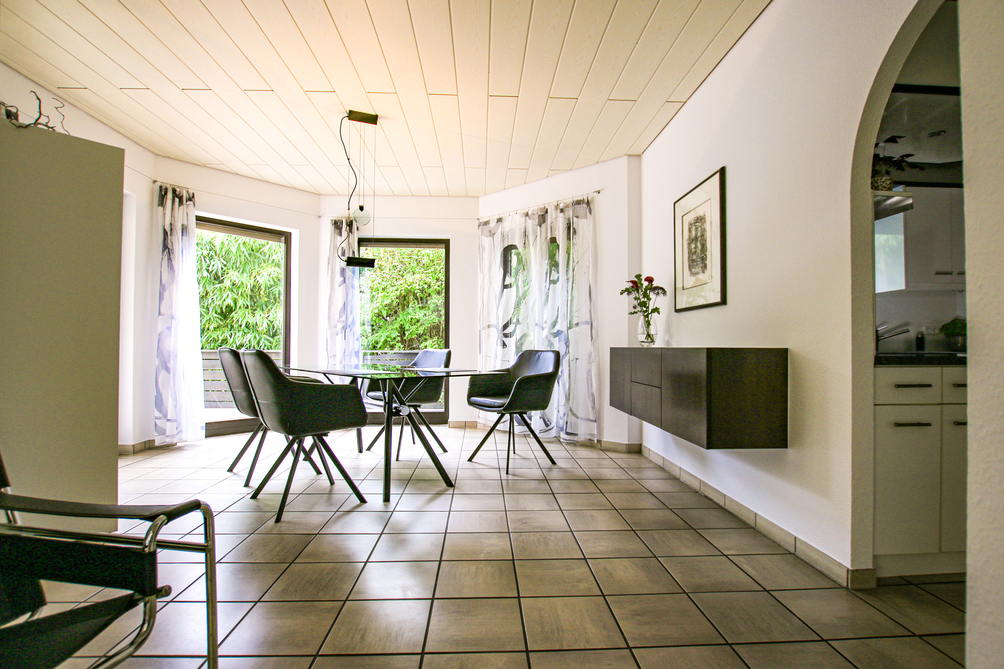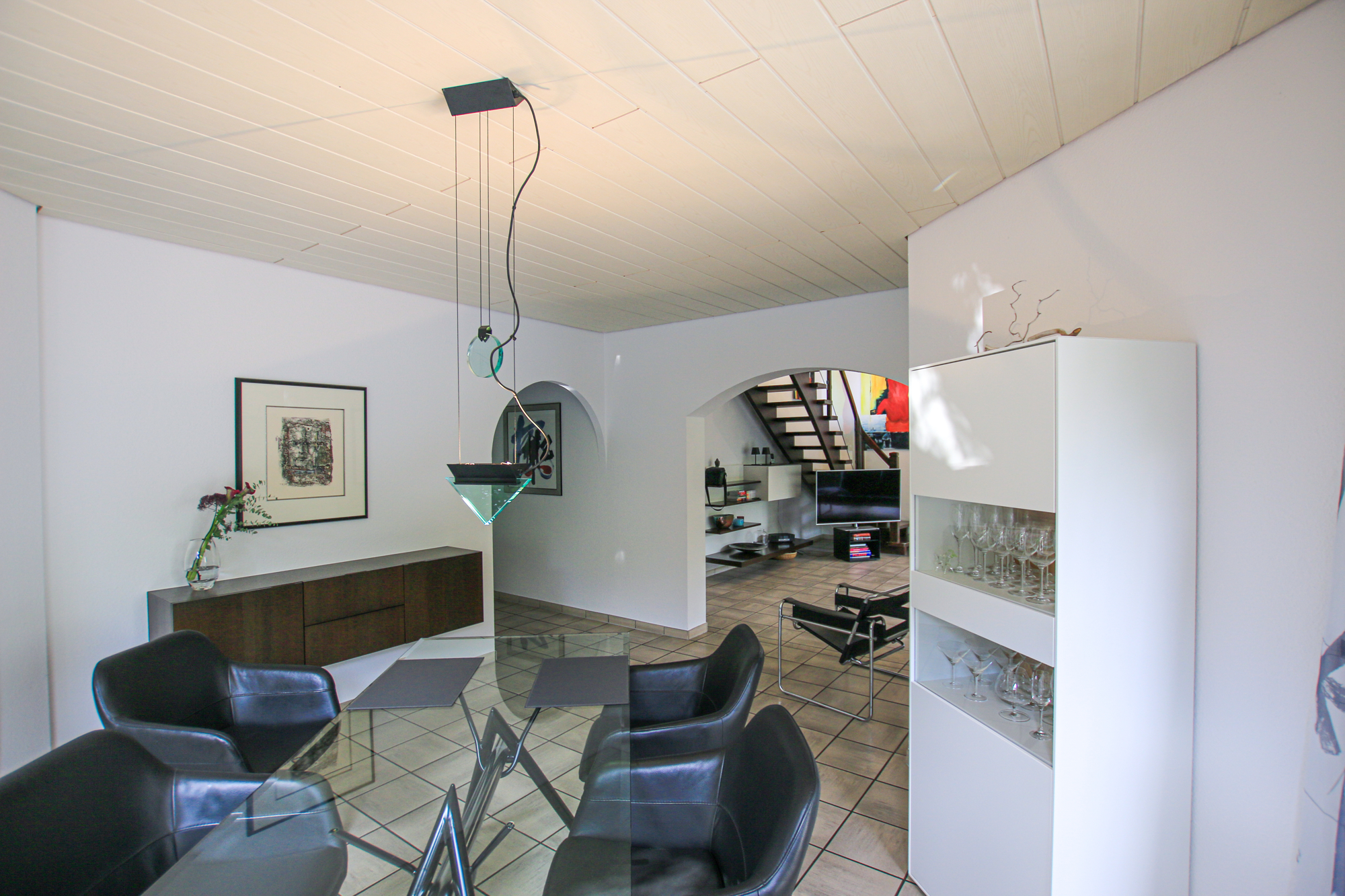 Eine durchgehende Blickachse, ausgehend von der Haustür, weist den Weg zum Wohn-/Esszimmer und weiter zum Balkon und in den Garten. Der L-förmige Wohn-/Essbereich lässt staunen, denn dieser ist wirklich außergewöhnlich und repräsentativ! Links lässt der offene, verglaste Treppenaufgang zur Galerie und bis zum First blicken, geradeaus geben die großen Fensterelemente den Blick in's Grüne frei und rechts befinden sich der verglaste Speckstein-Heizkamin sowie der Zugang zum Balkon. Vor dem Kamin, auf der rechten Seite, führt ein Bogen-Durchgang zum sechseckig gestalteten Essbereich, welcher auf der einen Seite zum Balkon bzw. zum Garten und auf der anderen Seite direkt zur Küche führt. Diese verfügt u. a. über Granit-Arbeitsplatten, Rückwandverkleidungen, eine Insel-Esse und einen separaten Vorratsraum.