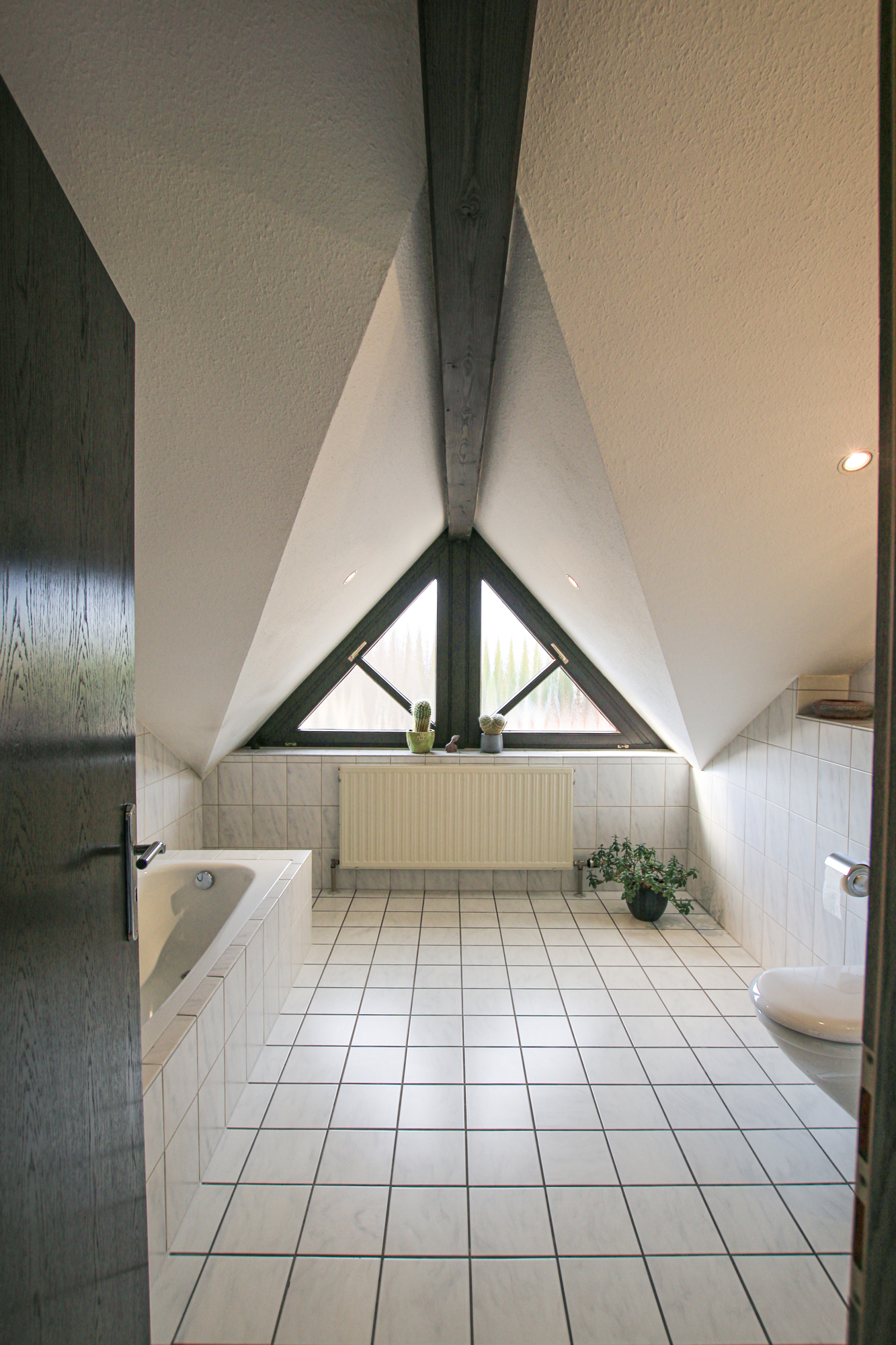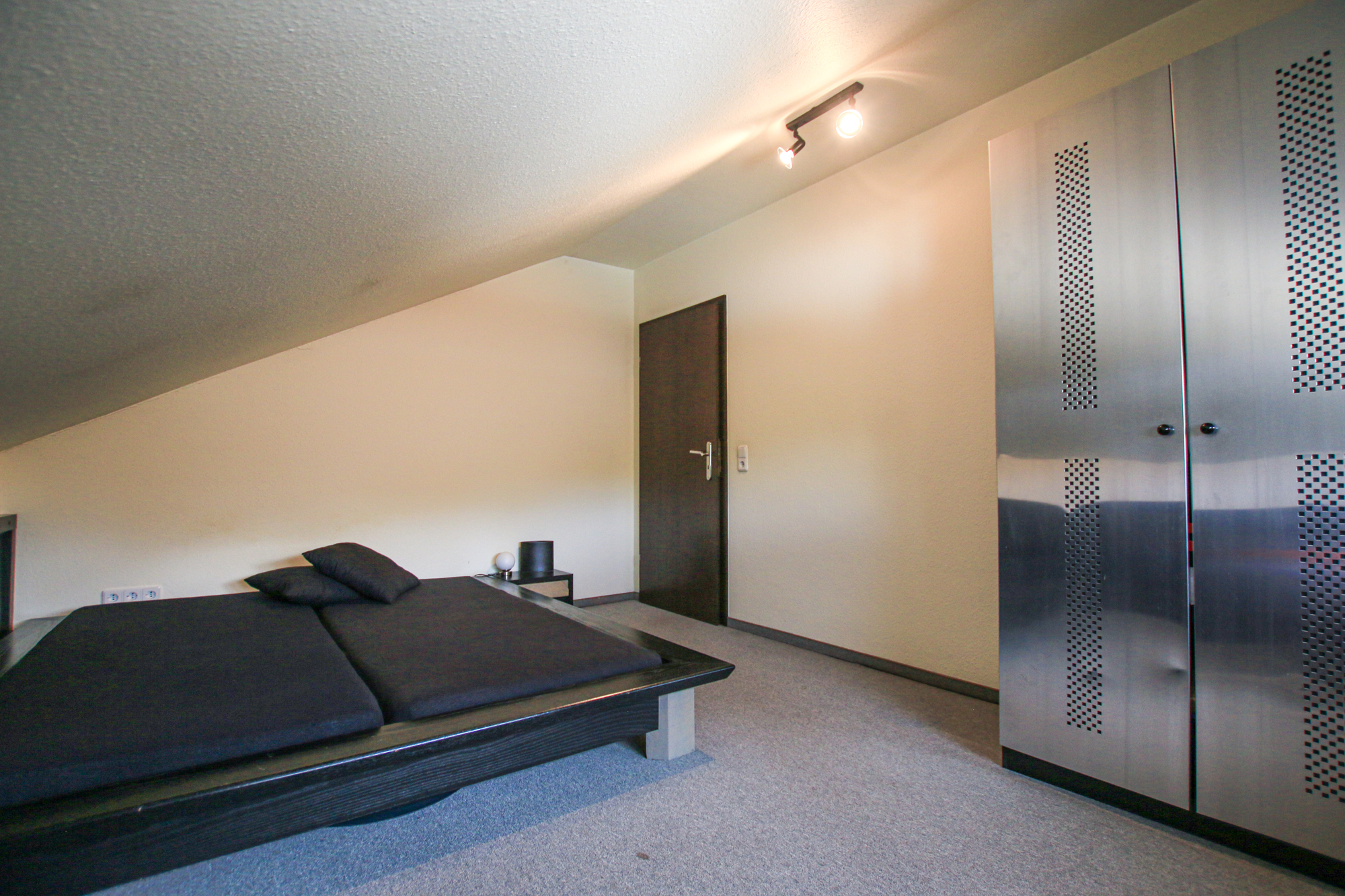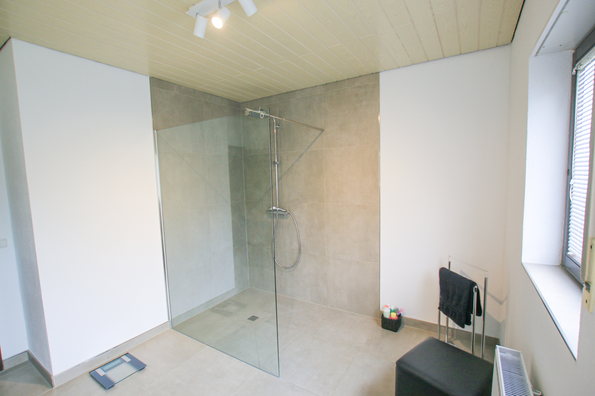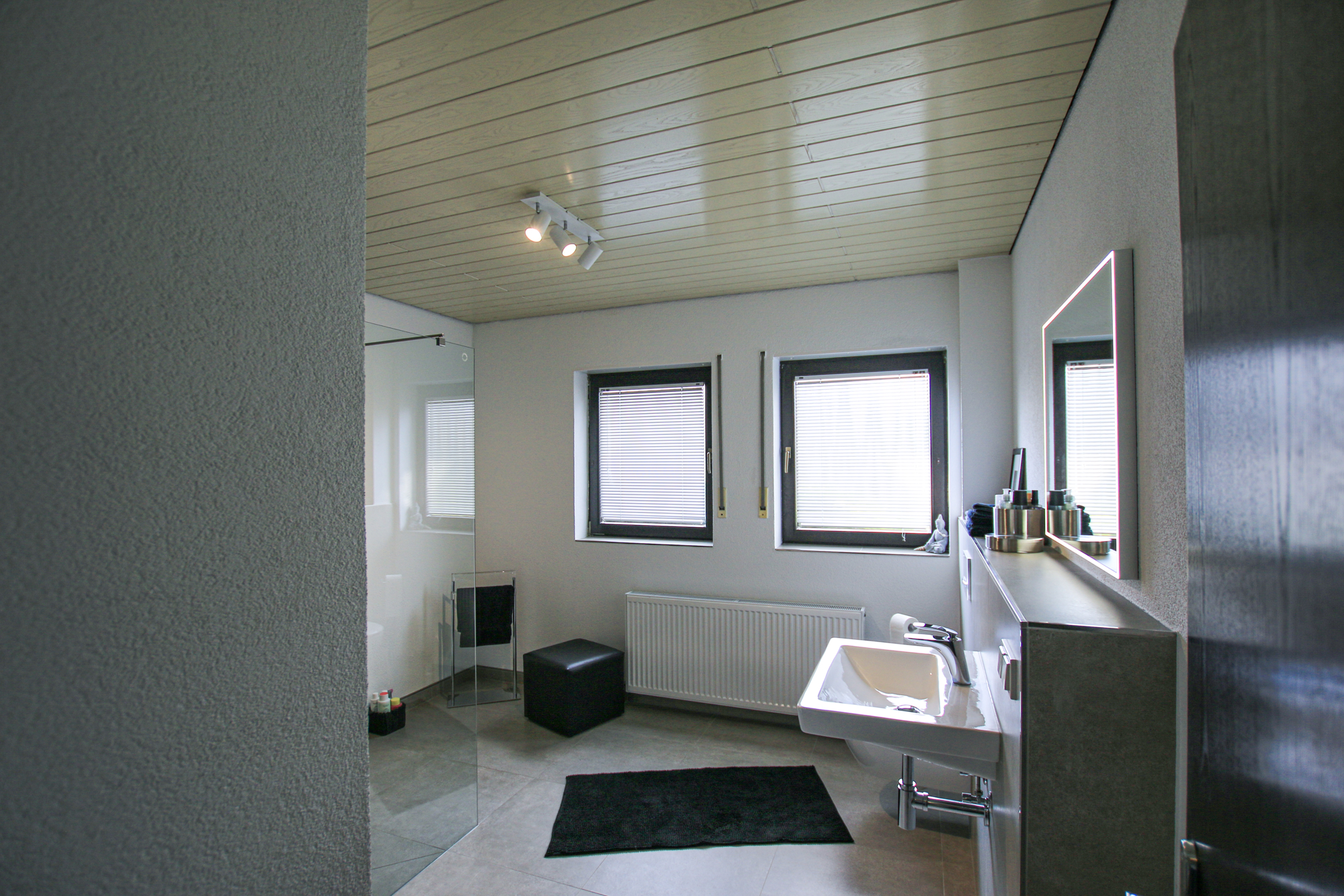 Zum anfangs erwähnten "Privatbereich" gelangen Sie durch den seitlichen Flur, vorbei am geschlossenern Treppenabgang zum UG sowie an dezenten Einbauschränken. Hier befindet sich das geräumige Badezimmer. Dieses bietet einen imposanten, verglasten Duschbereich und ist großformatig gefliest. Das Kinder- bzw. Arbeitszimmer sowie das große Eltern-Schlafzimmer mit dem separaten Ankleideraum besitzen jeweils einen Zugang zur Dachterrasse über der Garage.