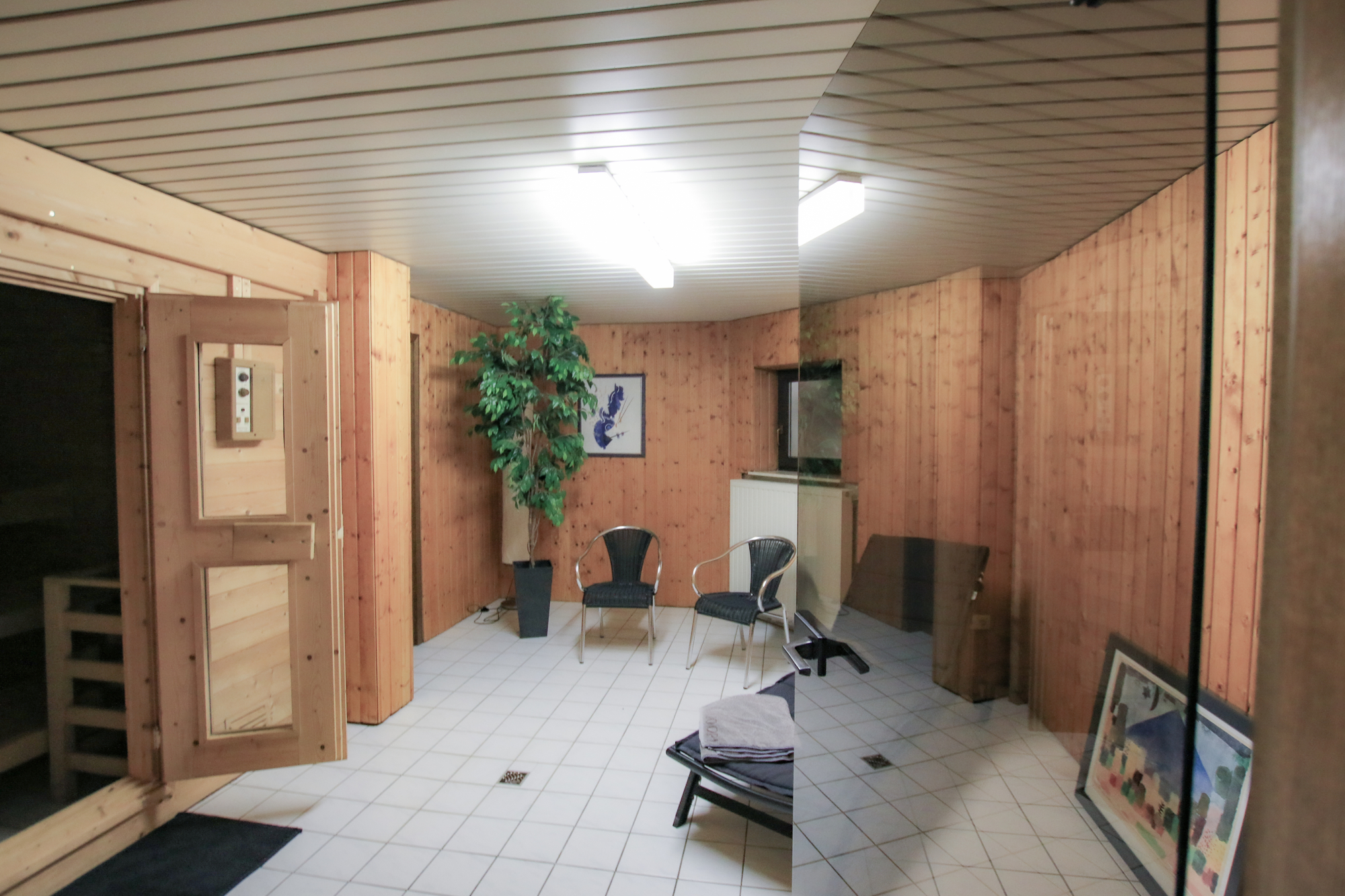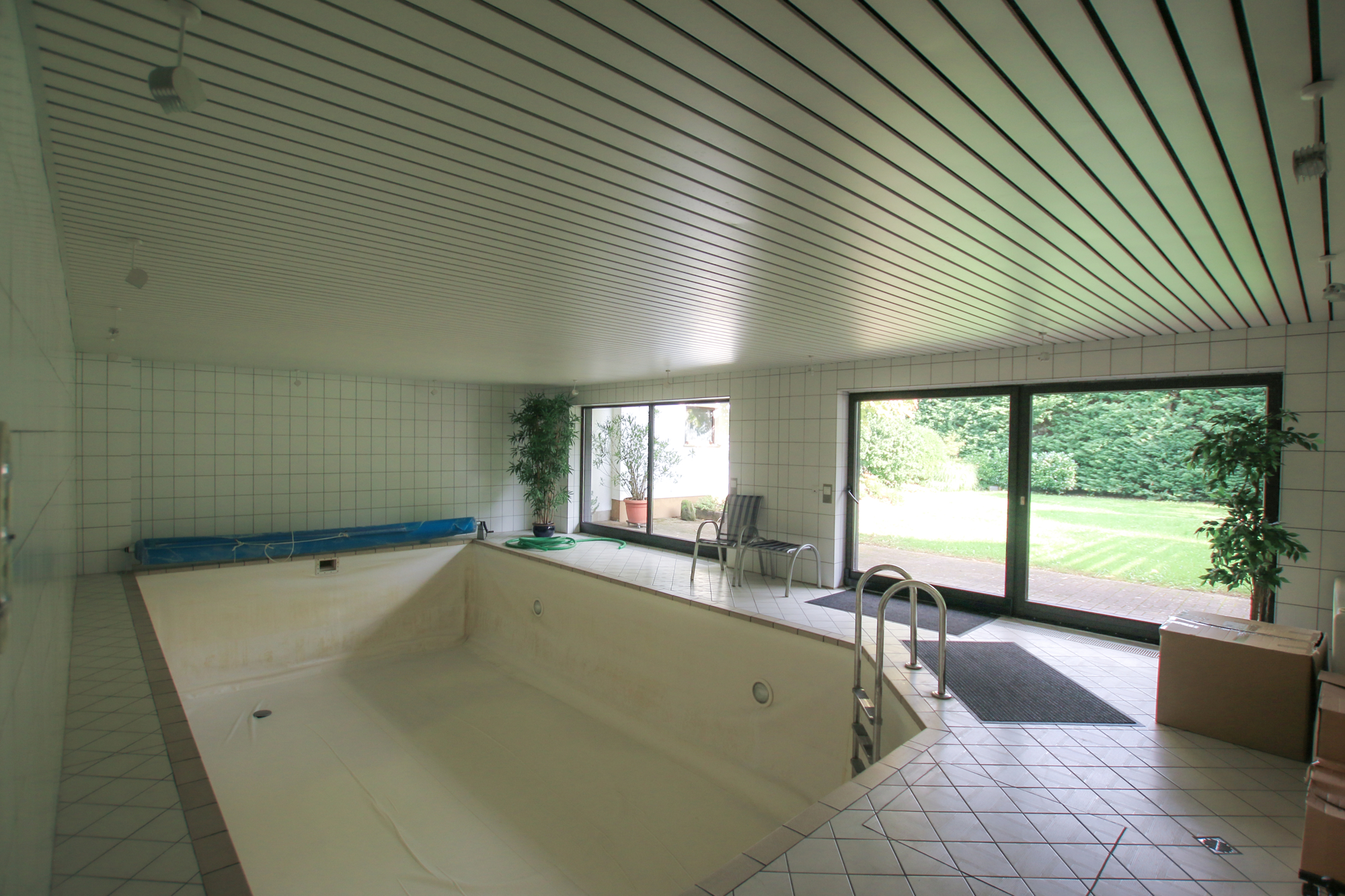 Diese Etage als "Keller" zu bezeichnen, wäre eine Beleidigung! Die Diele erschließt zunächst links einen Wasch- bzw. Abstellraum, der zum Heizungsraum mit sep. Öllager führt. Dann kommt aber der hohe Freizeitwert dieser Immobilie zum Vorschein: - Einerseits in Form des Partyraums (mit Theke und Zapfanlage), andererseits lässt die große Schwimmhalle samt 8 x 4 Meter großem Innenpool staunen! Hier stehen angrenzend noch die Sauna mit Ruheraum sowie ein Duschbad zur Verfügung. An die Schwimmhalle schließt die große, teilüberdachte Terrasse an, die in den Gartenbereich übergeht. Sichtschutz und Privatsphäre bietet hier eine großen Hecke.