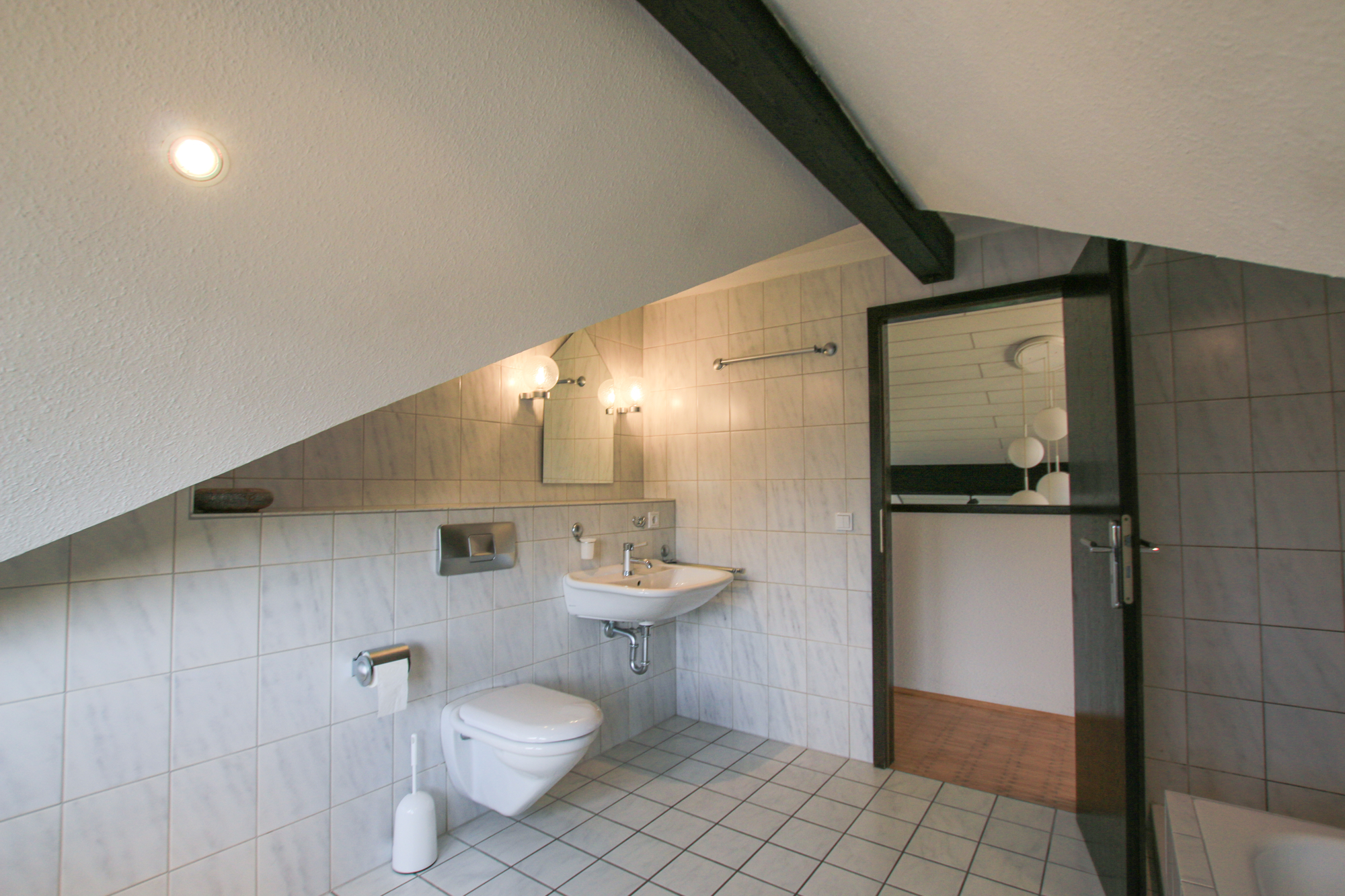Die imposante Galerie könnte man ganz kurz so beschreiben: Traumhaft! - Ein großer, luftiger Raum, lichtdurchflutet durch den verglasten Giebel, davor die große Loggia, helle Decken-Paneele bis zum First, dazu Stäbchenparkett am Boden... - Einen schöneren Arbeitsbereich kann man sich nicht wünschen! Ein Flur führt zu einem Badezimmer, das mit Wanne und Dusche ausgestattet ist, und es stehen noch zwei Räume zur Verfügung, die als Gäste-, Kinder- oder Hobbyzimmer genutzt werden können.