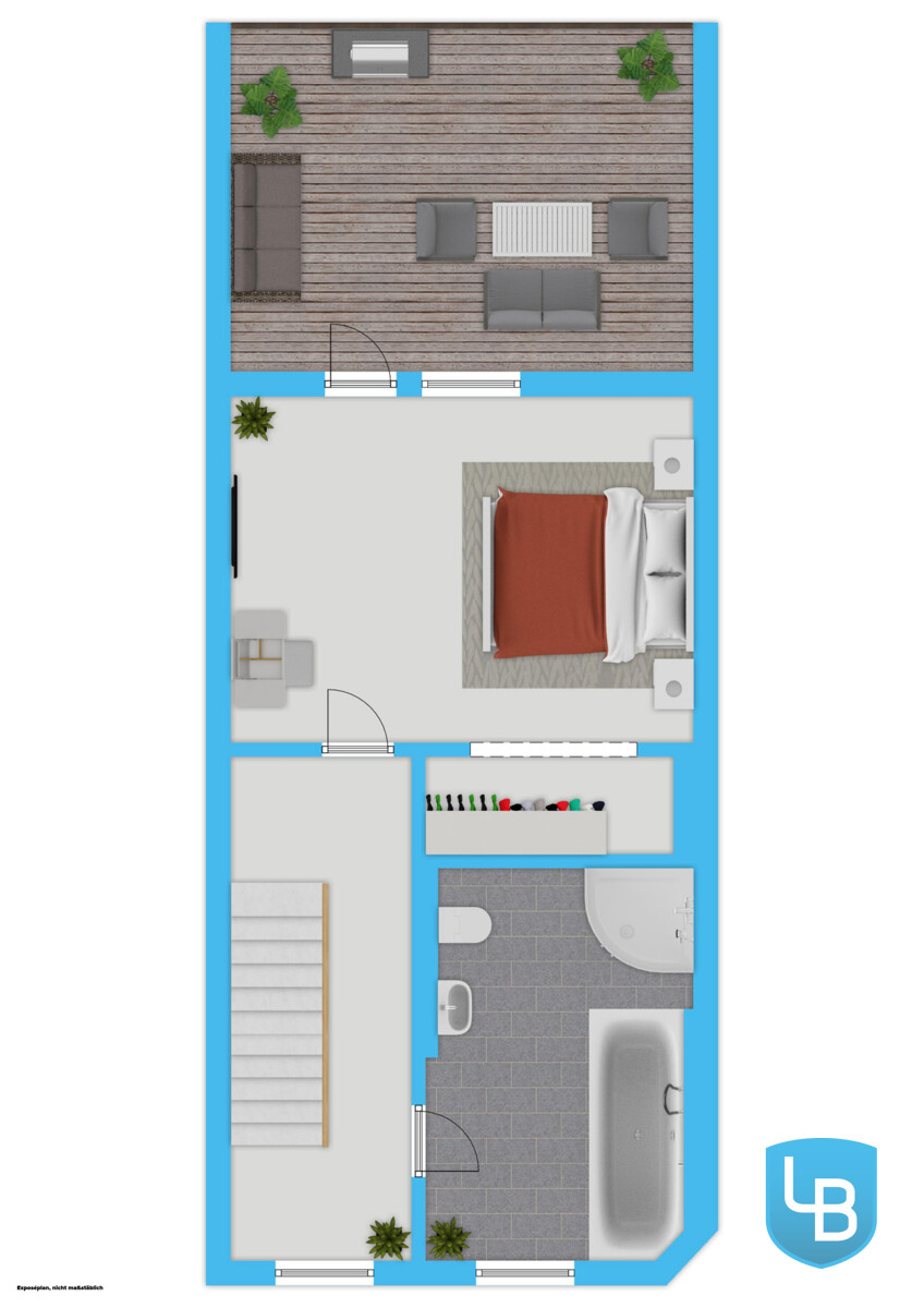 + Schlafzimmer mit Zugang zur Dachterrasse + Badezimmer mit Dusche und Badewanne