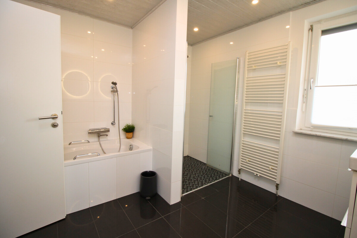 Im Erdgeschoss befindet sich zudem ein Gäste-WC mit Dusche, das durch seine moderne Gestaltung überzeugt. Der Zugang zum Garten erfolgt über den Wohnbereich und lädt mit einer Terrasse zum Entspannen ein.