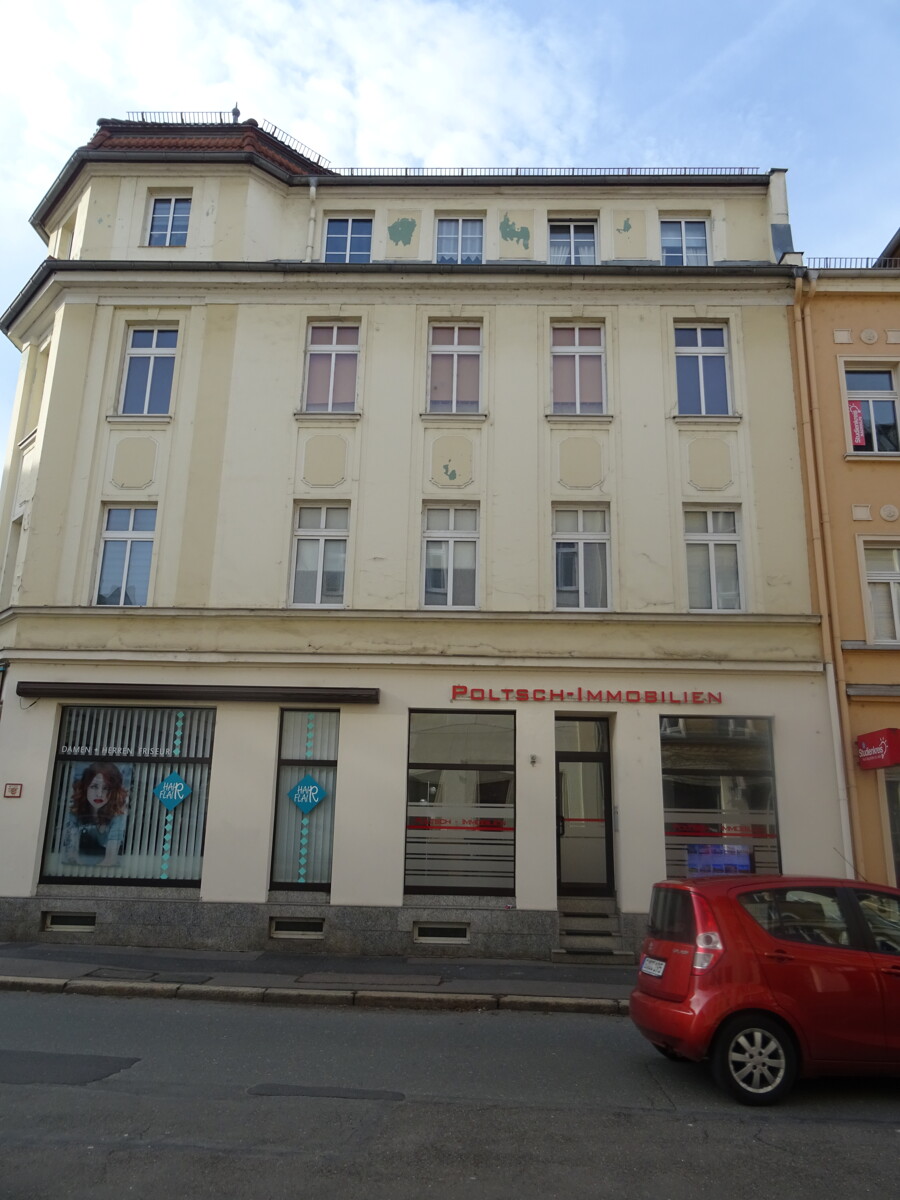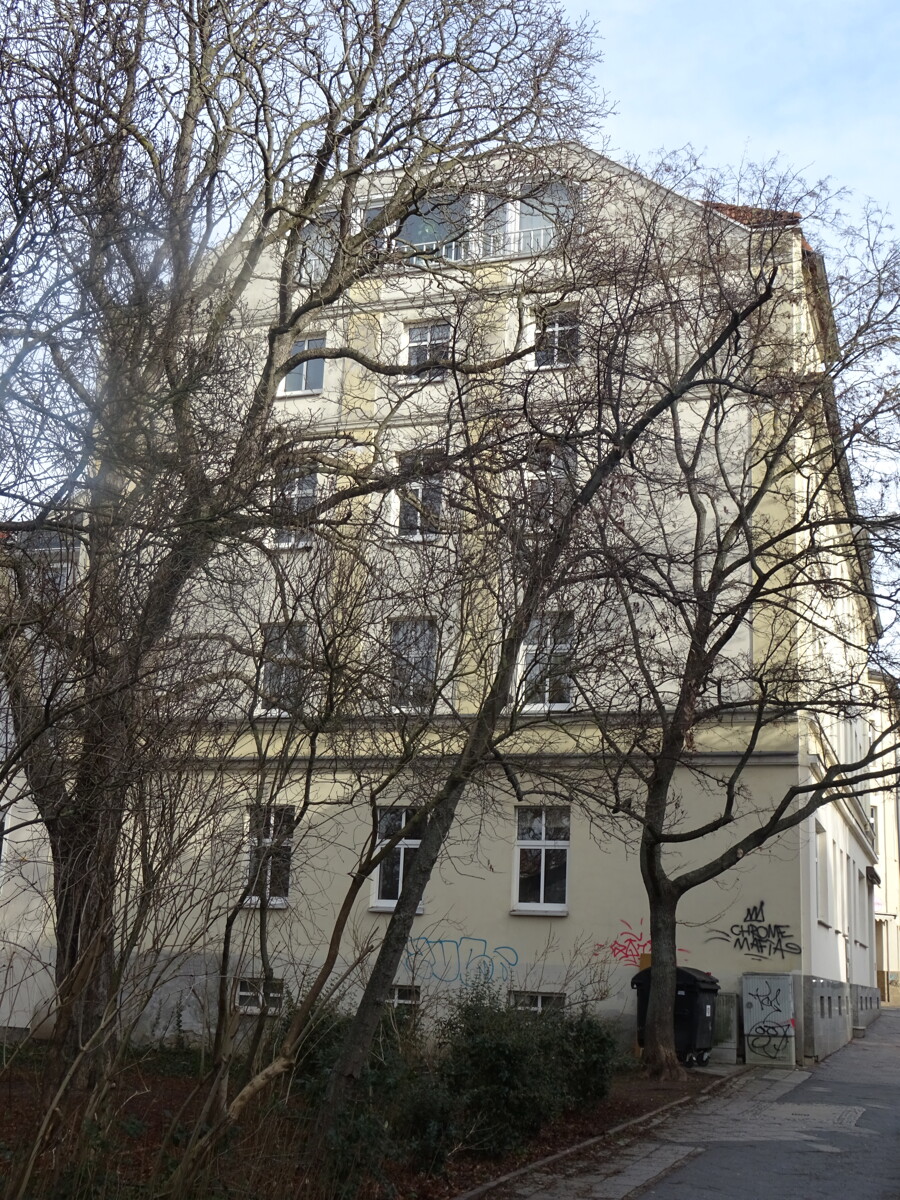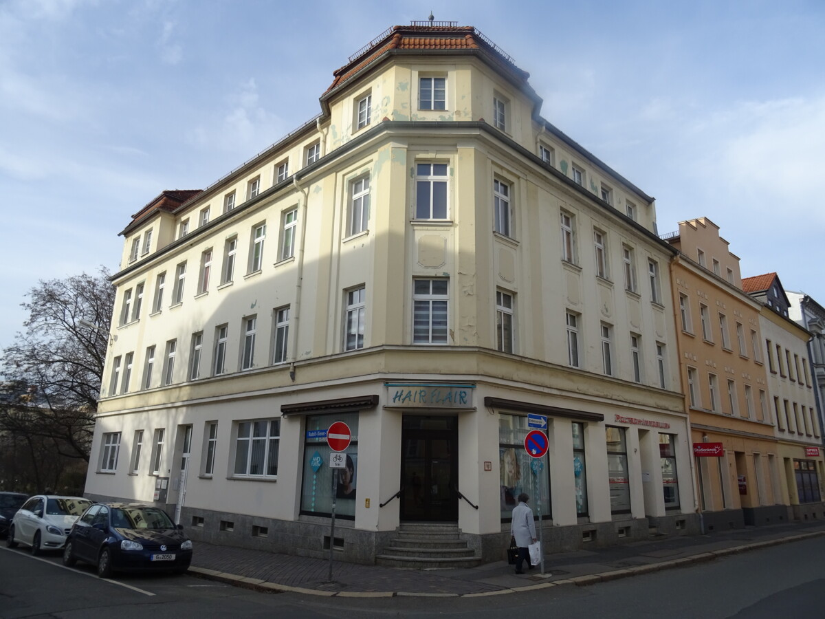 Das Wohn- und Geschäftshaus wurde um 1910 als Reiheneckhaus an der Kreuzung Rudolf-Diener-Straße / Humboldtstraße errichtet.