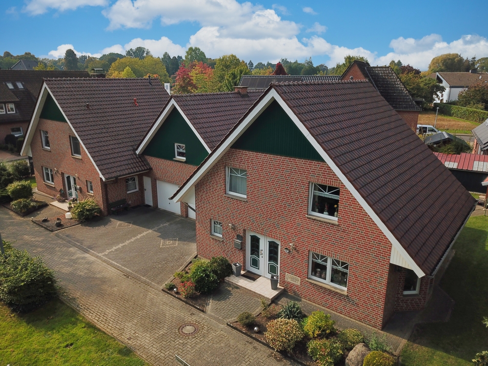 Dieses im Jahr 2003 erbaute Doppelhaus steht auf einem Gesamtgrundstück von ca. 862 m² und bietet in jeder Haushälfte rund 119 m² Wohnfläche. Beide Einheiten verfügen über getrennte Flurstücke, jeweils eine eigene Garage mit direktem Zugang ins Haus sowie einen gepflegten Garten mit Gartenhaus.