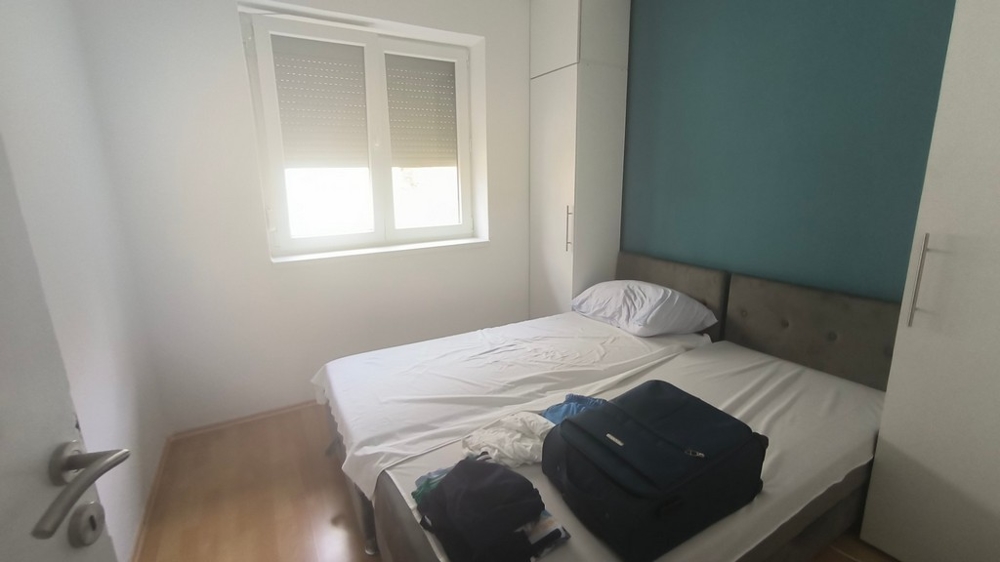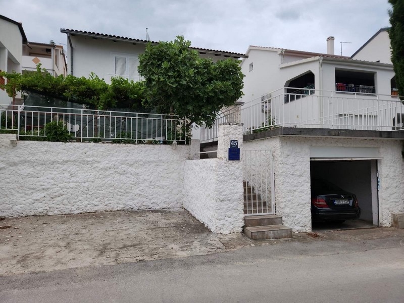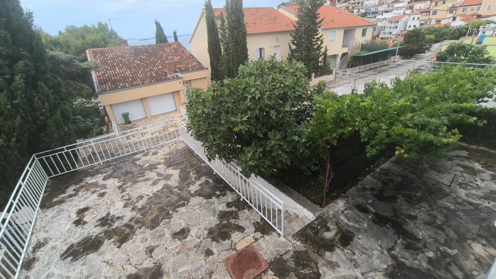 Die Wohnung im ersten Stock hat einen separaten Eingang und bietet zwei Schlafzimmer, ein Wohnzimmer mit Küche und Essbereich, ein Badezimmer, einen Balkon und eine Terrasse mit Meerblick.
