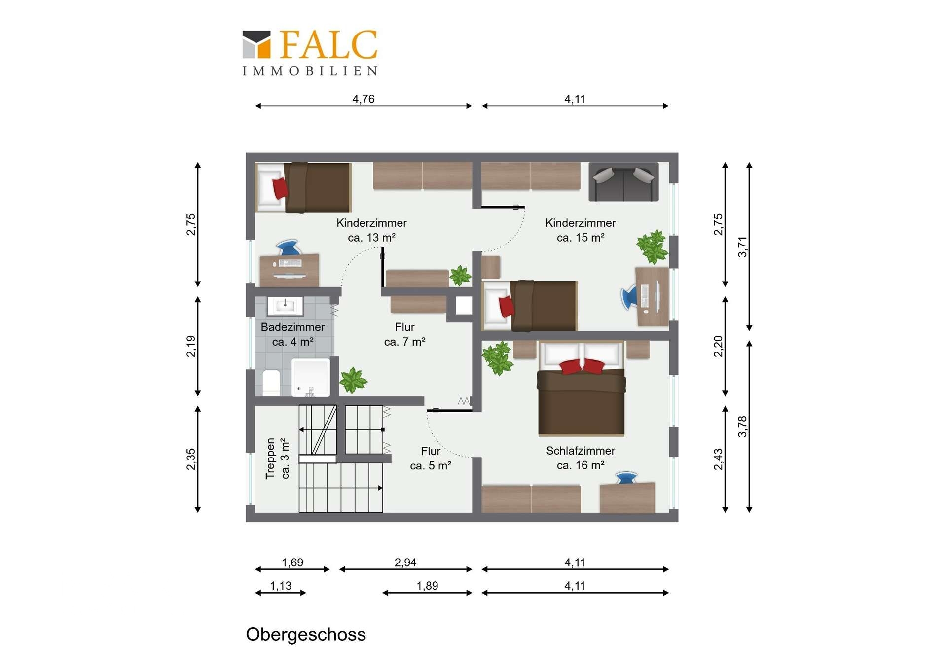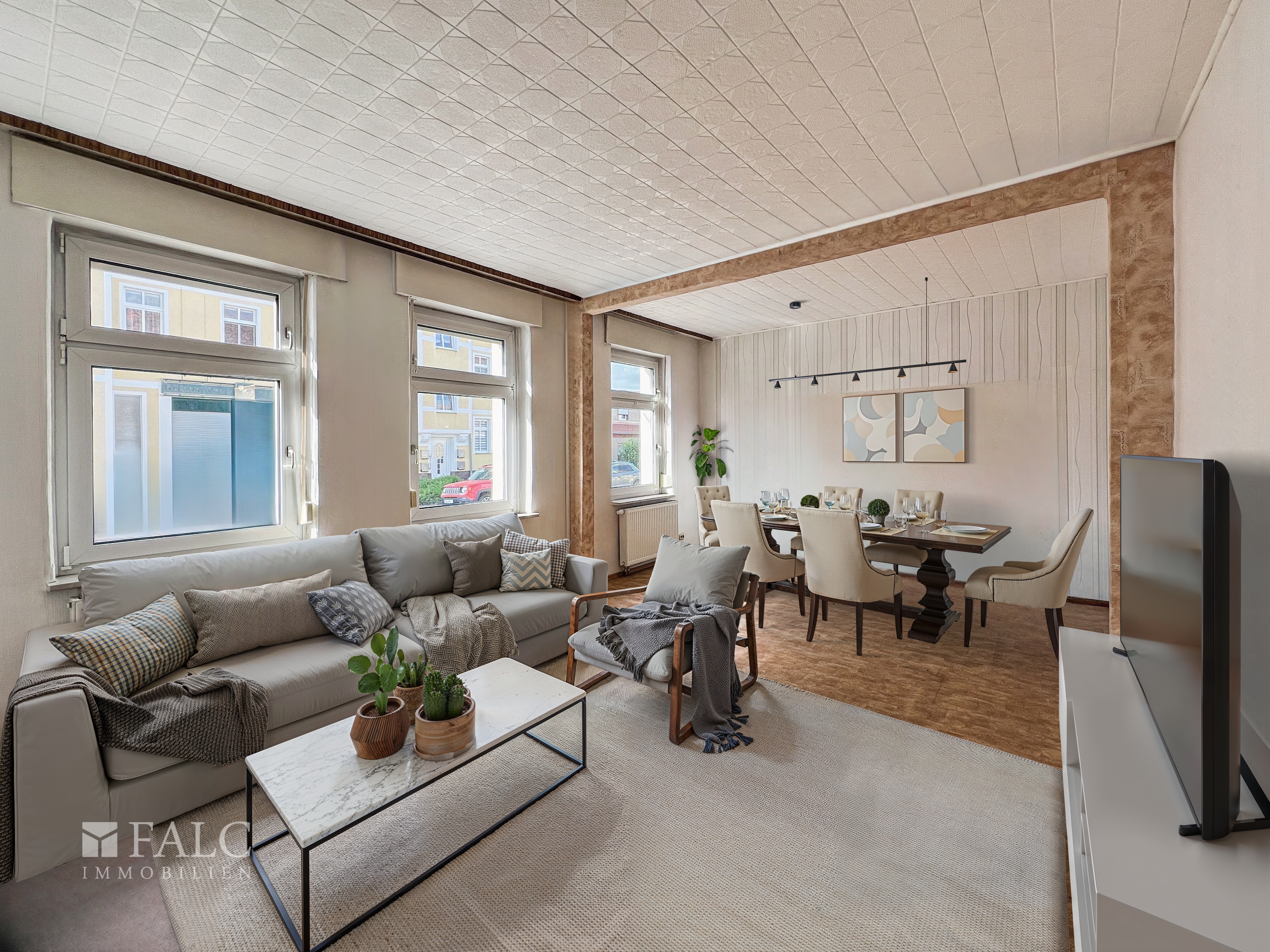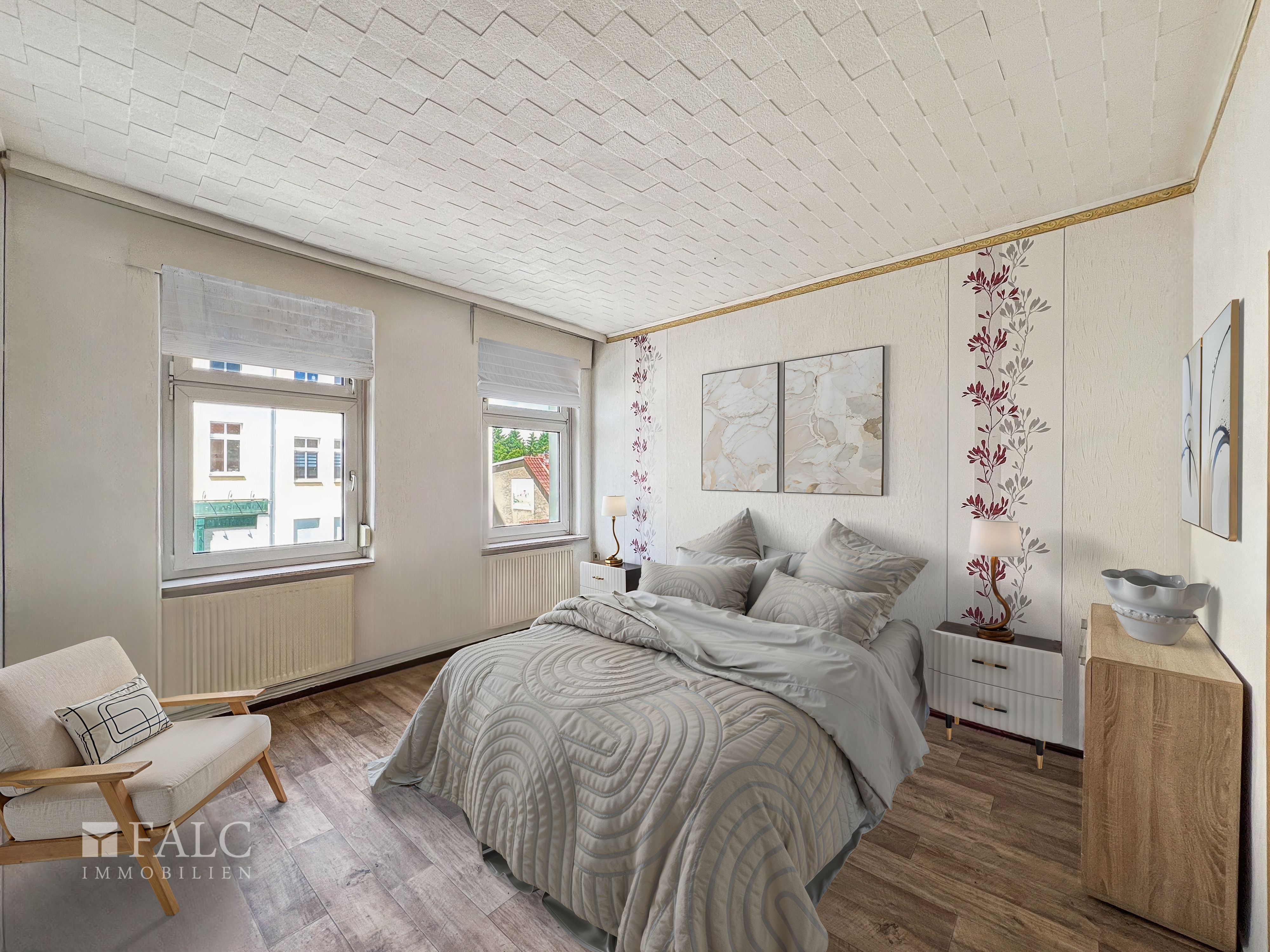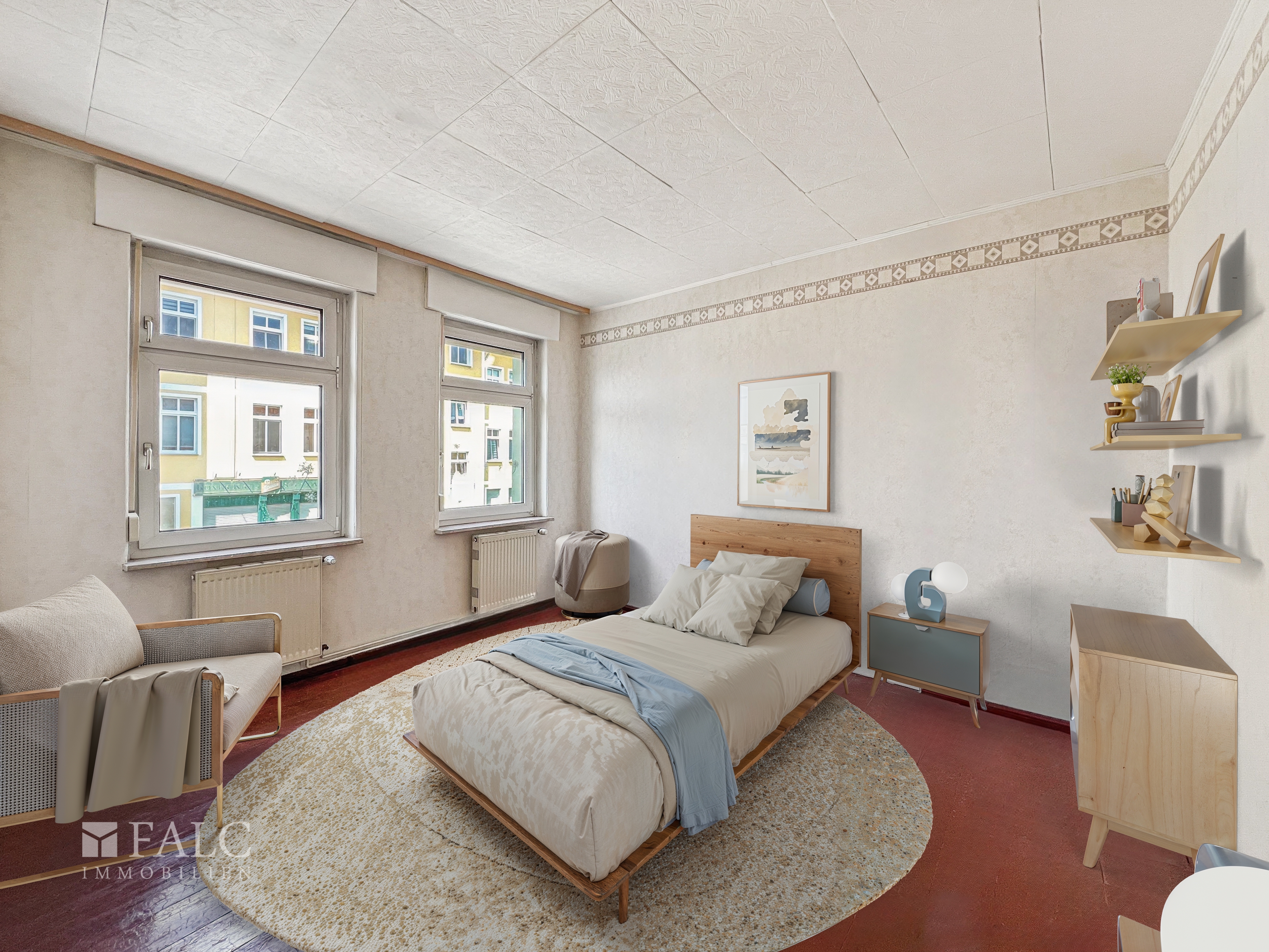 Zur Info. Die Möbel im Wohnzimmer, Schlafzimmer und Kinderzimmer sind digital gestaltet worden. Die Beschaffenheit der Räume ist komplett original belassen.