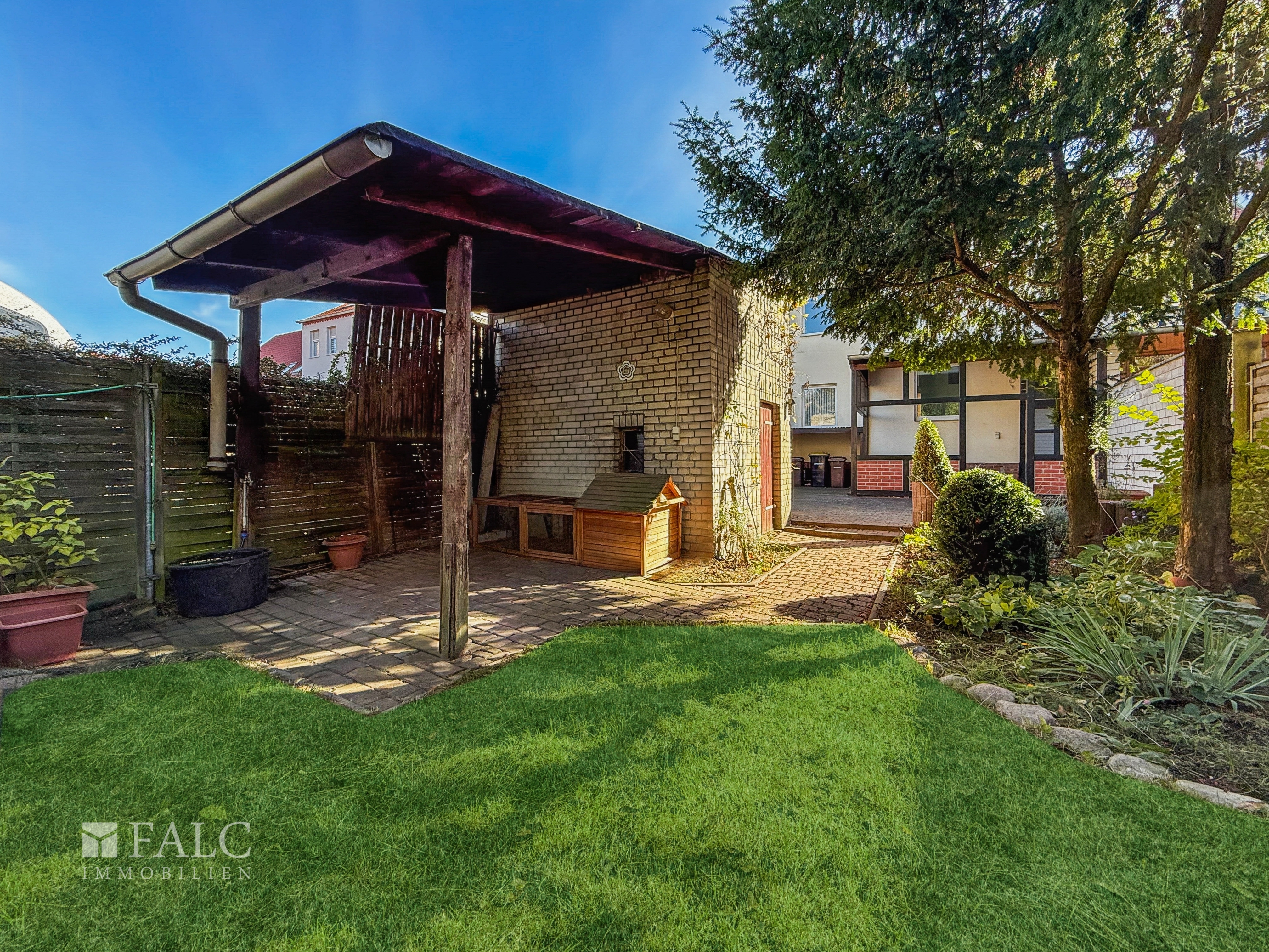 Trotz der Innenstadtlage bietet das Anwesen ein überraschend großes und ruhiges Grundstück, das als echter Rückzugsort dient. Ein besonderes Highlight ist die großzügige, überdachte Terrasse mit traumhaftem Blick auf die St. Jacobikirche. Im Garten befinden sich zudem ein Nebengebäude mit anschließender Überdachung – ideal für Hobby, Lager oder Gartengeräte.