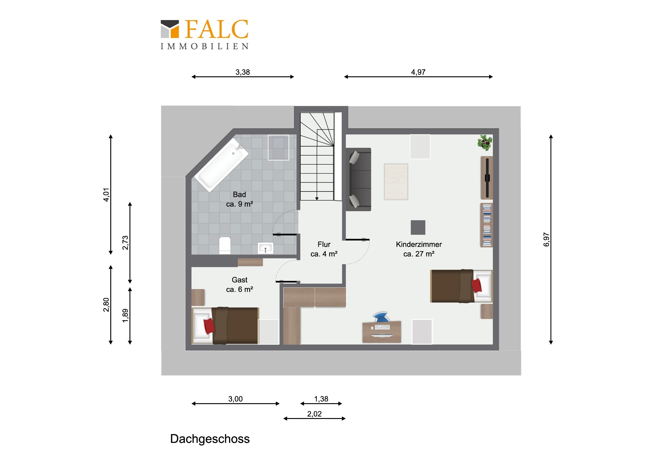 Im Dachgeschoss befinden sich ein kleines Gästezimmer sowie ein weiteres großzügiges Kinderzimmer. Das ca. 27 m² große Zimmer könnte problemlos auch noch einmal geteilt werden. Ein zusätzliches Badezimmer mit Badewanne sorgt hier für Komfort und Flexibilität – ideal für Familien oder Besuch.