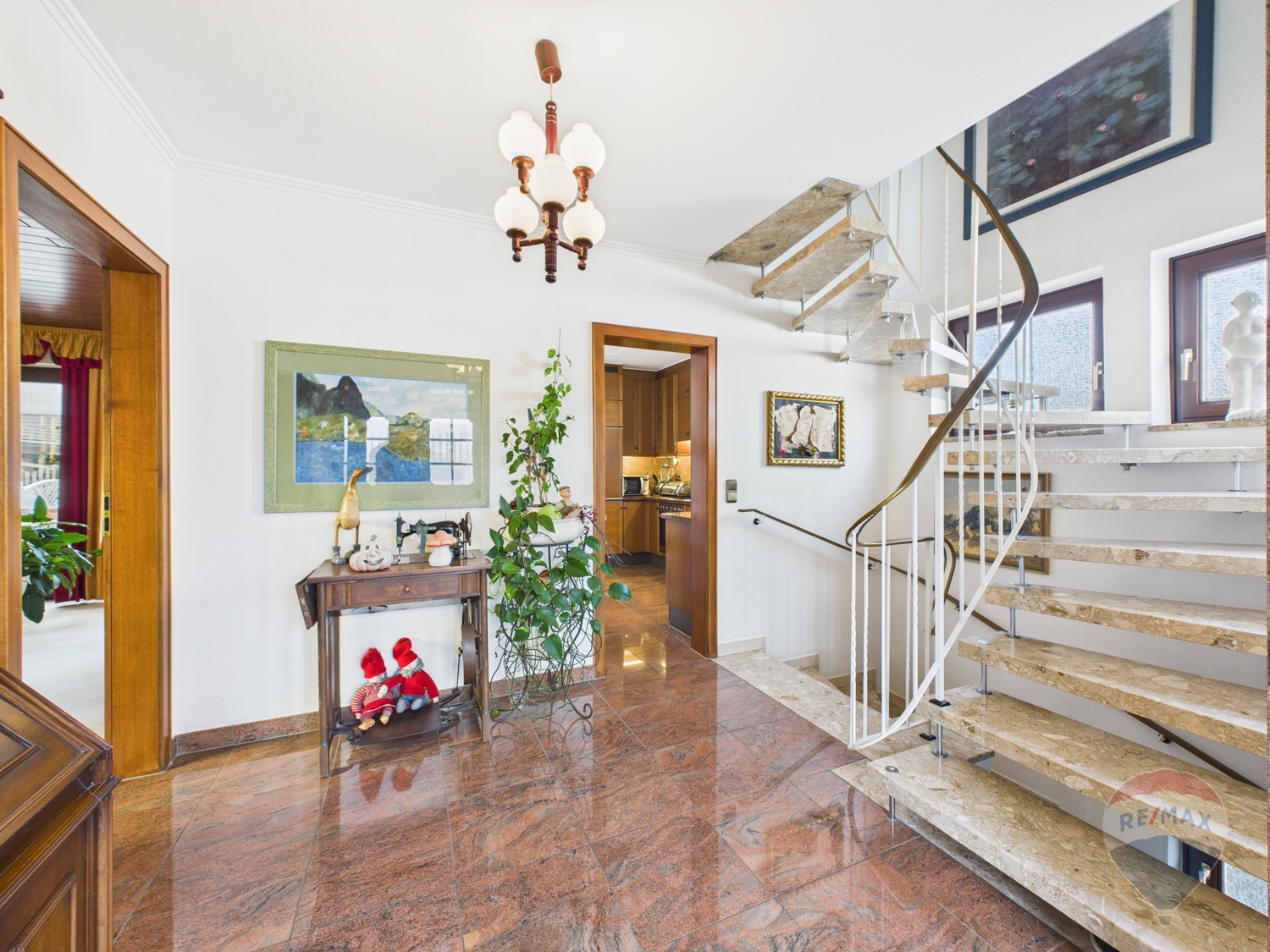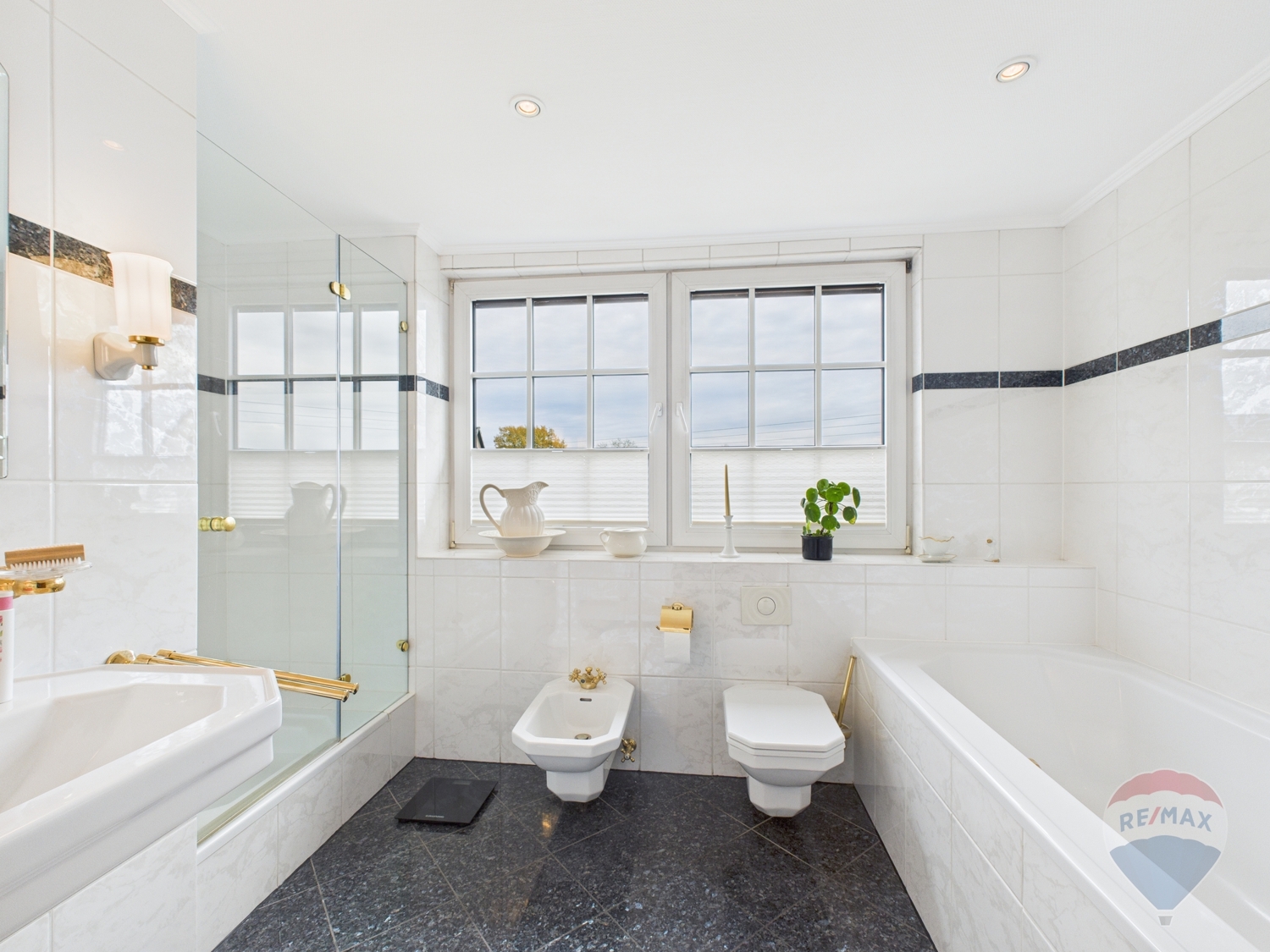 -Hauptbadezimmer im 1.OG (Tageslichtbad im 1930 Stil) mit hochwertiger Armaturen, getrennter Badewanne und Dusche, sowie Boden aus schwarzem Marmor -Gäste-WC im Eingangsbereich vom Erdgeschoss -Zusätzliche Dusche , Waschbecken, sowie Anschlüsse für Trockner und Waschmaschine im Keller -38m² Wohn-Esszimmer mit Zugang zum beheizten Wintergarten inkl. Panoramablick in den Garten -Hochwertiger Granitboden im Erdgeschoss -Einbauküche mit hochwertiger Granitarbeitsplatte inkl. E-Geräte + Zugang zur Terrasse + Durchreiche -Geräumiges Hauptschlafzimmer -Balkon verbindet Schlafzimmer und Ankleidezimmer -Doppelverglaste Fenster teilw. mit Jalousien -Beheizter Wintergarten inkl. Ofen -Überdachte Terrasse (Westausrichtung) -Vollkeller (Raum mit eingebauter Bar beheizbar) -Garage mit separatem Abstellraum für Gartengeräte -Gewendelte Treppe mit hochwertigem beigen Carrara Marmor