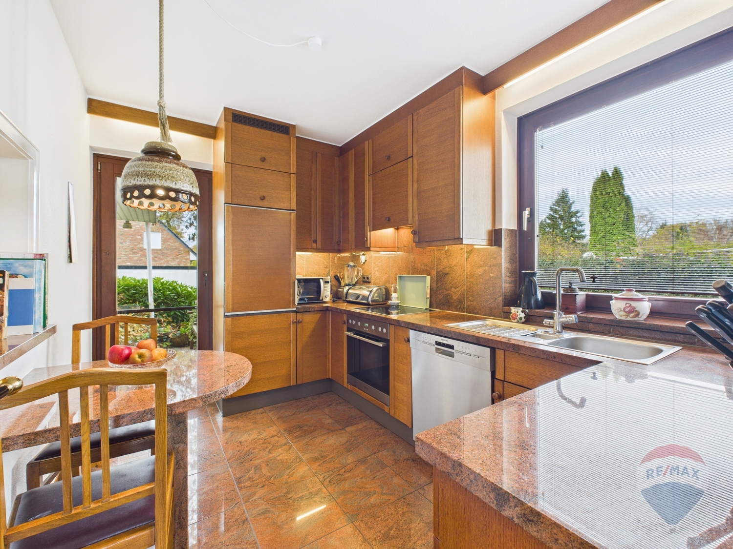 Beim Betreten des Hauses empfängt Sie ein einladender Eingangsbereich mit einem praktischen Gäste-WC. Die gepflegte Einbauküche mit hochwertiger Granitarbeitsplatte und modernen Elektrogeräten bietet direkten Zugang zur überdachten Westterrasse, die zu entspannten Stunden im Freien einlädt. Der angrenzende beheizte Wintergarten mit Ofen erweitert den Wohnraum und sorgt für gemütliche Abende.