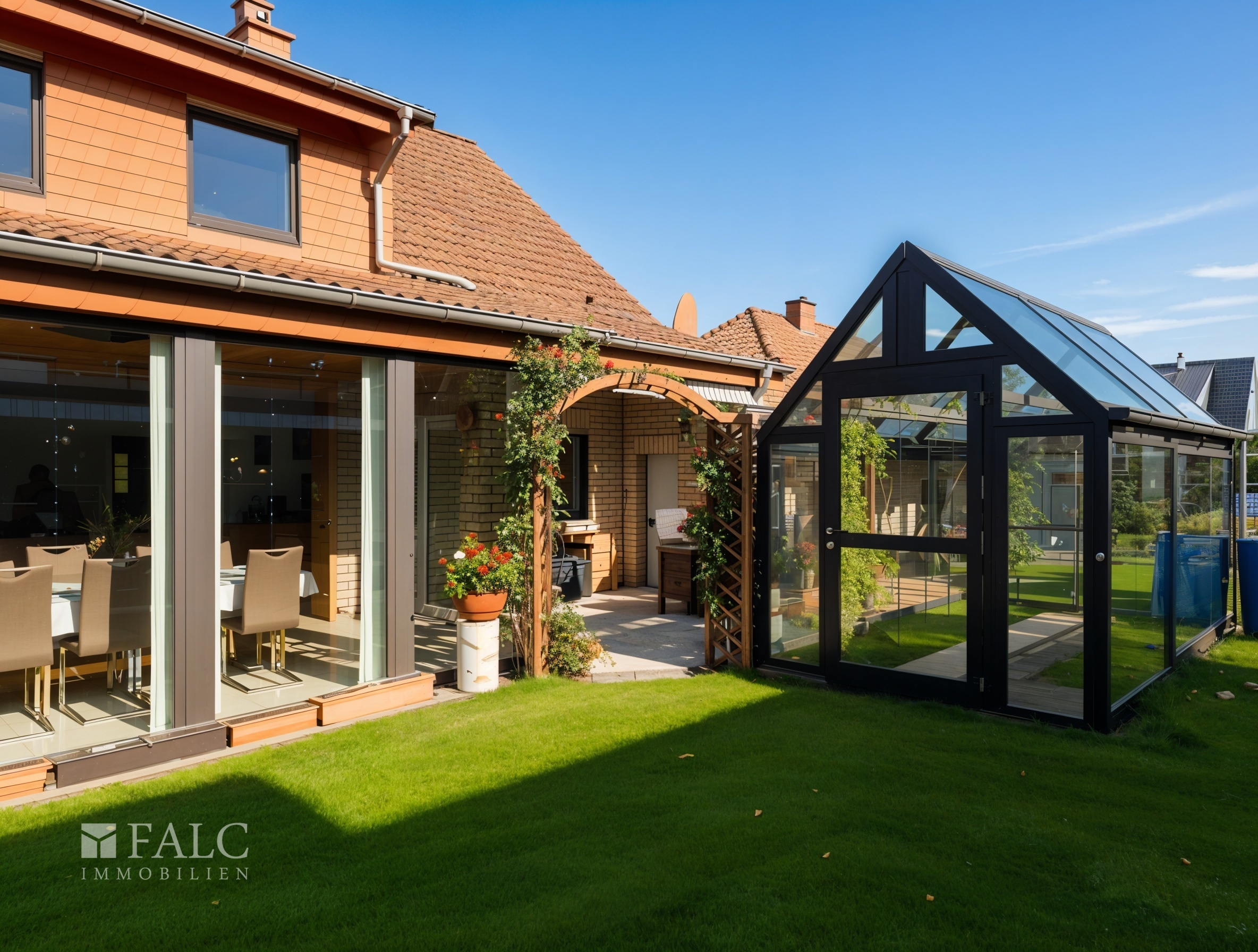 Der Außenbereich besticht durch einen gepflegten Garten mit Terrasse und einem schönen Gewächshaus. Eine Doppelgarage rundet das Angebot ab und bietet ausreichend Platz für Fahrzeuge und Fahrräder.