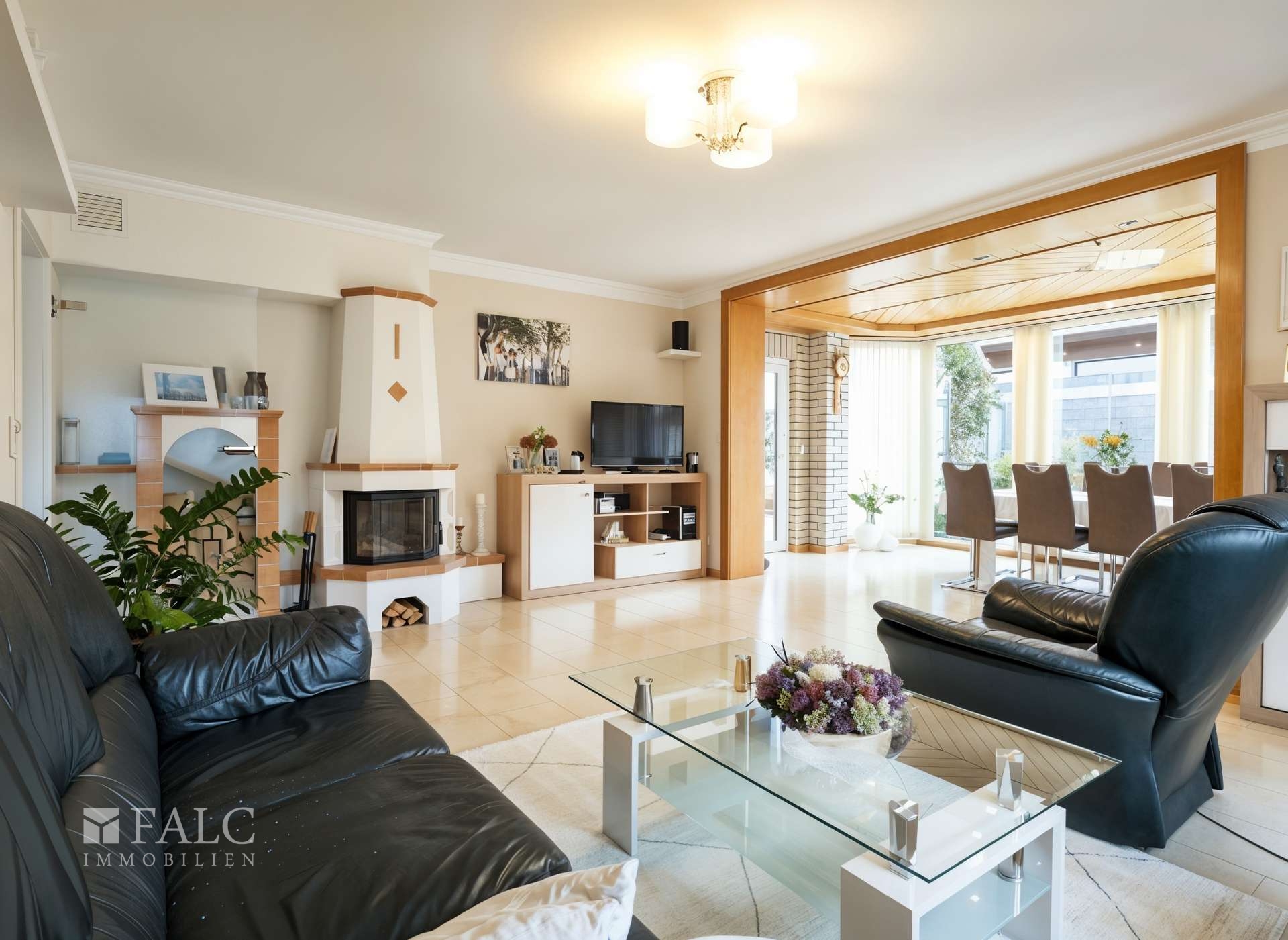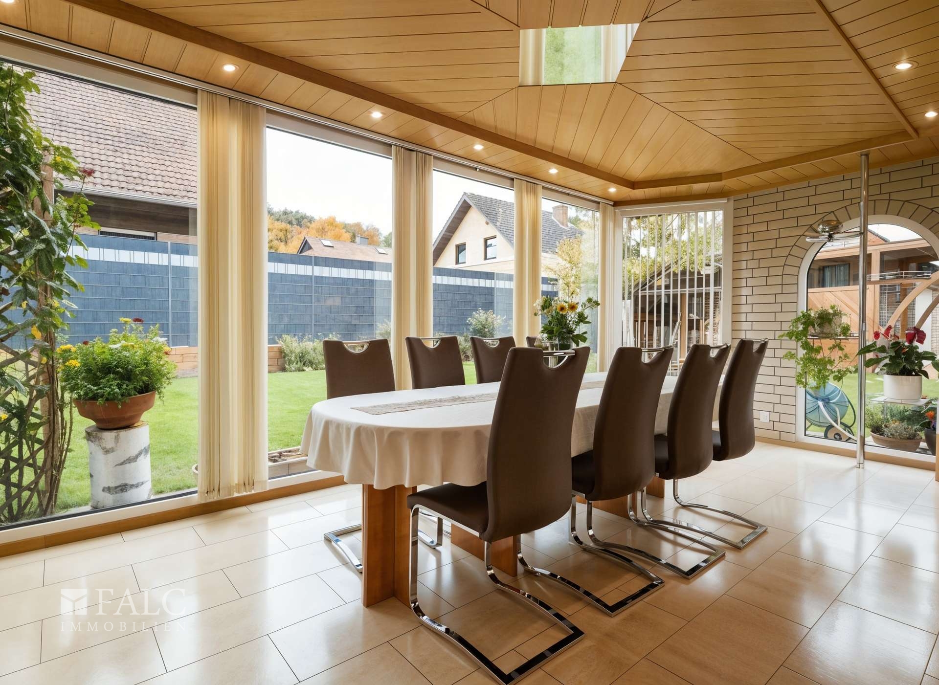 Der Eingangsbereich führt direkt in einen offenen Wohn- und Essbereich, der durch große Fensterfronten viel Tageslicht erhält. Die moderne Küche ist mit hochwertigen Geräten ausgestattet und bietet ausreichend Stauraum. Ein besonderes Highlight ist der Wintergarten, der einen wunderbaren Blick in den gepflegten Garten ermöglicht.